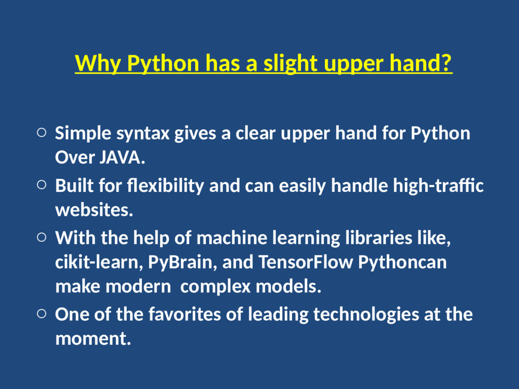 gives a clear upper hand for Python Over JAVA. o Built for flexibility and can easily handle high-traffic websites. o With the help of machine learning libraries like, cikit-learn, PyBrain, and TensorFlow Pythoncan make modern complex models. o One of the favorites of leading technologies at the moment.