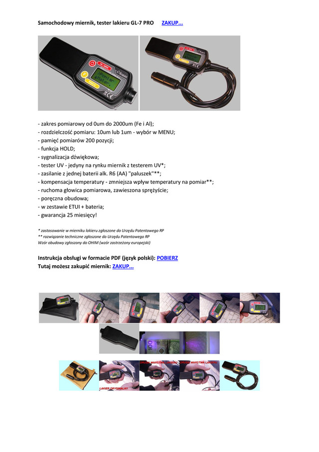 od 0um do 2000um (Fe i Al); - rozdzielczośd pomiaru: 10um lub 1um - wybór w MENU; - pamięd pomiarów 200 pozycji; - funkcja HOLD; - sygnalizacja dźwiękowa; - tester UV - jedyny na rynku miernik z testerem UV*; - zasilanie z jednej baterii alk. R6 (AA) "paluszek"**; - kompensacja temperatury - zmniejsza wpływ temperatury na pomiar**; - ruchoma głowica pomiarowa, zawieszona sprężyście; - poręczna obudowa; - w zestawie ETUI + bateria; - gwarancja 25 miesięcy! * zastosowanie w mierniku lakieru zgłoszone do Urzędu Patentowego RP ** rozwiązanie techniczne zgłoszone do Urzędu Patentowego RP Wzór obudowy zgłoszony do OHIM (wzór zastrzeżony europejski) Instrukcja obsługi w formacie PDF (język polski): POBIERZ Tutaj możesz zakupid miernik: ZAKUP...