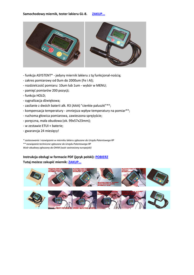 jedyny miernik lakieru z tą funkcjonal-nością; - zakres pomiarowy od 0um do 2000um (Fe i Al); - rozdzielczośd pomiaru: 10um lub 1um - wybór w MENU; - pamięd pomiarów 200 pozycji; - funkcja HOLD; - sygnalizacja dźwiękowa; - zasilanie z dwóch baterii alk. R3 (AAA) "cienkie paluszki"**; - kompensacja temperatury - zmniejsza wpływ temperatury na pomiar**; - ruchoma głowica pomiarowa, zawieszona sprężyście; - poręczna, mała obudowa (ok. 99x57x23mm); - w zestawie ETUI + baterie; - gwarancja 24 miesięcy! * zastosowanie i rozwiązanie w mierniku lakieru zgłoszone do Urzędu Patentowego RP ** rozwiązanie techniczne zgłoszone do Urzędu Patentowego RP Wzór obudowy zgłoszony do OHIM (wzór zastrzeżony europejski) Instrukcja obsługi w formacie PDF (język polski): POBIERZ Tutaj możesz zakupid miernik: ZAKUP...