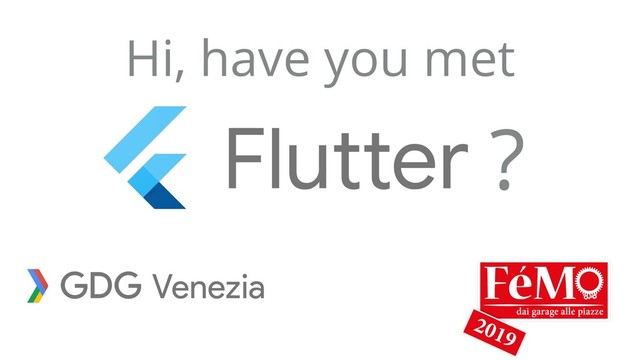 In questo evento impareremo le basi di Flutter attraverso un codelab. Per affrontare il codelab non sono necessarie conoscenze preliminari di Flutter e Dart ma bastera' avere familiarita' con i concetti base della programmazione ad oggetti come variabili, cicli, condizioni, eccetera.