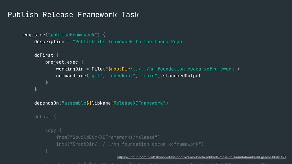 Repo" doFirst { project.exec { workingDir = File("$rootDir/ .. / .. /hn-foundation-cocoa-xcframework") commandLine("git", "checkout", "develop").standardOutput } } dependsOn("assemble${libName}DebugXCFramework") doLast { copy { from("$buildDir/XCFrameworks/debug") into("$rootDir/ .. / .. /hn-foundation-cocoa-xcframework") } .. .. https://github.com/prof18/shared-hn-android-ios-backend/blob/main/hn-foundation/build.gradle.kts#L110 Publish Dev Framework Task