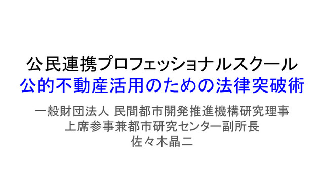 公民連携プロフェッショナルスクール 公的不動産活用のための法律突破術 一般財団法人 民間都市開発推進機構研究理事 上席参事兼都市研究センター副所長 佐々木晶二
