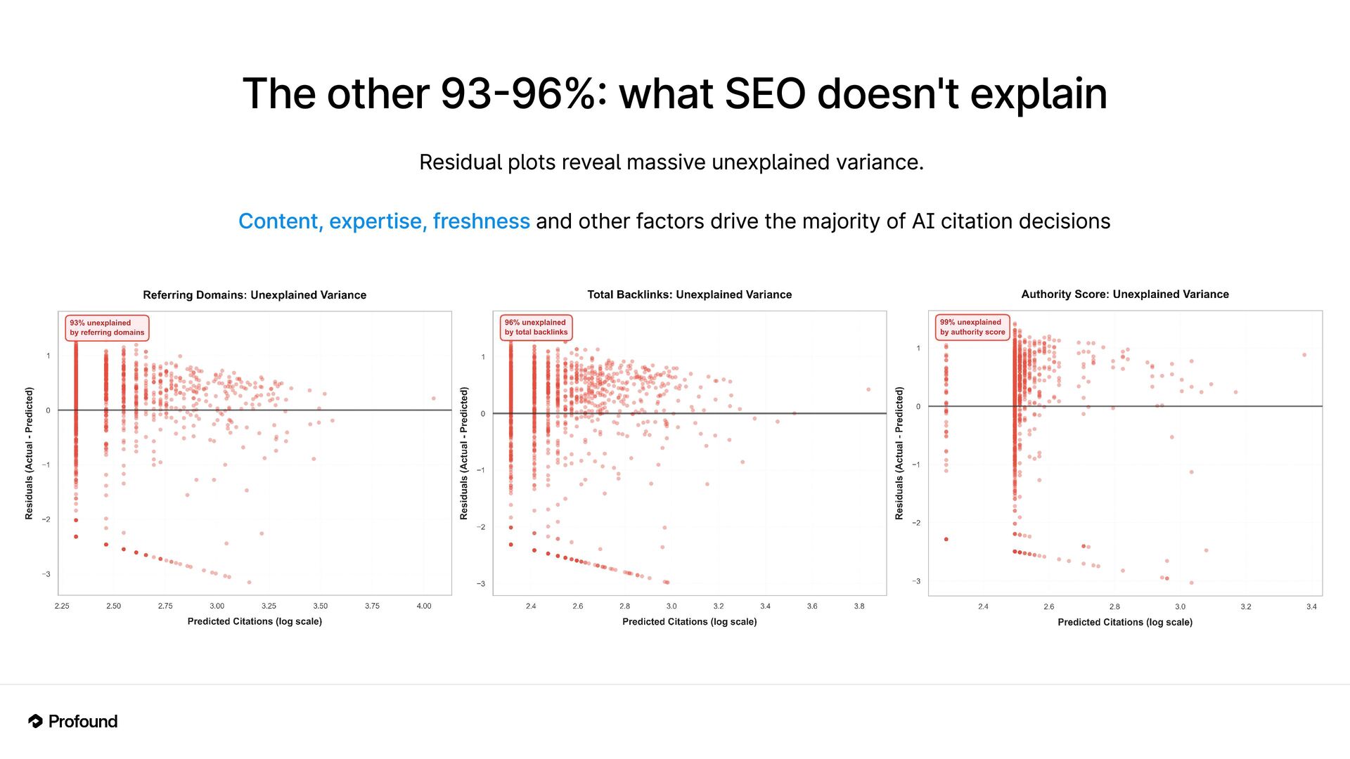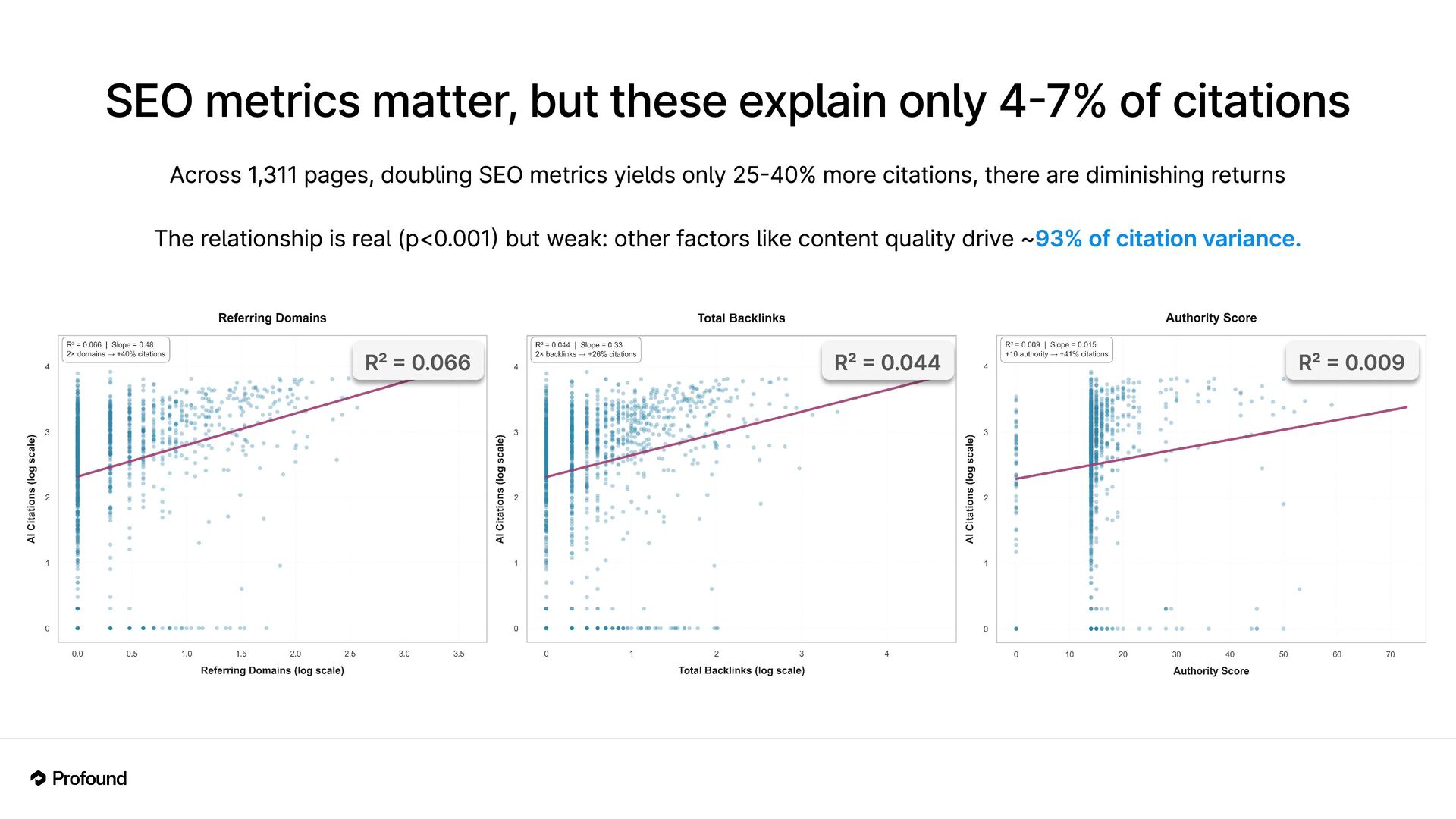 Across 1,311 pages, doubling SEO metrics yields only 25-40% more citations, there are diminishing returns The relationship is real (p<0.001) but weak: other factors like content quality drive ~93% of citation variance.