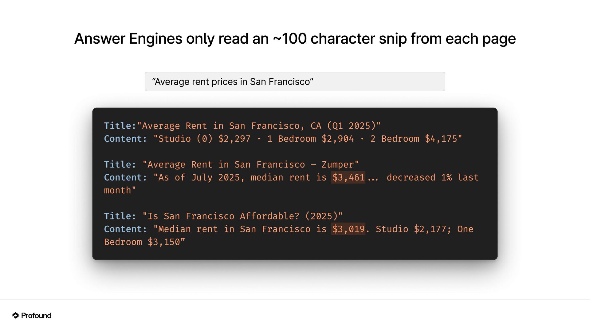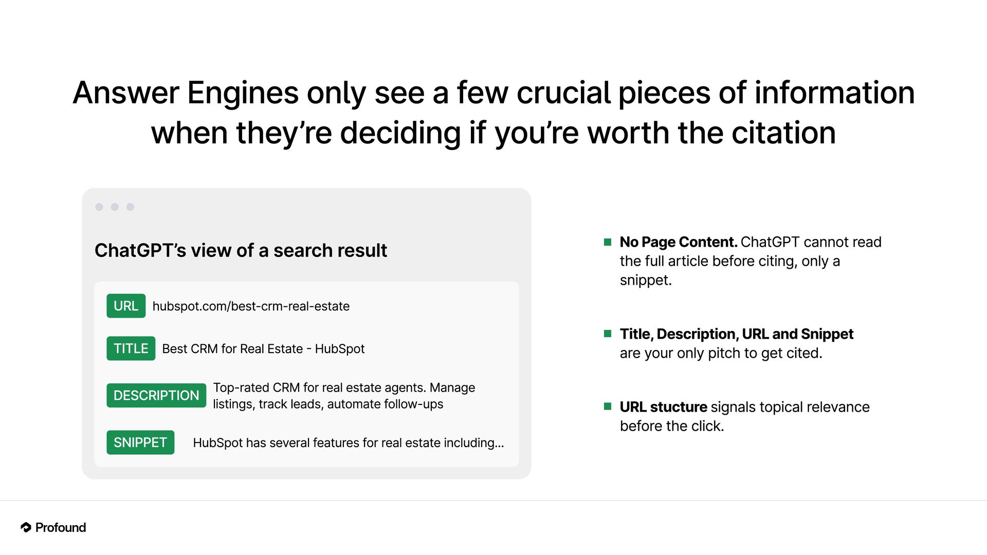 when they’re deciding if you’re worth the citation ChatGPT’s view of a search result URL hubspot.com/best-crm-real-estate TITLE Best CRM for Real Estate - HubSpot DESCRIPTION Top-rated CRM for real estate agents. Manage listings, track leads, automate follow-ups SNIPPET HubSpot has several features for real estate including... No Page Content. ChatGPT cannot read the full article before citing, only a snippet. Title, Description, URL and Snippet are your only pitch to get cited. URL stucture signals topical relevance before the click.