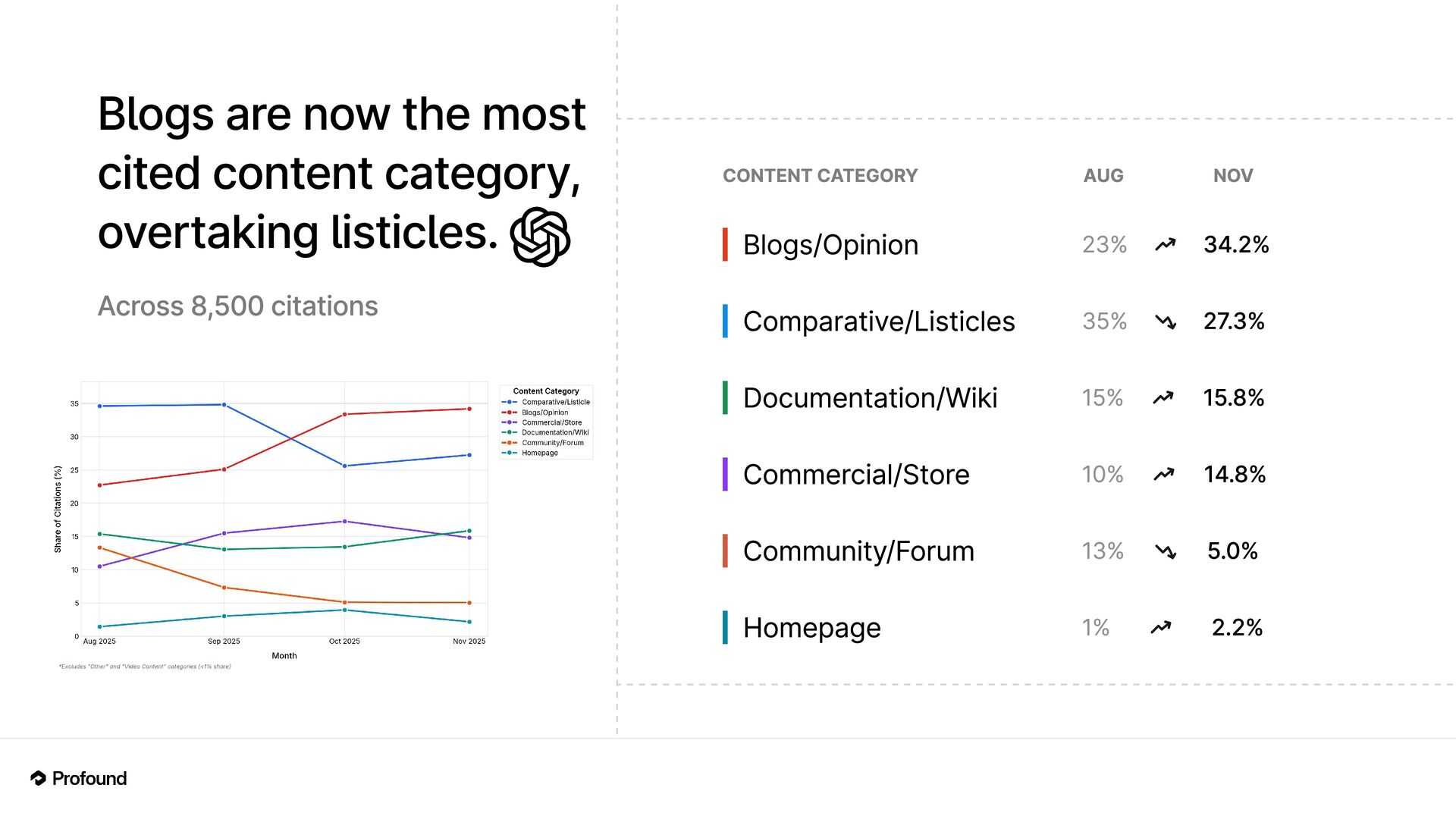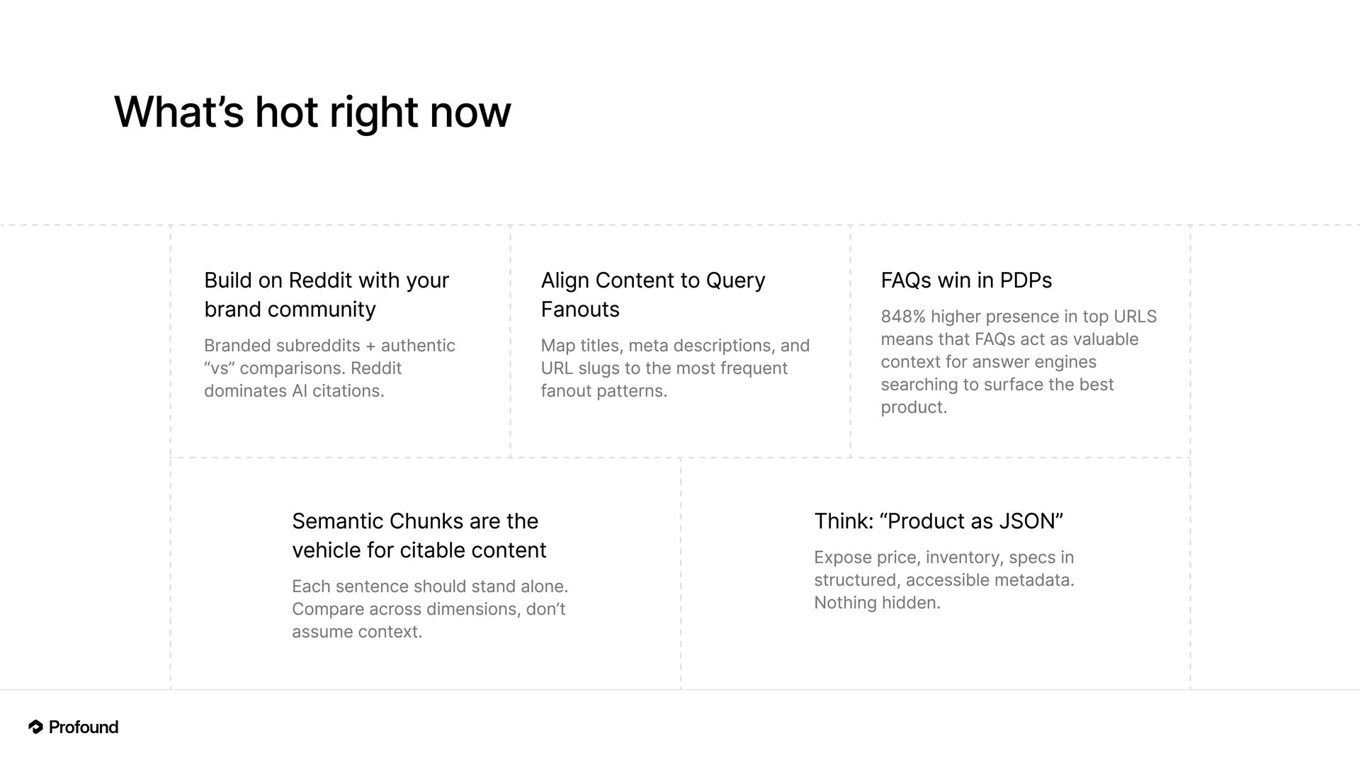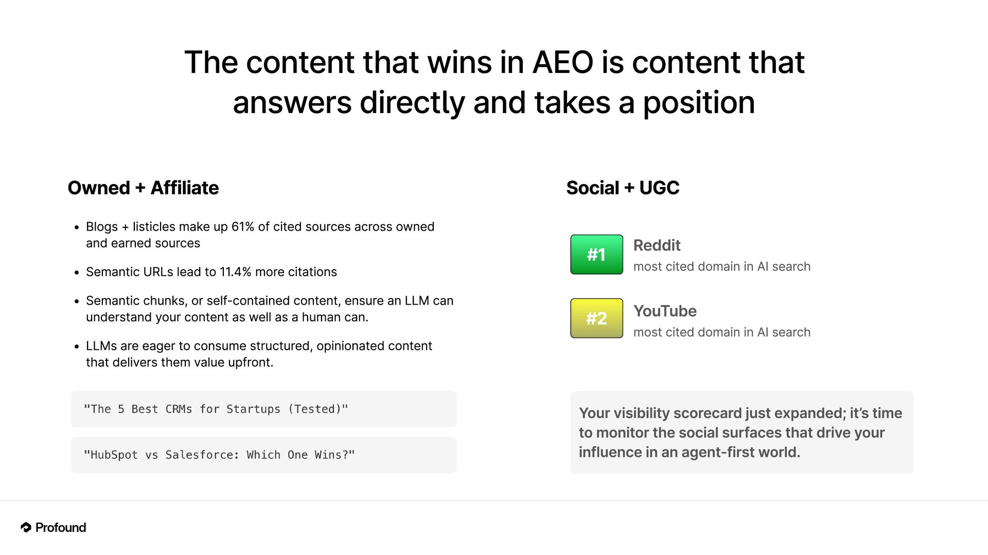 directly and takes a position Social + UGC Blogs + listicles make up 61% of cited sources across owned and earned sources Semantic URLs lead to 11.4% more citations Semantic chunks, or self-contained content, ensure an LLM can understand your content as well as a human can. LLMs are eager to consume structured, opinionated content that delivers them value upfront. Owned + Affiliate #1 #1 #2 #2