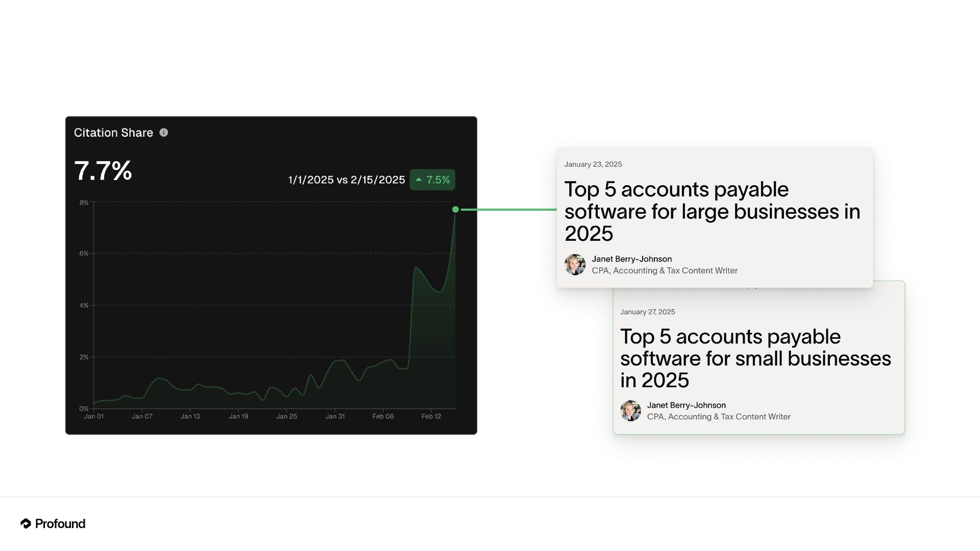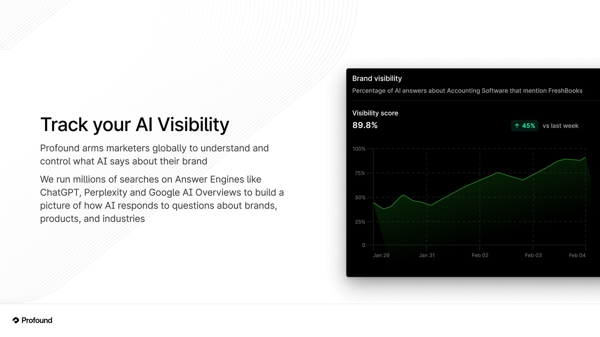 and control what AI says about their brand We run millions of searches on Answer Engines like ChatGPT, Perplexity and Google AI Overviews to build a picture of how AI responds to questions about brands, products, and industries Brand visibility Percentage of AI answers about Accounting Software that mention FreshBooks Jan 29 Feb 04 Feb 03 Feb 02 Jan 31 0 25% 50% 75% 100% 45% vs last week Visibility score 89.8%