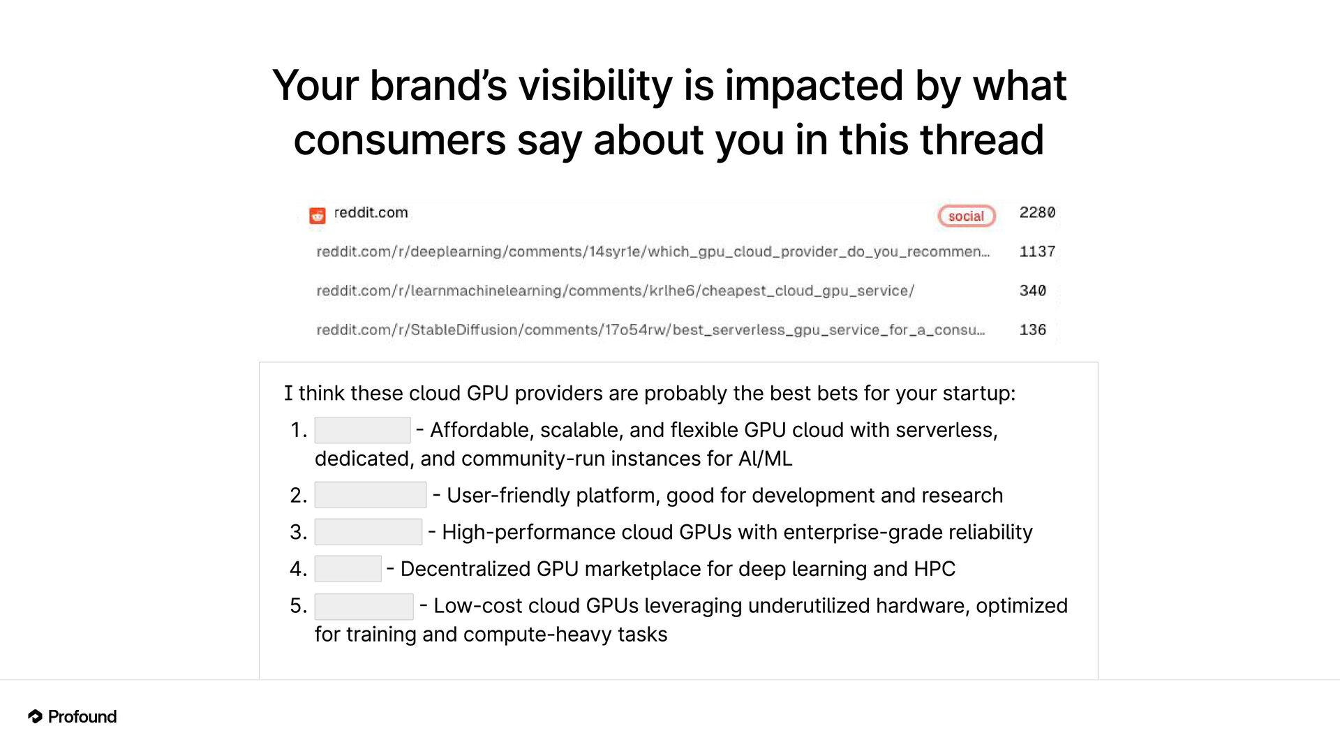 bets for your startup: RunPod.io - Affordable, scalable, and flexible GPU cloud with serverless, dedicated, and community-run instances for Al/ML Paperspace - User-friendly platform, good for development and research CoreWeave - High-performance cloud GPUs with enterprise-grade reliability Vast Al - Decentralized GPU marketplace for deep learning and HPC FluidStack - Low-cost cloud GPUs leveraging underutilized hardware, optimized for training and compute-heavy tasks Your brand’s visibility is impacted by what consumers say about you in this thread