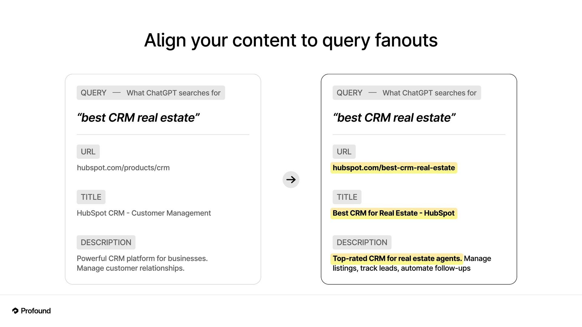 for “best CRM real estate” URL hubspot.com/products/crm TITLE HubSpot CRM - Customer Management DESCRIPTION Powerful CRM platform for businesses. Manage customer relationships. query What ChatGPT searches for “best CRM real estate” URL hubspot.com/best-crm-real-estate TITLE Best CRM for Real Estate - HubSpot DESCRIPTION Top-rated CRM for real estate agents. Manage listings, track leads, automate follow-ups