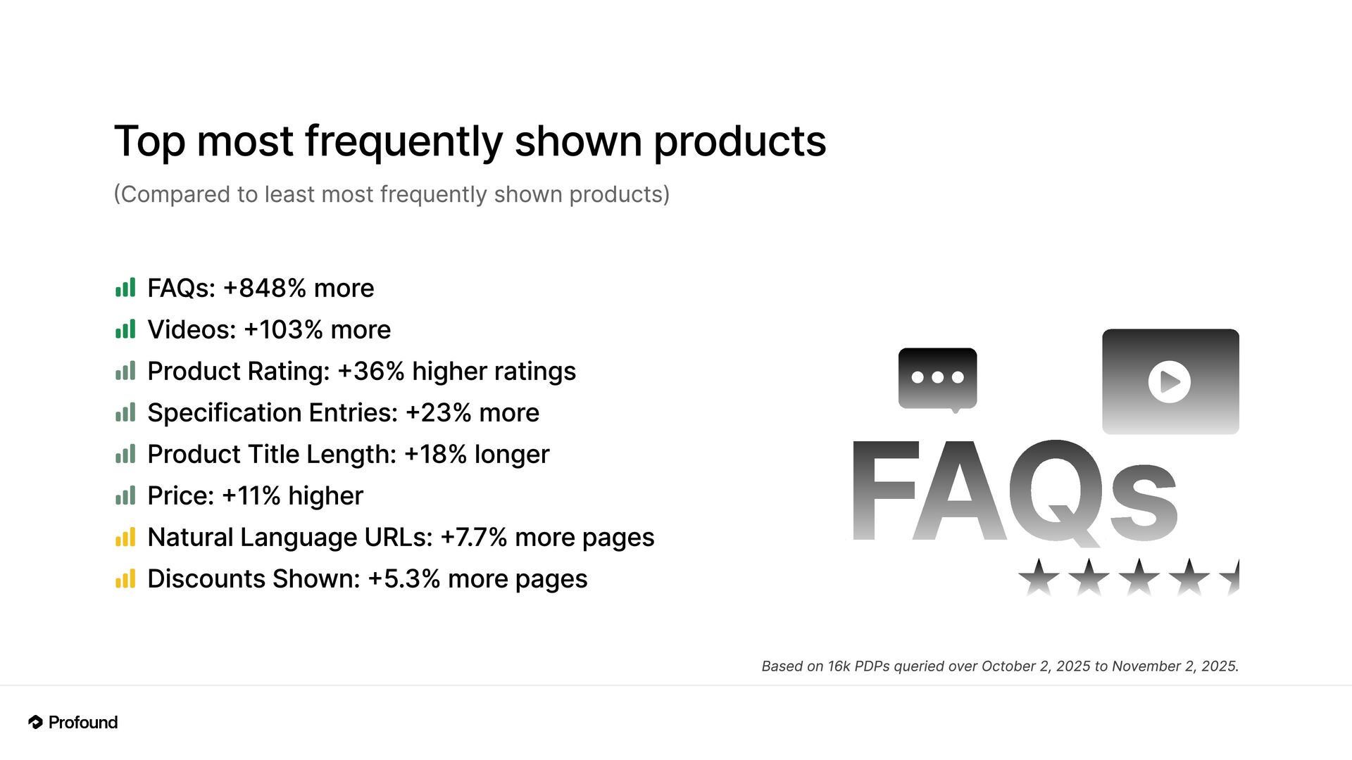 shown products) Based on 16k PDPs queried over October 2, 2025 to November 2, 2025. FAQs: +848% more Videos: +103% more Product Rating: +36% higher ratings Specification Entries: +23% more Product Title Length: +18% longer Price: +11% higher Natural Language URLs: +7.7% more pages Discounts Shown: +5.3% more pages FAQs