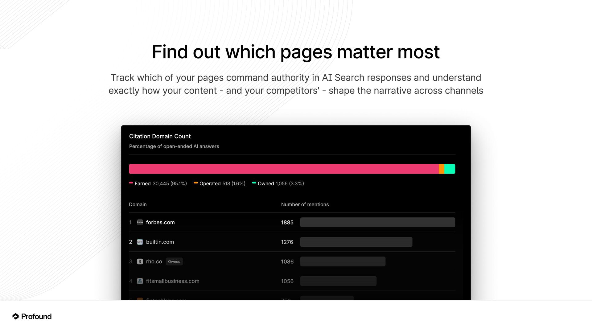 pages command authority in AI Search responses and understand exactly how your content - and your competitors' - shape the narrative across channels Earned 30,445 (95.1%) Operated 518 (1.6%) Owned 1,056 (3.3%) Domain Number of mentions 1 forbes.com 1885 2 builtin.com 1276 3 rho.co Owned 1086 4 fitsmallbusiness.com 1056 5 fintechlabs.com 750 6 Bill 72.3% Citation Domain Count Percentage of open-ended AI answers