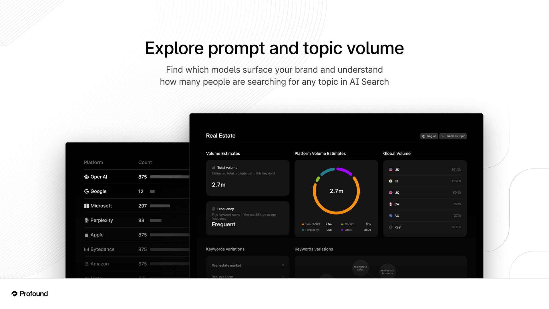 brand and understand how many people are searching for any topic in AI Search Platform Count Last indexed Change Pages OpenAI 18 minutes ago 243 33 875 Google 12 5 days ago 7 26 Microsoft 297 1 hour ago 24 23 Perplexity 98 2 hours ago 20 20 Apple 875 18 minutes ago 1 9 Bytedance 875 18 minutes ago 1 7 Amazon 875 18 minutes ago 24 23 Meta 875 18 minutes ago 2 2 DeepSeek 875 18 minutes ago 1 23 Region Track as topic Real Estate Volume Estimates Total volume Estimated total prompts using this keyword 2.7m Frequency This keyword ranks in the top 28% by usage frequency Frequent Platform Volume Estimates 2.7m SearchGPT 2.1m Perplexity 90k Copilot 60k Other 480k Global Volume US 201.0k IN 110.0k UK 60.5k CA 27.1k AU 27.1k Rest 148.6k Keywords variations Real estate market 9 Real property 4 Real estate business 8 Real estate investment 16 Keywords variations real estate agency real estate business real estate sales real estate broker real estate company real estate agent real estate agent real estate industry