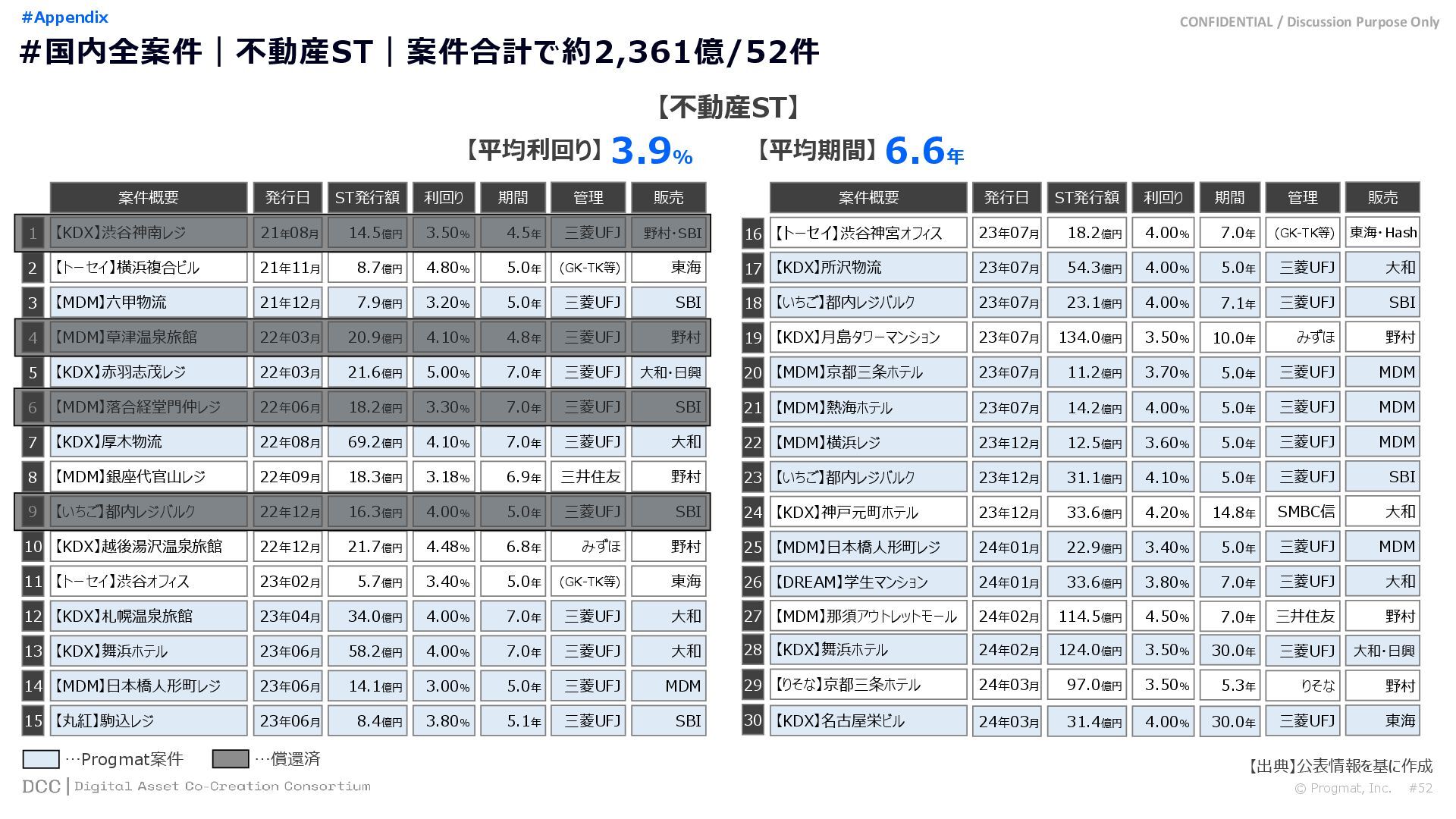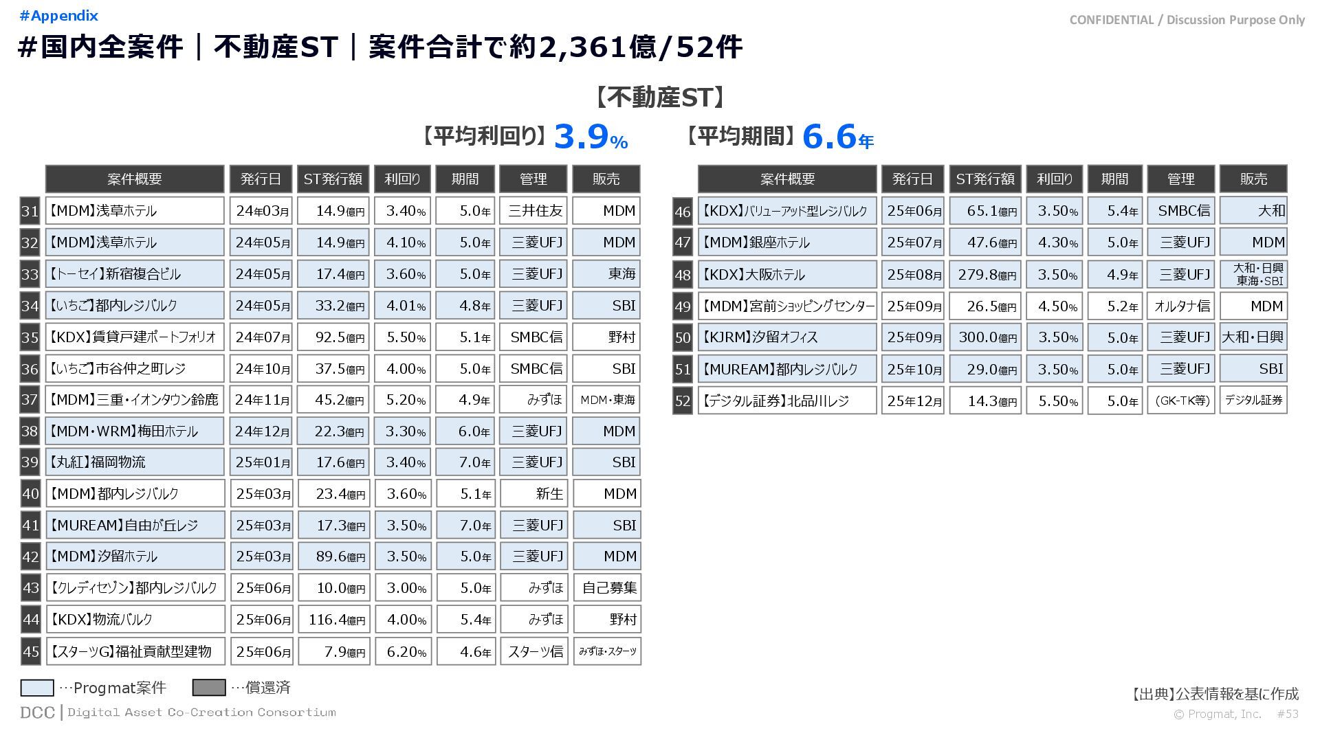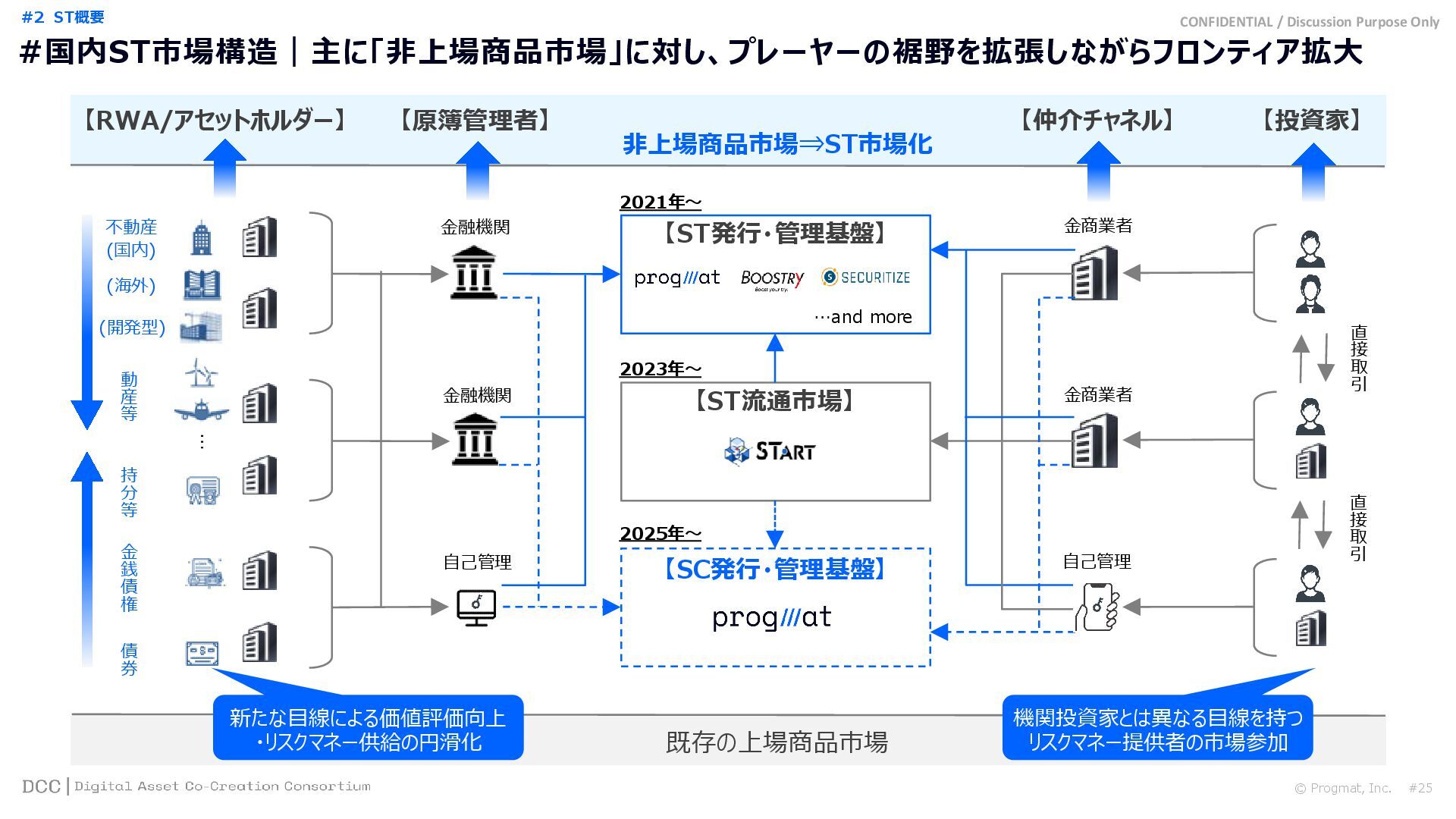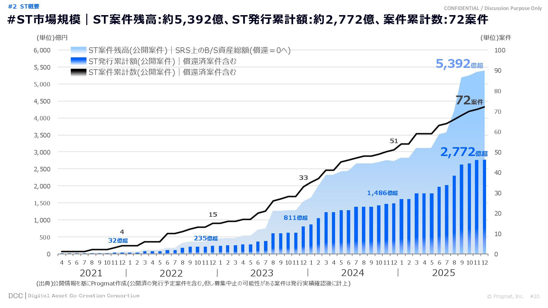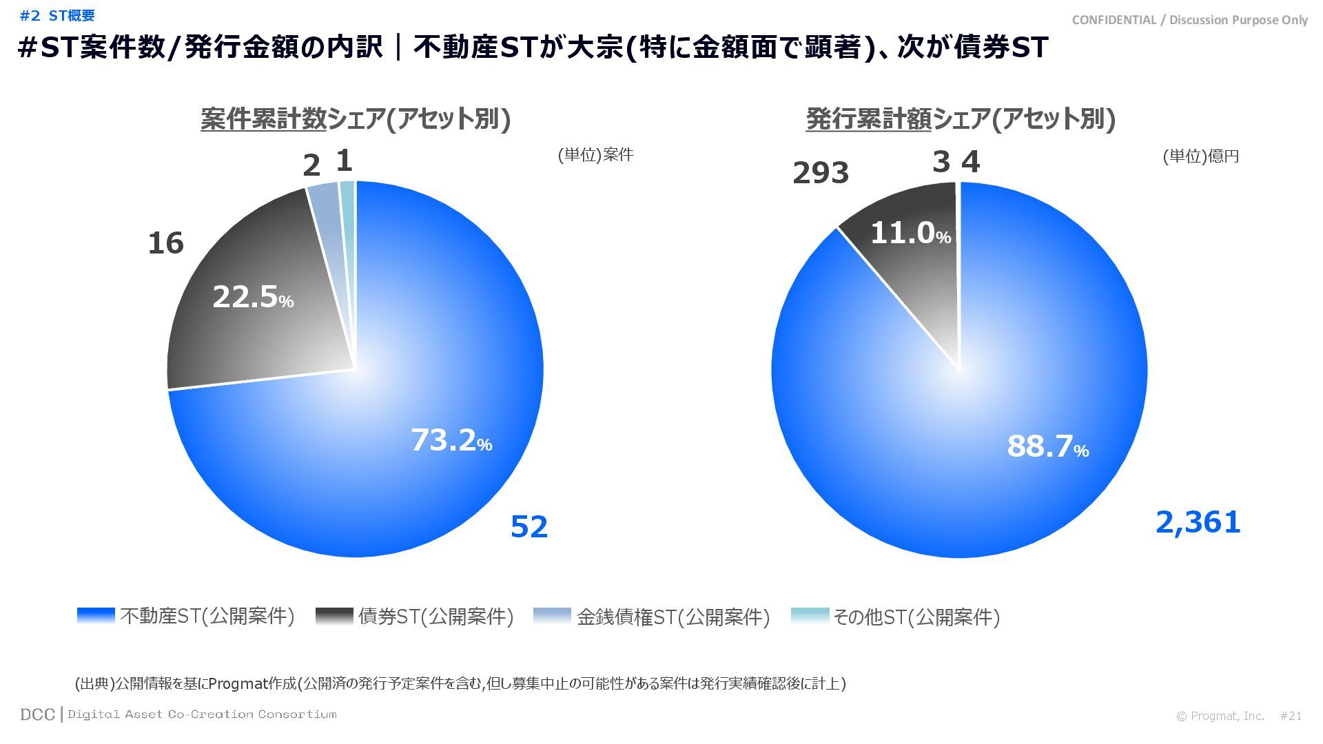 15 33 51 0 10 20 30 40 50 60 70 80 90 100 0 500 1,000 1,500 2,000 2,500 3,000 3,500 4,000 4,500 5,000 5,500 6,000 4 5 6 7 8 9 101112 1 2 3 4 5 6 7 8 9 101112 1 2 3 4 5 6 7 8 9 101112 1 2 3 4 5 6 7 8 9 101112 1 2 3 4 5 6 7 8 9 101112 2021 2022 (単位)億円 2023 ST案件残高(公開案件)|SRS上のB/S資産総額(償還=0へ) ST発行累計額(公開案件)|償還済案件含む ST案件累計数(公開案件)|償還済案件含む (出典)公開情報を基にProgmat作成(公開済の発行予定案件を含む,但し募集中止の可能性がある案件は発行実績確認後に計上) 2024 (単位)案件 2025 2,772億超 72案件 5,392億超 #20 © Progmat, Inc. #2 ST概要 #ST市場規模|ST案件残高:約5,392億、ST発行累計額:約2,772億、案件累計数:72案件