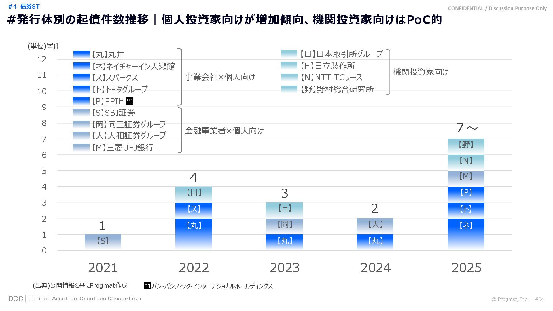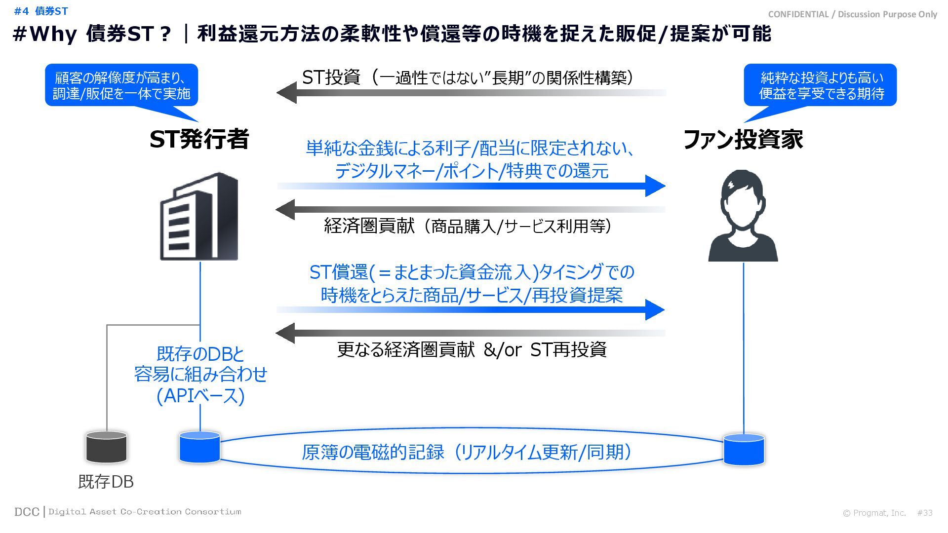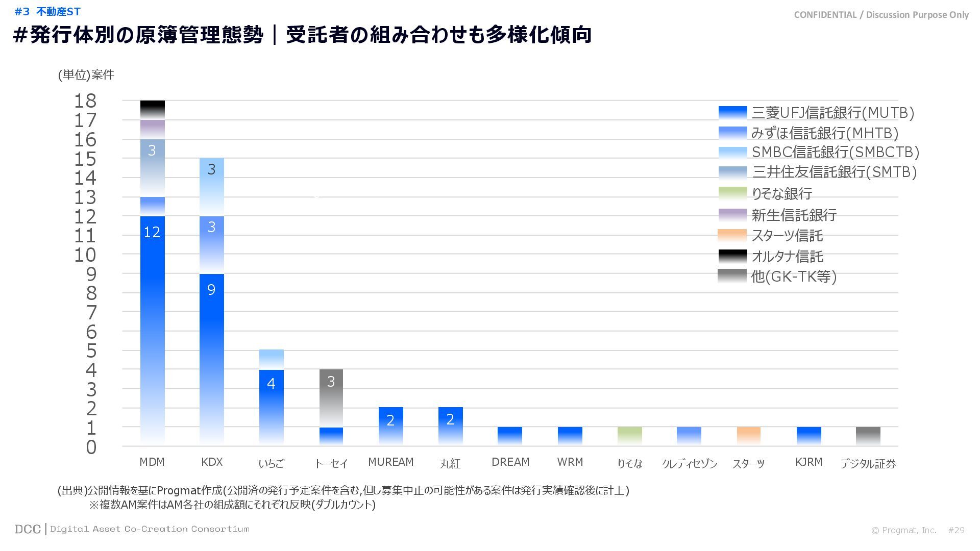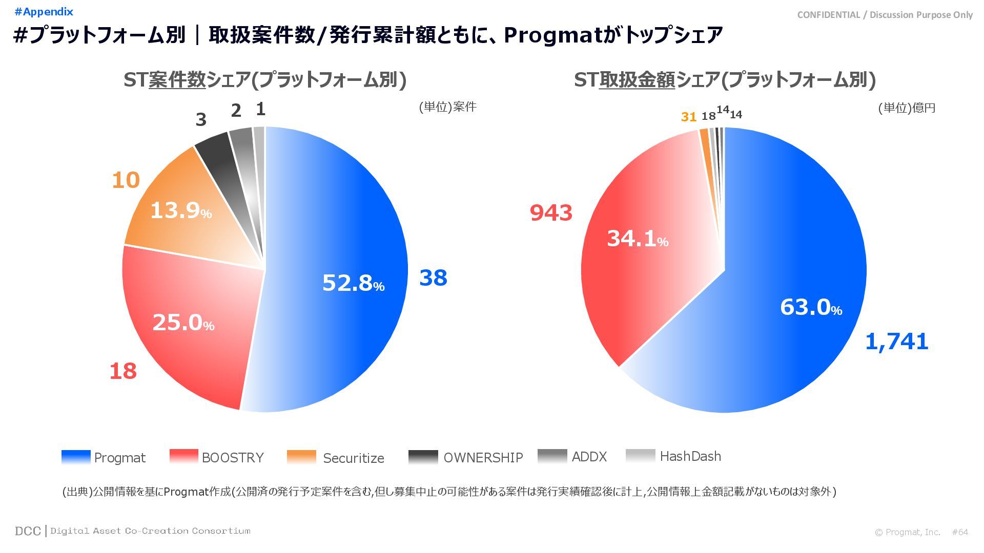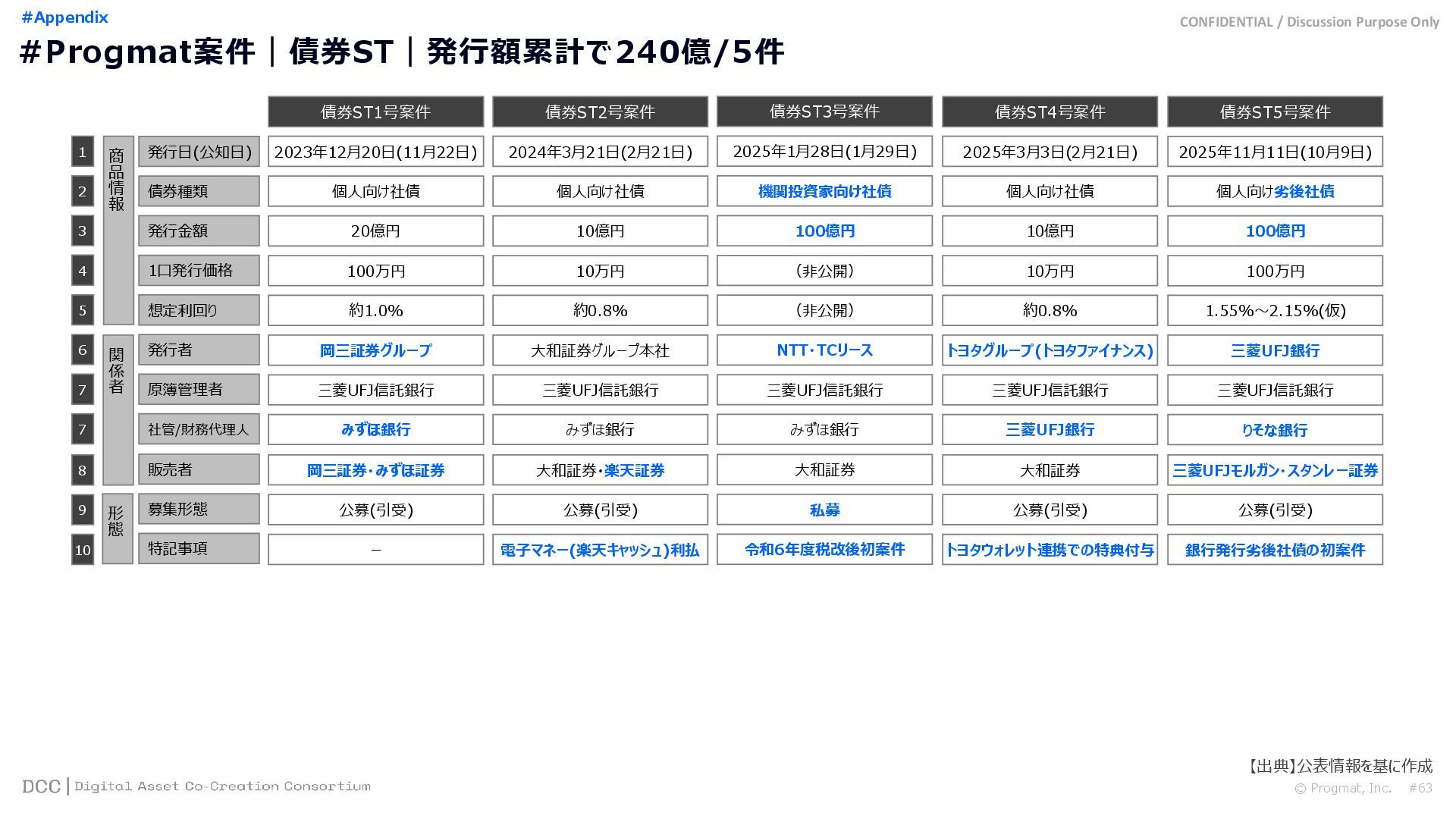 15 33 51 0 10 20 30 40 50 60 70 80 90 100 0 500 1,000 1,500 2,000 2,500 3,000 3,500 4,000 4,500 5,000 5,500 6,000 4 5 6 7 8 9 101112 1 2 3 4 5 6 7 8 9 101112 1 2 3 4 5 6 7 8 9 101112 1 2 3 4 5 6 7 8 9 101112 1 2 3 4 5 6 7 8 9 101112 2021 2022 (単位)億円 2023 ST案件残高(公開案件)|SRS上のB/S資産総額(償還=0へ) ST発行累計額(公開案件)|償還済案件含む ST案件累計数(公開案件)|償還済案件含む (出典)公開情報を基にProgmat作成(公開済の発行予定案件を含む,但し募集中止の可能性がある案件は発行実績確認後に計上) 2024 (単位)案件 2025 2,772億超 72案件 5,392億超 #20 © Progmat, Inc. #2 ST概要 #ST市場規模|ST案件残高:約5,392億、ST発行累計額:約2,772億、案件累計数:72案件
