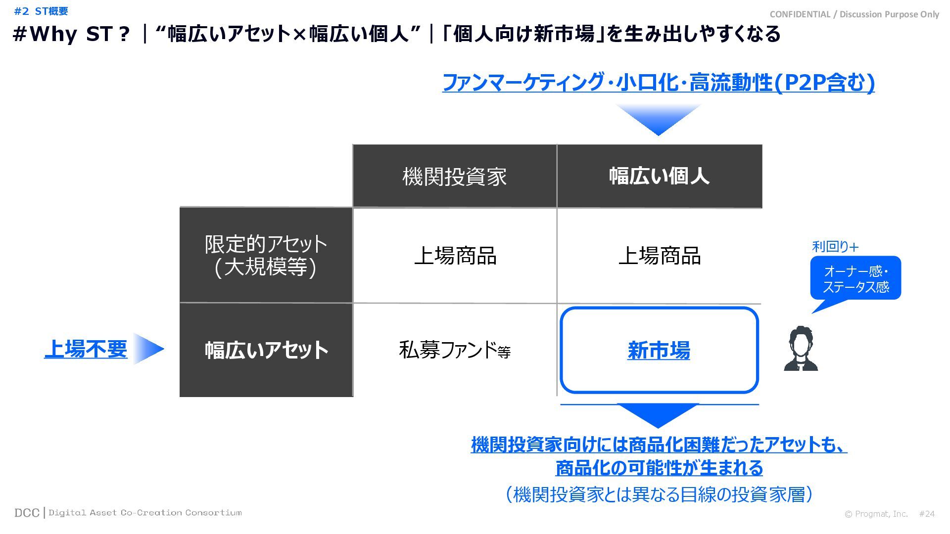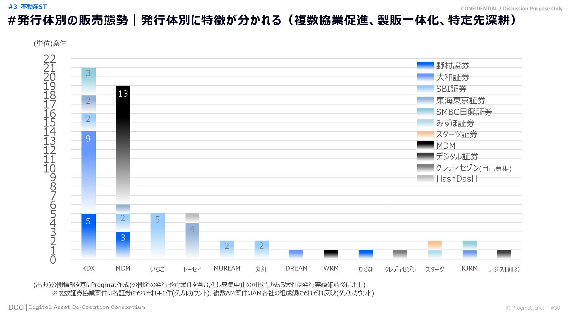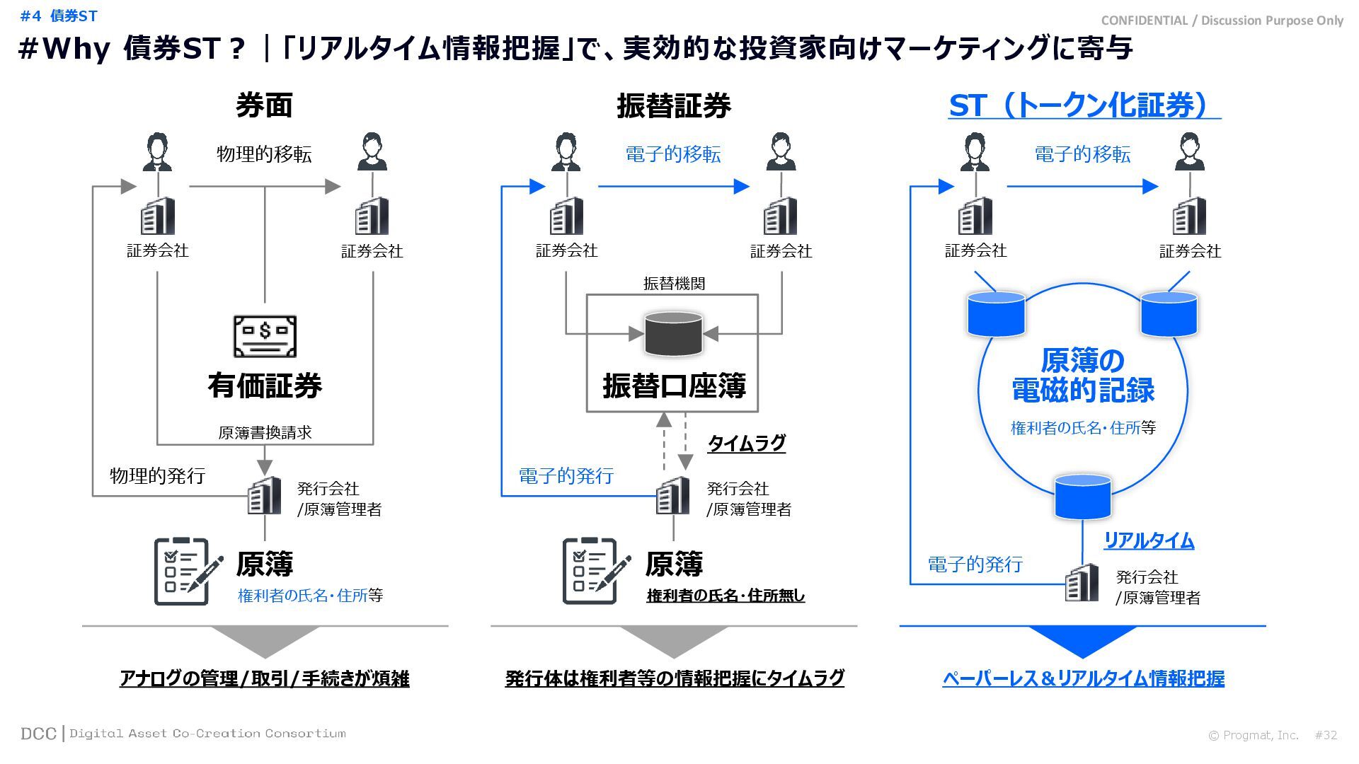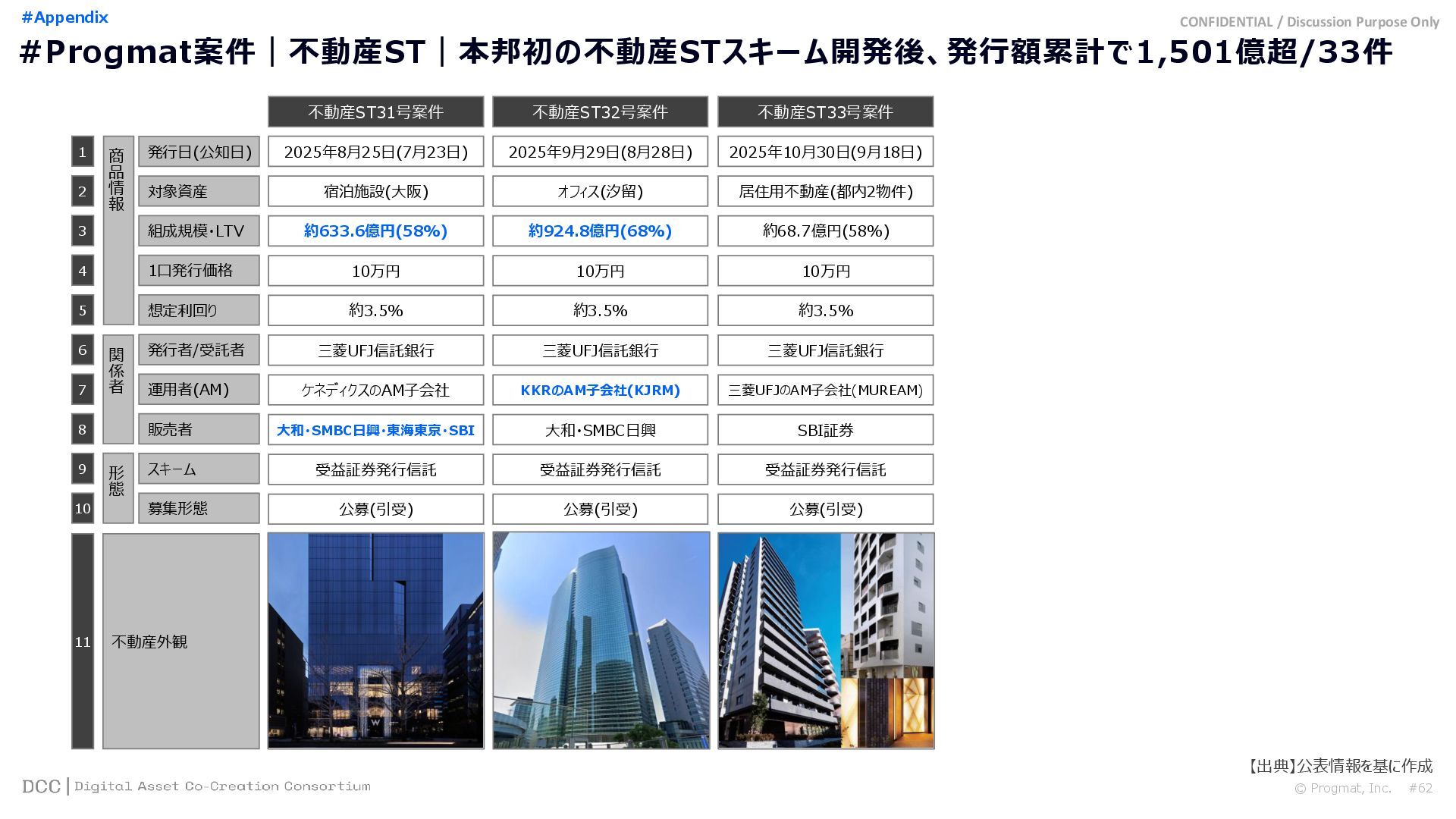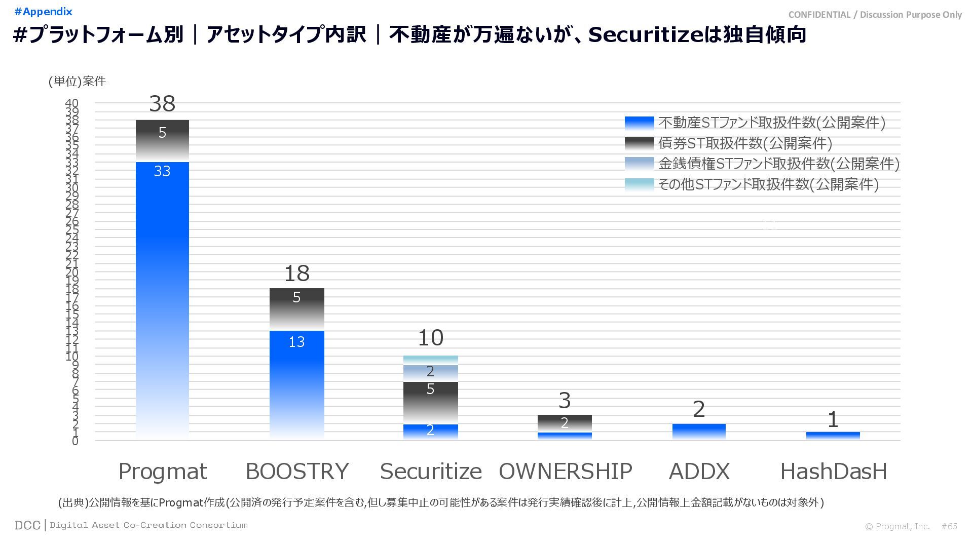 15 33 51 0 10 20 30 40 50 60 70 80 90 100 0 500 1,000 1,500 2,000 2,500 3,000 3,500 4,000 4,500 5,000 5,500 6,000 4 5 6 7 8 9 101112 1 2 3 4 5 6 7 8 9 101112 1 2 3 4 5 6 7 8 9 101112 1 2 3 4 5 6 7 8 9 101112 1 2 3 4 5 6 7 8 9 101112 2021 2022 (単位)億円 2023 ST案件残高(公開案件)|SRS上のB/S資産総額(償還=0へ) ST発行累計額(公開案件)|償還済案件含む ST案件累計数(公開案件)|償還済案件含む (出典)公開情報を基にProgmat作成(公開済の発行予定案件を含む,但し募集中止の可能性がある案件は発行実績確認後に計上) 2024 (単位)案件 2025 2,772億超 72案件 5,392億超 #20 © Progmat, Inc. #2 ST概要 #ST市場規模|ST案件残高:約5,392億、ST発行累計額:約2,772億、案件累計数:72案件