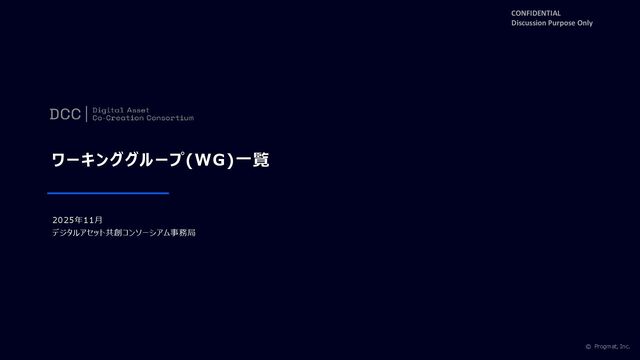 WG一覧 #1-1 DCC主催WG一覧(2025年10月時点) 現在 開催中の WG (1件) WG名称 概要 開催期間 参加募集状況 トークン化法・株式STWG トークン化に係る一般法を制定した海外の 先例を参考に、券面発行を前提としたアナ ログ規制を包括的に解決するための「トー クン化法」立法に向けて、民間主導で枠 組み/素案を策定します。 さらに、既に一定程度国内インフラが高度 化している株式について、トークン化による 効用が置換コストを上回る領域の特定と 商品/制度設計を行うことで、「トークン化 株式」の具体的な商品組成に繋げることを 目指します 25/11月~26年3月 募集中