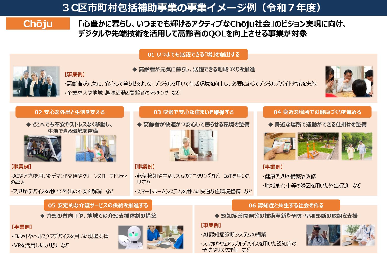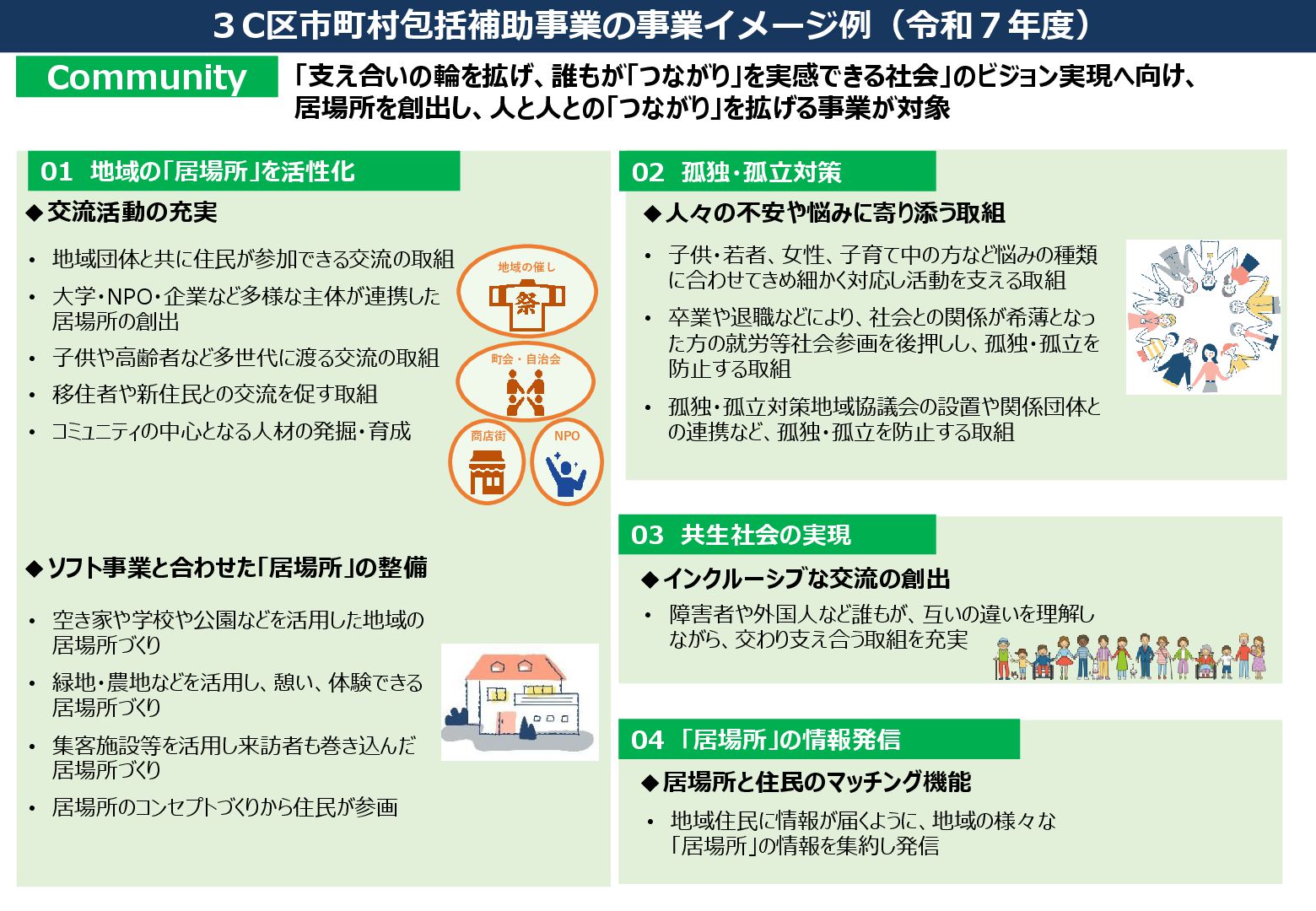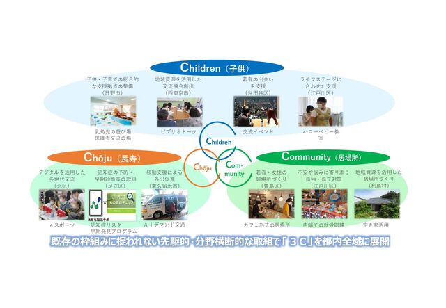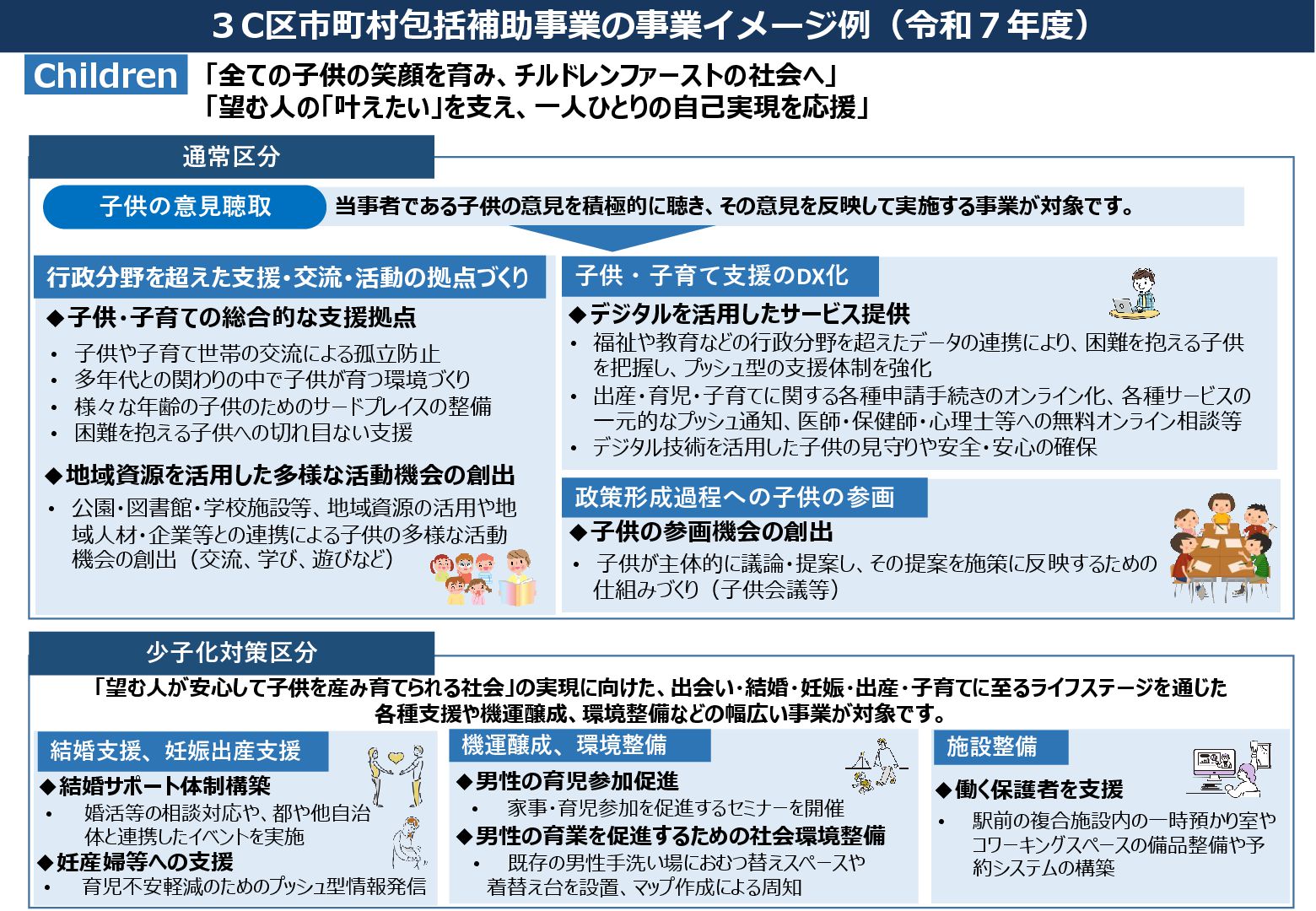 子供・子育て支援のDX化 ◆デジタルを活用したサービス提供 当事者である子供の意見を積極的に聴き、その意見を反映して実施する事業が対象です。 通常区分 少子化対策区分 「望む人が安心して子供を産み育てられる社会」の実現に向けた、出会い・結婚・妊娠・出産・子育てに至るライフステージを通じた 各種支援や機運醸成、環境整備などの幅広い事業が対象です。 政策形成過程への子供の参画 • 子供が主体的に議論・提案し、その提案を施策に反映するための 仕組みづくり(子供会議等) ◆子供の参画機会の創出 ◆地域資源を活用した多様な活動機会の創出 • 公園・図書館・学校施設等、地域資源の活用や地 域人材・企業等との連携による子供の多様な活動 機会の創出(交流、学び、遊びなど) 子供の意見聴取 3C区市町村包括補助事業の事業イメージ例(令和7年度) Children • 福祉や教育などの行政分野を超えたデータの連携により、困難を抱える子供 を把握し、プッシュ型の支援体制を強化 • 出産・育児・子育てに関する各種申請手続きのオンライン化、各種サービスの 一元的なプッシュ通知、医師・保健師・心理士等への無料オンライン相談等 • デジタル技術を活用した子供の見守りや安全・安心の確保 ◆結婚サポート体制構築 • 婚活等の相談対応や、都や他自治 体と連携したイベントを実施 結婚支援、妊娠出産支援 ◆妊産婦等への支援 「全ての子供の笑顔を育み、チルドレンファーストの社会へ」 「望む人の「叶えたい」を支え、一人ひとりの自己実現を応援」 機運醸成、環境整備 • 家事・育児参加を促進するセミナーを開催 ◆男性の育児参加促進 ◆男性の育業を促進するための社会環境整備 • 既存の男性手洗い場におむつ替えスペースや 着替え台を設置、マップ作成による周知 • 育児不安軽減のためのプッシュ型情報発信 施設整備 ◆働く保護者を支援 • 駅前の複合施設内の一時預かり室や コワーキングスペースの備品整備や予 約システムの構築