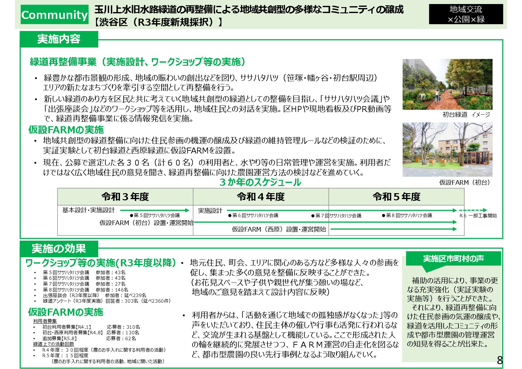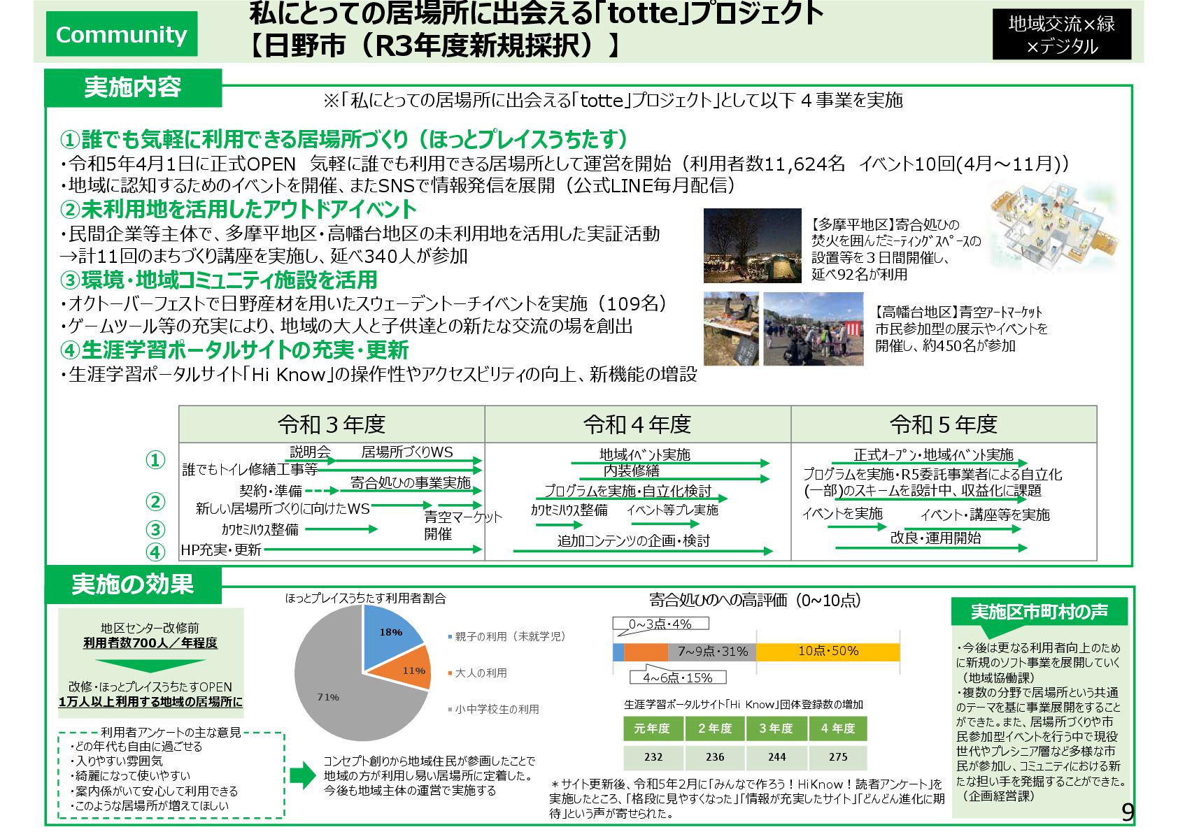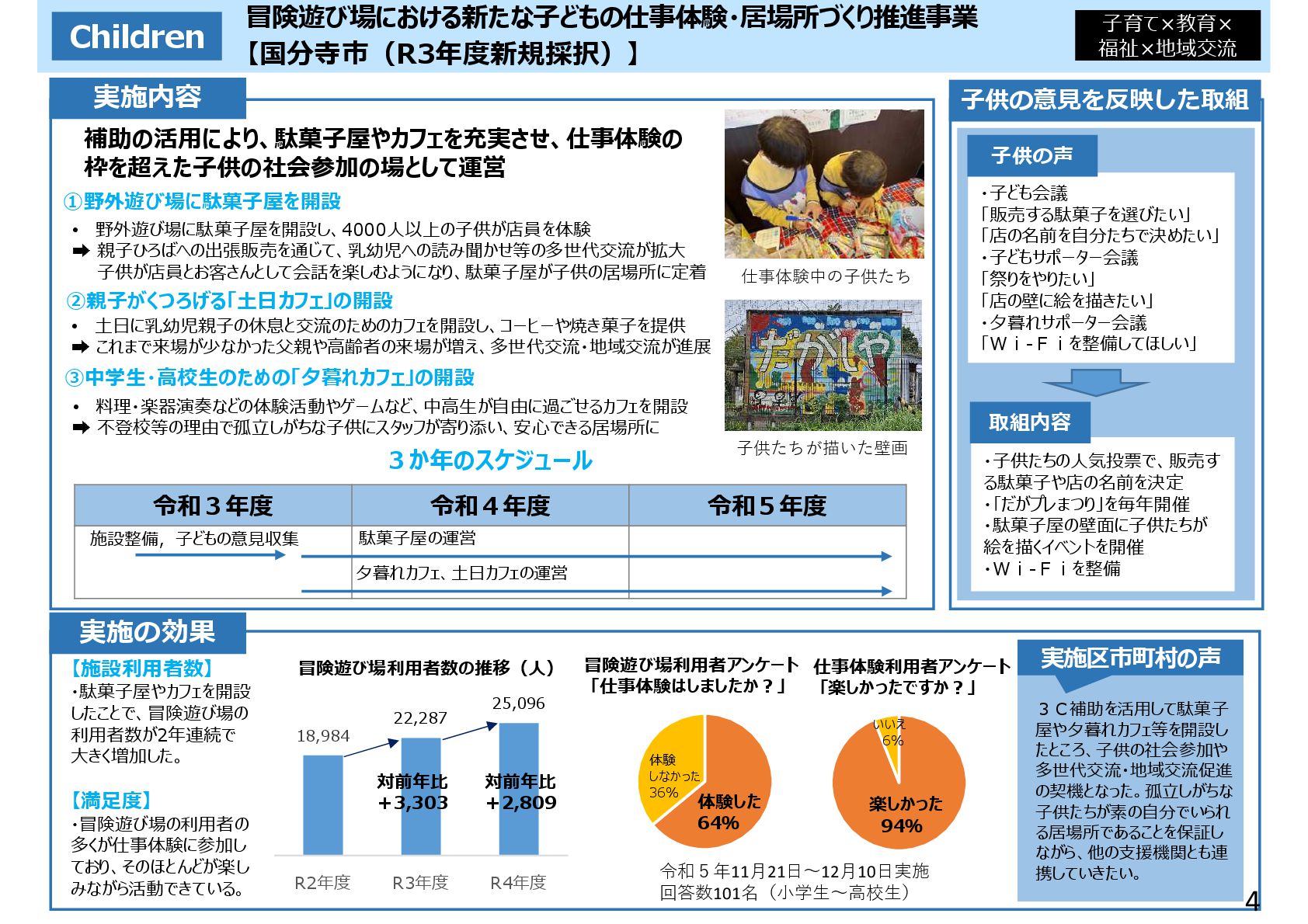 親子ひろばへの出張販売を通じて、乳幼児への読み聞かせ等の多世代交流が拡大 子供が店員とお客さんとして会話を楽しむようになり、駄菓子屋が子供の居場所に定着 ②親子がくつろげる「土日カフェ」の開設 • 土日に乳幼児親子の休息と交流のためのカフェを開設し、コーヒーや焼き菓子を提供 これまで来場が少なかった父親や高齢者の来場が増え、多世代交流・地域交流が進展 ③中学生・高校生のための「夕暮れカフェ」の開設 • 料理・楽器演奏などの体験活動やゲームなど、中高生が自由に過ごせるカフェを開設 不登校等の理由で孤立しがちな子供にスタッフが寄り添い、安心できる居場所に 3か年のスケジュール 実施区市町村の声 ・子ども会議 「販売する駄菓子を選びたい」 「店の名前を自分たちで決めたい」 ・子どもサポーター会議 「祭りをやりたい」 「店の壁に絵を描きたい」 ・夕暮れサポーター会議 「Wi-Fiを整備してほしい」 子供の意見を反映した取組 子供の声 ・子供たちの人気投票で、販売す る駄菓子や店の名前を決定 ・「だがプレまつり」を毎年開催 ・駄菓子屋の壁面に子供たちが 絵を描くイベントを開催 ・Wi-Fiを整備 取組内容 ①野外遊び場に駄菓子屋を開設 施設整備,子どもの意見収集 駄菓子屋の運営 夕暮れカフェ、土日カフェの運営 18,984 22,287 25,096 R2年度 R3年度 R4年度 3C補助を活用して駄菓子 屋や夕暮れカフェ等を開設し たところ、子供の社会参加や 多世代交流・地域交流促進 の契機となった。孤立しがちな 子供たちが素の自分でいられ る居場所であることを保証し ながら、他の支援機関とも連 携していきたい。 令和5年11月21日〜12月10日実施 回答数101名(小学生〜高校生) 冒険遊び場における新たな子どもの仕事体験・居場所づくり推進事業 【国分寺市(R3年度新規採択)】 仕事体験中の子供たち 補助の活用により、駄菓子屋やカフェを充実させ、仕事体験の 枠を超えた子供の社会参加の場として運営 子供たちが描いた壁画 対前年比 +3,303 対前年比 +2,809 【施設利用者数】 ・駄菓子屋やカフェを開設 したことで、冒険遊び場の 利用者数が2年連続で 大きく増加した。 【満足度】 ・冒険遊び場の利用者の 多くが仕事体験に参加し ており、そのほとんどが楽し みながら活動できている。 冒険遊び場利用者アンケート 「仕事体験はしましたか︖」 体験した 64% 体験 しなかった 36% 冒険遊び場利用者数の推移(人) 楽しかった 94% いいえ 6% 仕事体験利用者アンケート 「楽しかったですか︖」 4