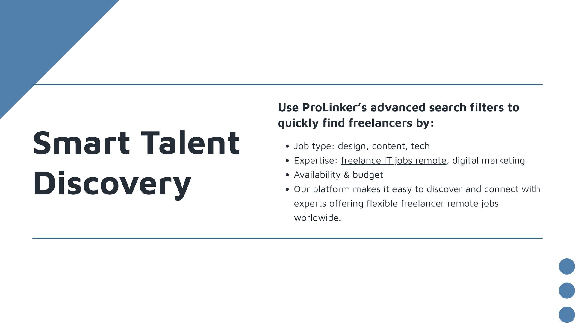 ProLinker is your go-to platform to hire freelance marketers, developers, designers, and more. Post your project for free in under 2 minutes and start receiving qualified proposals within 24 hours. Browse portfolios, reviews, and securely hire top talent for freelance IT jobs remote and short-term tasks. With smart filters and safe payments, ProLinker makes freelance remote jobs easier to manage.