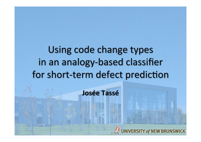 nbBlocks, avgModifs, avgDist (standardized on [0,1] scale) • Use clustering to find types of changes à JEdit: – Type A: small modifica7ons in single block (0.00, 0.17, 0.00) – Type B: average-‐size modifica7ons in few dispersed blocks (0.29, 0.24, 0.47) – Type C: average-‐size modif. in many dispersed blocks (0.61, 0.24, 0.46) – Type D: massive modifica7ons in single block (0.00, 0.72, 0.00) PROMISE'13 -‐-‐ Josée Tassé