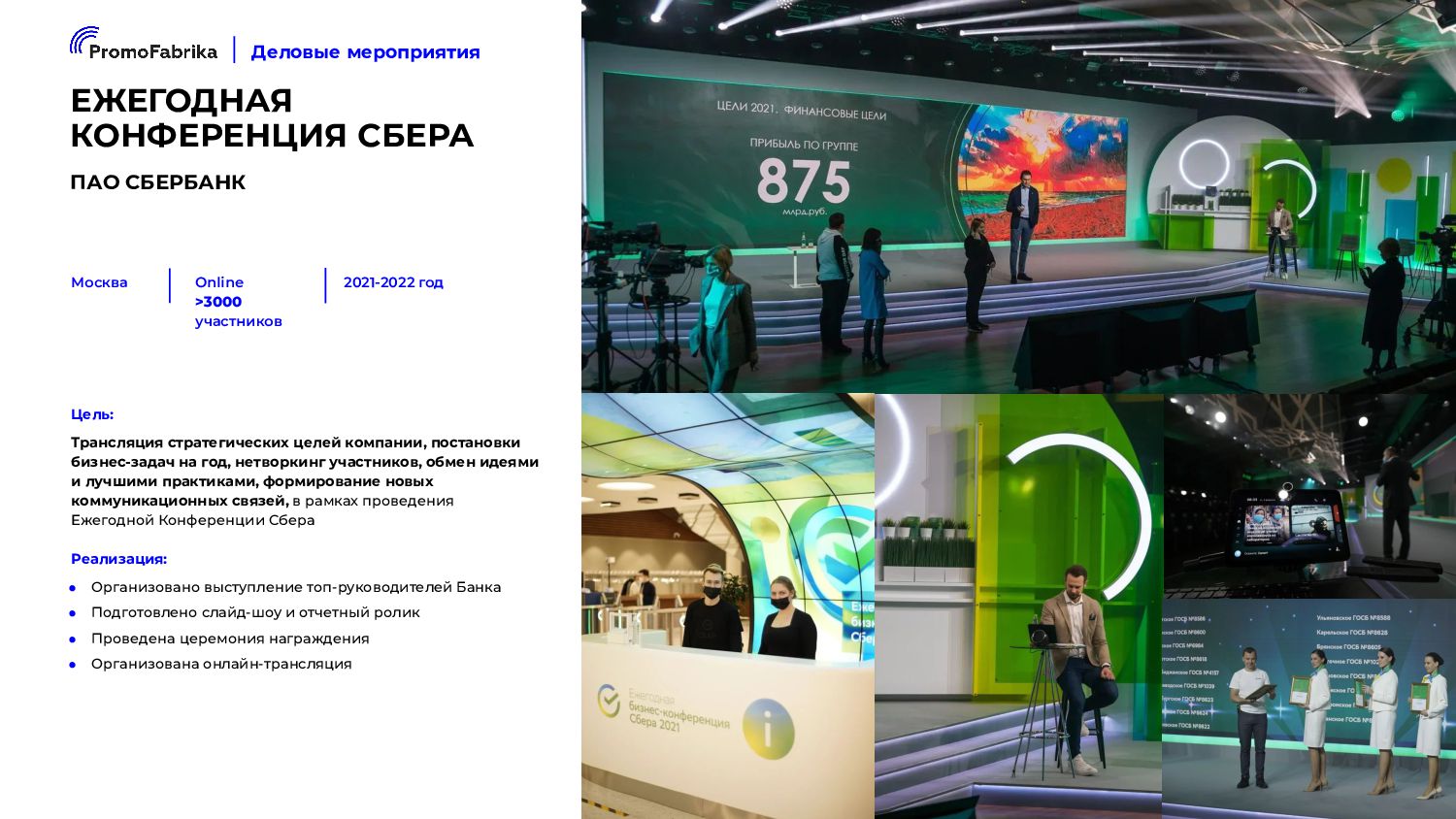 технологий ARTIFICIAL INTELLIGENCE JOURNEY 2021 — КОНФЕРЕНЦИЯ ПО ИСКУССТВЕННОМУ ИНТЕЛЛЕКТУ ПАО СБЕРБАНК Цель: Организовать мероприятие направленное на создание площадки коммуникации представителей международных организаций, бизнеса, научного сообщества и технических специалистов в сфере ИИ. Участники должны иметь возможность следить за увлекательными выступлениями признанных мировых экспертов отрасли и представителей компаний-лидеров по разработке и внедрению технологий ИИ в различные сферы бизнеса и жизни. Маркетинговая цель: привлечь новую аудиторию в лице молодых ученых и разработчиков. Реализация: • В дни проведения мероприятия проходили 6 (3 онлайн и 3 офлайн) параллельных стримов со спикерами со всего мира • На главной сцене были применены технологии искусственного интеллекта, где прямом эфире происходила генерация картинки из наиболее часто упоминаемых слов спикеров. • В заключительный день, с участием Президента РФ в прямом эфире, проходила презентация детских проектов-победителей в Международном конкурсе по искусственному интеллекту для детей, которые несколько месяцев разрабатывали решение разнообразных задач при помощи искусственного интеллекта.