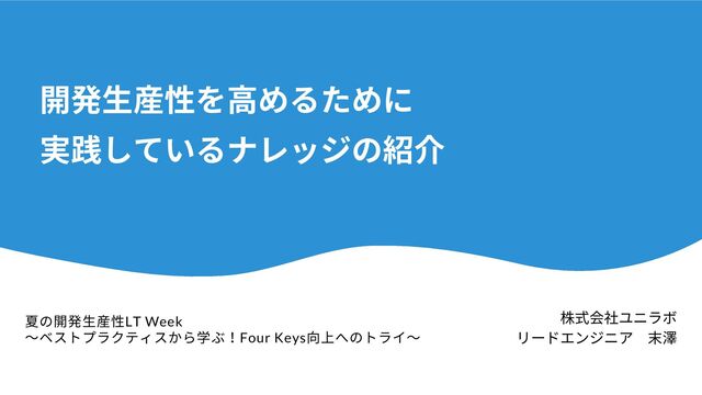 る た め に F i n d y T e a m + 導 入 「エンジニアの生産性」は、抽象的な概念です。 具体化し継続的に定量評価できる状態にしないと、 "自分達のパフォーマンスは良いのか、良くないのかわからない状態" となってしまいます。 そのため、ソフトウェア開発チームのパフォーマンスを示す 4 つの指標 "Four Keys" を可視化できるFindyTeam+を導入しています。 デプロイの頻度 - 組織による正常な本番環境へのリリースの頻度 変更のリードタイム - commit から本番環境稼働までの所要時間 変更障害率 - デプロイが原因で本番環境で障害が発生する割合(%) サービス復元時間 - 組織が本番環境での障害から回復するのにかかる時間