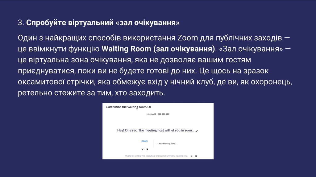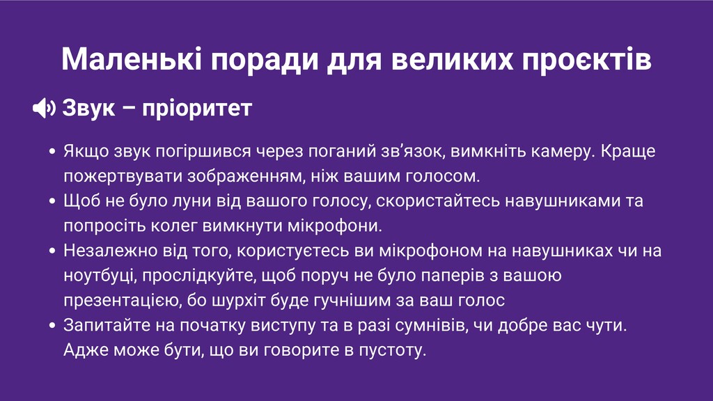 в неї або в тому ж напрямку. Це забезпечує відчуття зорового контакту. Де сидіти. Деякі презентери встають і відходять від камери, щоб виступати стоячи. З одного боку, це дає вам свободу жестів. Але це можна робити, лише якщо ви впевнені, що якість звуку не постраждає (бо звук-пріоритет). Одяг має відповідати приводу. Не забудьте зняти піжаму! Жести, наприклад, часте поправляння волосся, можуть відволікати. + офісні стільці, що крутяться. Якщо ви сидите на такому, зафіксуйте його хоча б на час виступу, щоб не крутится, не помічаючи цього. Зображення