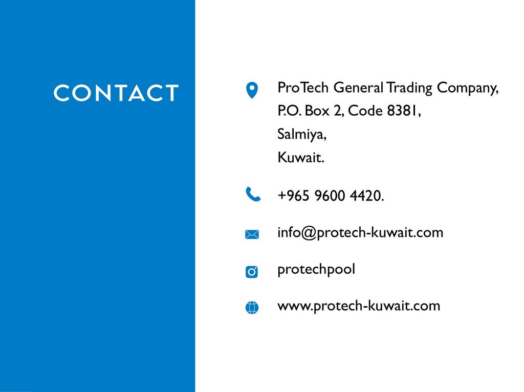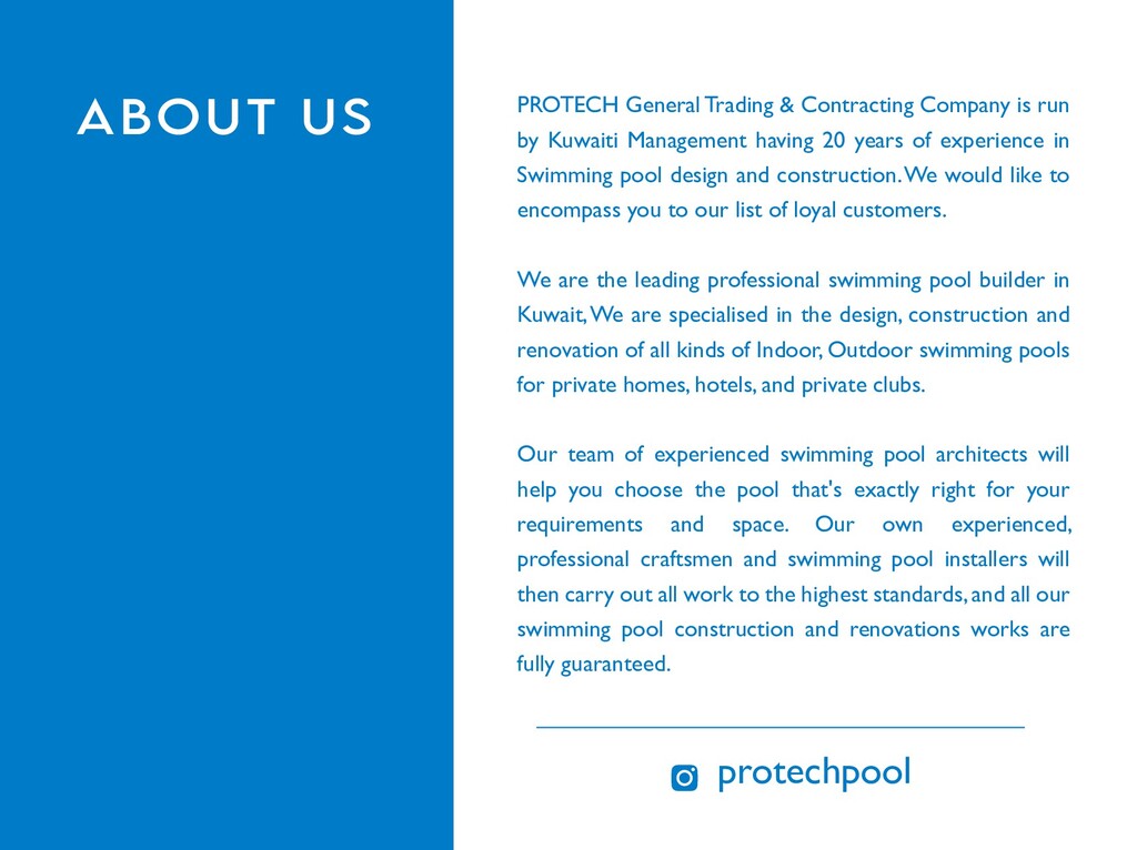 by Kuwaiti Management having 20 years of experience in Swimming pool design and construction. We would like to encompass you to our list of loyal customers. We are the leading professional swimming pool builder in Kuwait, We are specialised in the design, construction and renovation of all kinds of Indoor, Outdoor swimming pools for private homes, hotels, and private clubs. Our team of experienced swimming pool architects will help you choose the pool that's exactly right for your requirements and space. Our own experienced, professional craftsmen and swimming pool installers will then carry out all work to the highest standards, and all our swimming pool construction and renovations works are fully guaranteed. protechpool