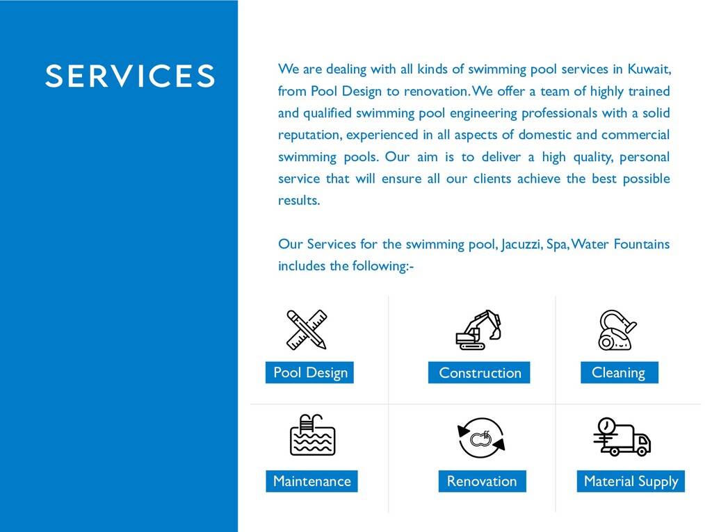 in Kuwait, from Pool Design to renovation. We offer a team of highly trained and qualified swimming pool engineering professionals with a solid reputation, experienced in all aspects of domestic and commercial swimming pools. Our aim is to deliver a high quality, personal service that will ensure all our clients achieve the best possible results. Our Services for the swimming pool, Jacuzzi, Spa, Water Fountains includes the following:- Pool Design Construction Renovation Material Supply Maintenance Cleaning SERVICES