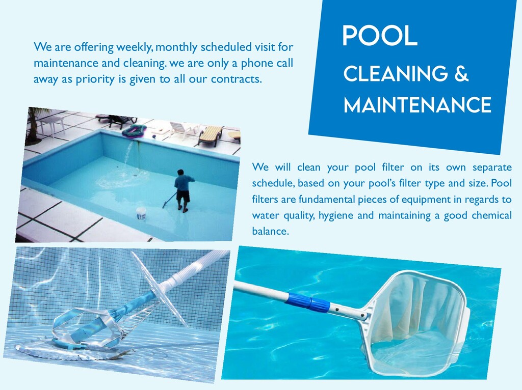 and cleaning. we are only a phone call away as priority is given to all our contracts. We will clean your pool filter on its own separate schedule, based on your pool’s filter type and size. Pool filters are fundamental pieces of equipment in regards to water quality, hygiene and maintaining a good chemical balance. CLEANiNG & MAiNTENANCE