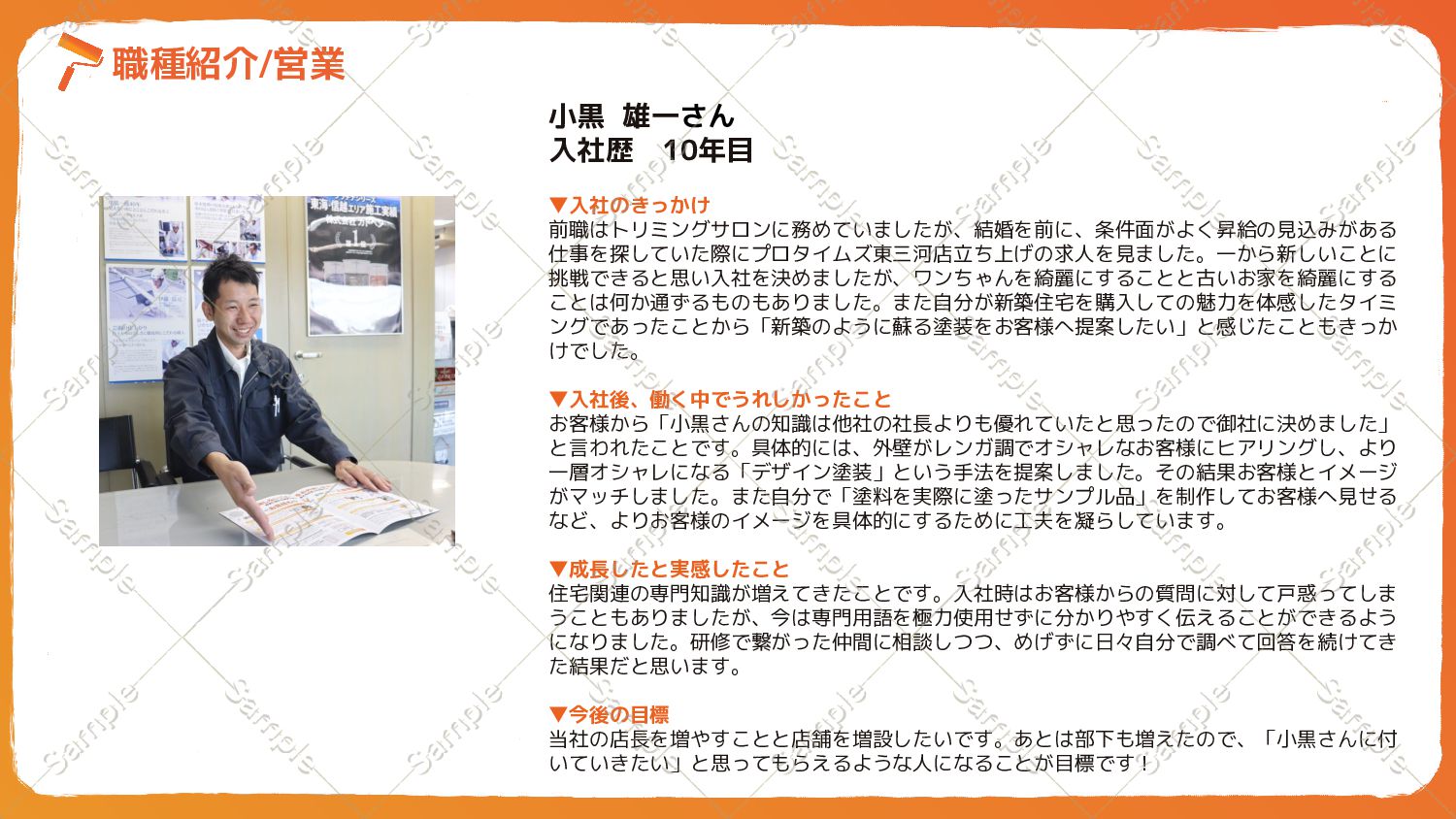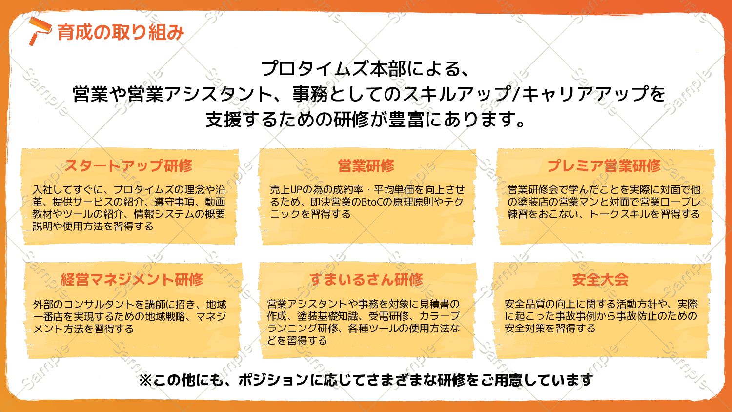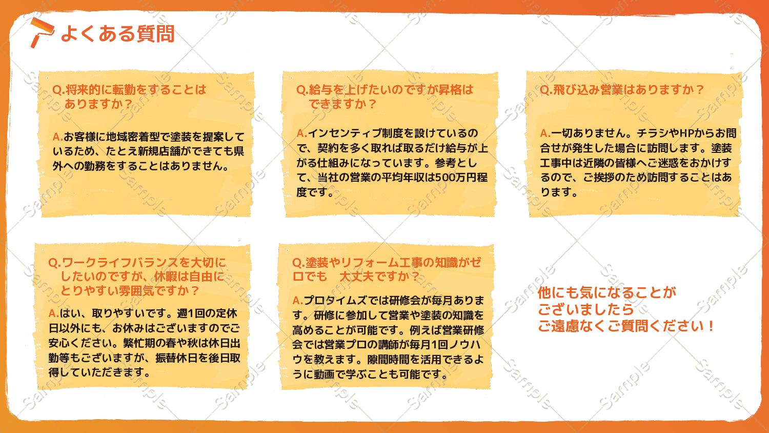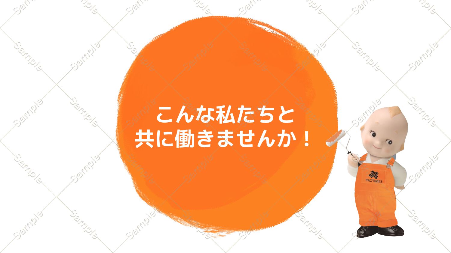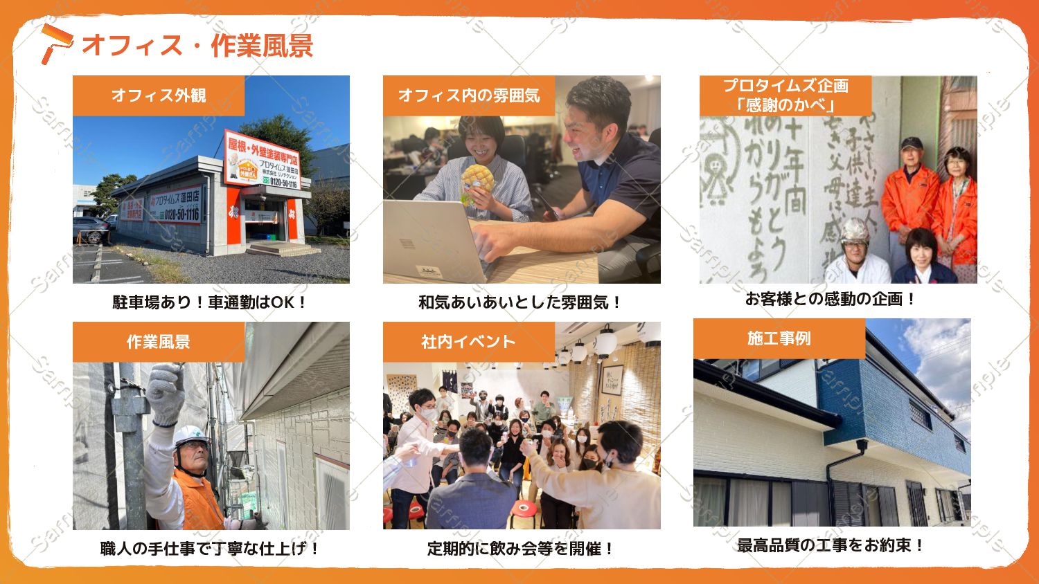 がる仕組みになっています。参考とし て、当社の営業の平均年収は500万円程 度です。 Q.飛び込み営業はありますか? A.一切ありません。チラシやHPからお問 合せが発生した場合に訪問します。塗装 工事中は近隣の皆様へご迷惑をおかけす るので、ご挨拶のため訪問することはあ ります。 Q.ワークライフバランスを大切に したいのですが、休暇は自由に とりやすい雰囲気ですか? A.はい、取りやすいです。週1回の定休 日以外にも、お休みはございますのでご 安心ください。繁忙期の春や秋は休日出 勤等もございますが、振替休日を後日取 得していただきます。 Q.塗装やリフォーム工事の知識がゼ ロでも 大丈夫ですか? A.プロタイムズでは研修会が毎月ありま す。研修に参加して営業や塗装の知識を 高めることが可能です。例えば営業研修 会では営業プロの講師が毎月1回ノウハ ウを教えます。隙間時間を活用できるよ うに動画で学ぶことも可能です。 他にも気になることが ございましたら ご遠慮なくご質問ください!