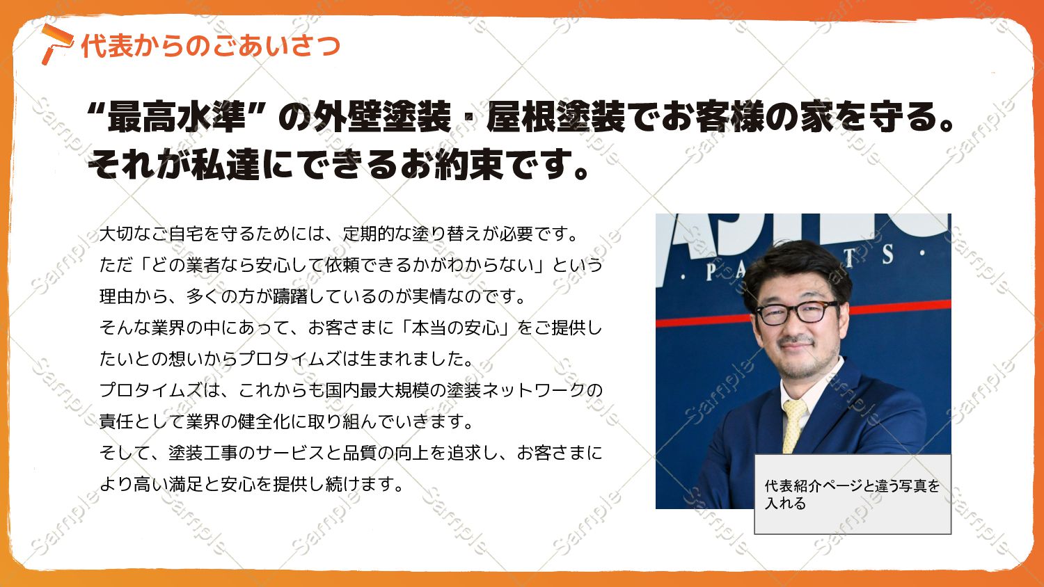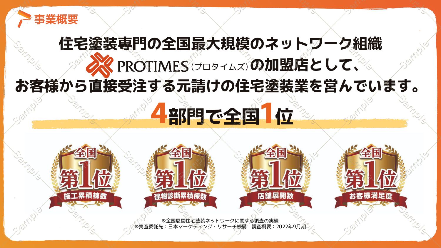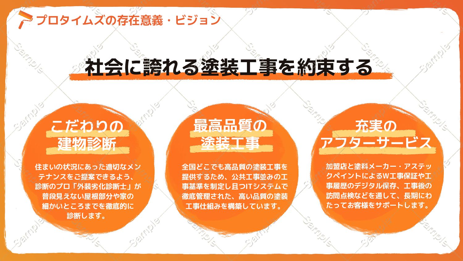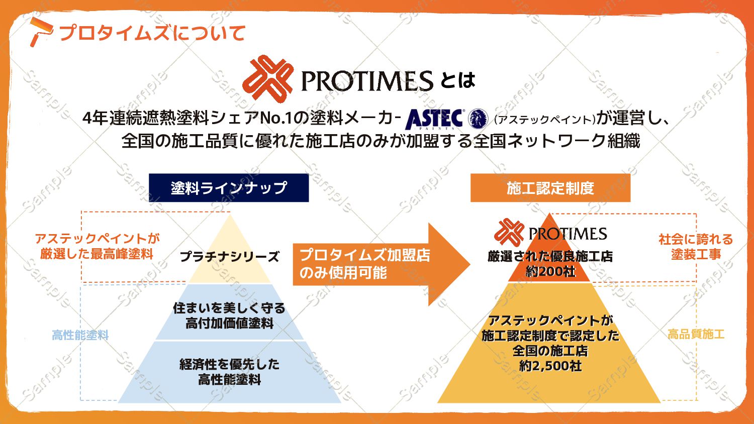 がる仕組みになっています。参考とし て、当社の営業の平均年収は500万円程 度です。 Q.飛び込み営業はありますか? A.一切ありません。チラシやHPからお問 合せが発生した場合に訪問します。塗装 工事中は近隣の皆様へご迷惑をおかけす るので、ご挨拶のため訪問することはあ ります。 Q.ワークライフバランスを大切に したいのですが、休暇は自由に とりやすい雰囲気ですか? A.はい、取りやすいです。週1回の定休 日以外にも、お休みはございますのでご 安心ください。繁忙期の春や秋は休日出 勤等もございますが、振替休日を後日取 得していただきます。 Q.塗装やリフォーム工事の知識がゼ ロでも 大丈夫ですか? A.プロタイムズでは研修会が毎月ありま す。研修に参加して営業や塗装の知識を 高めることが可能です。例えば営業研修 会では営業プロの講師が毎月1回ノウハ ウを教えます。隙間時間を活用できるよ うに動画で学ぶことも可能です。 他にも気になることが ございましたら ご遠慮なくご質問ください!