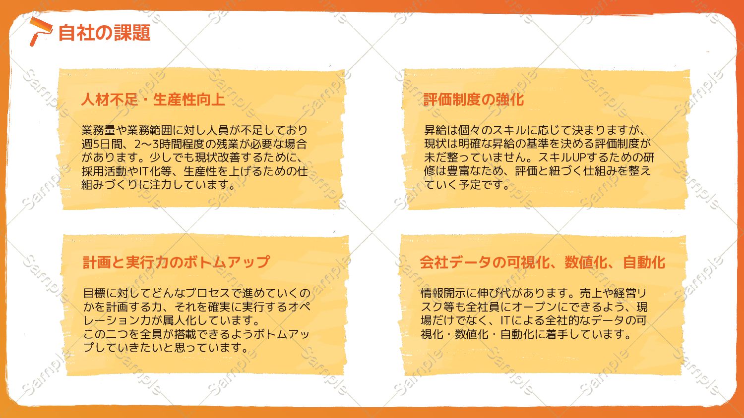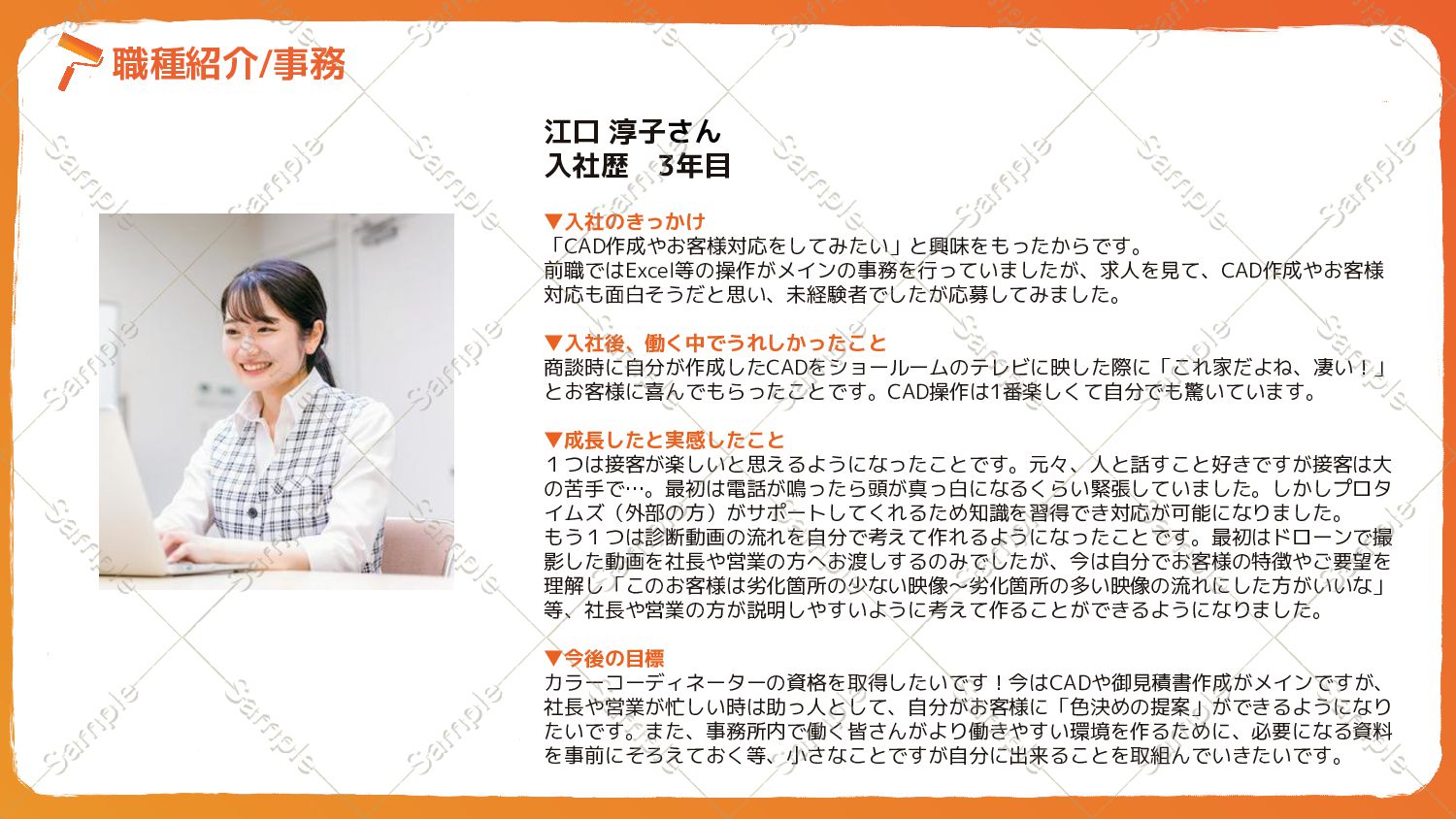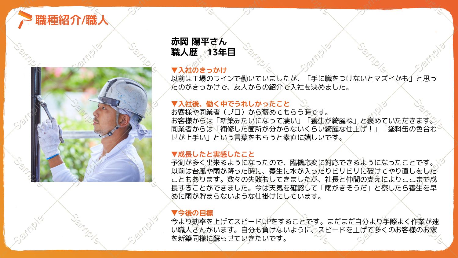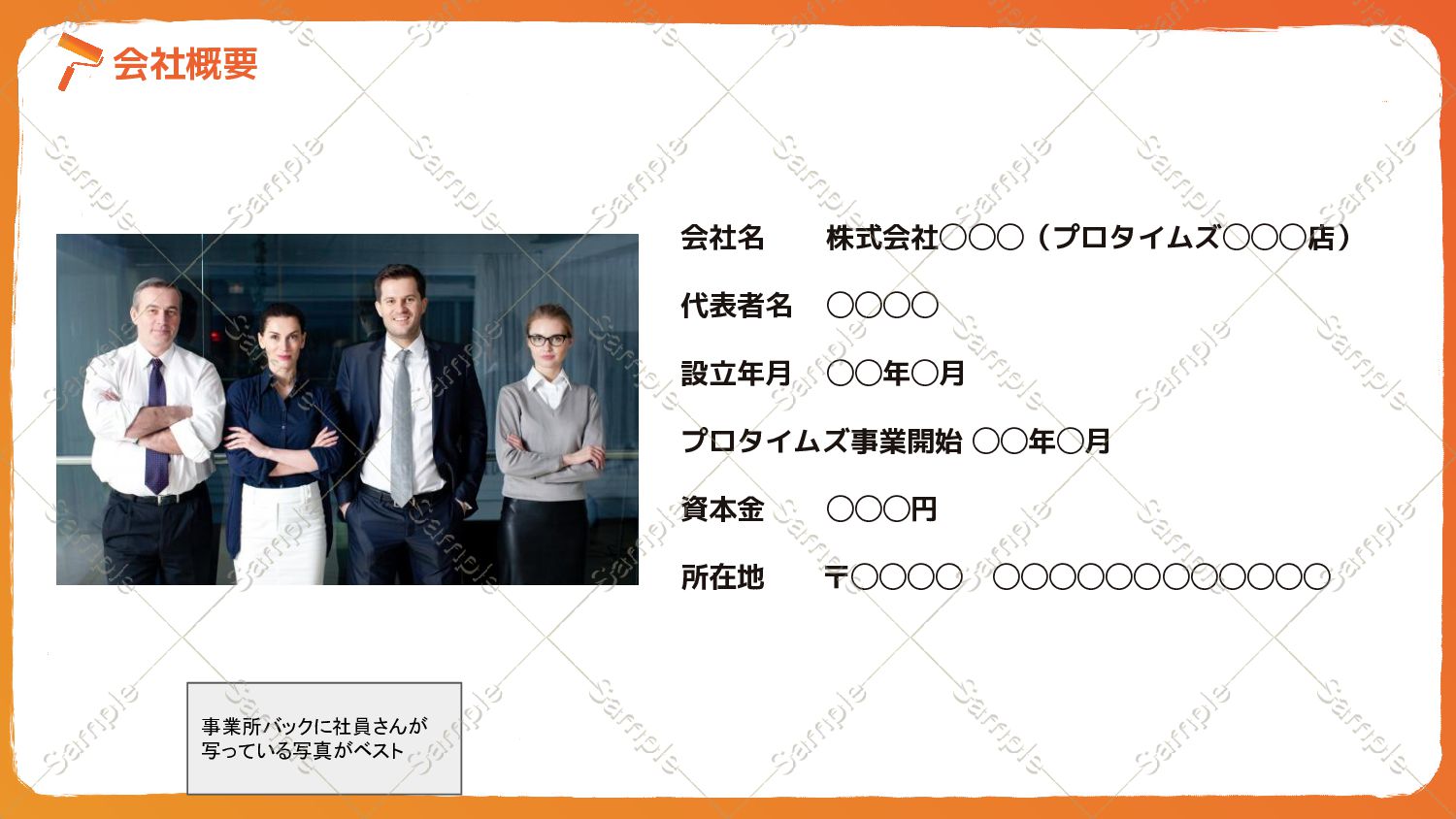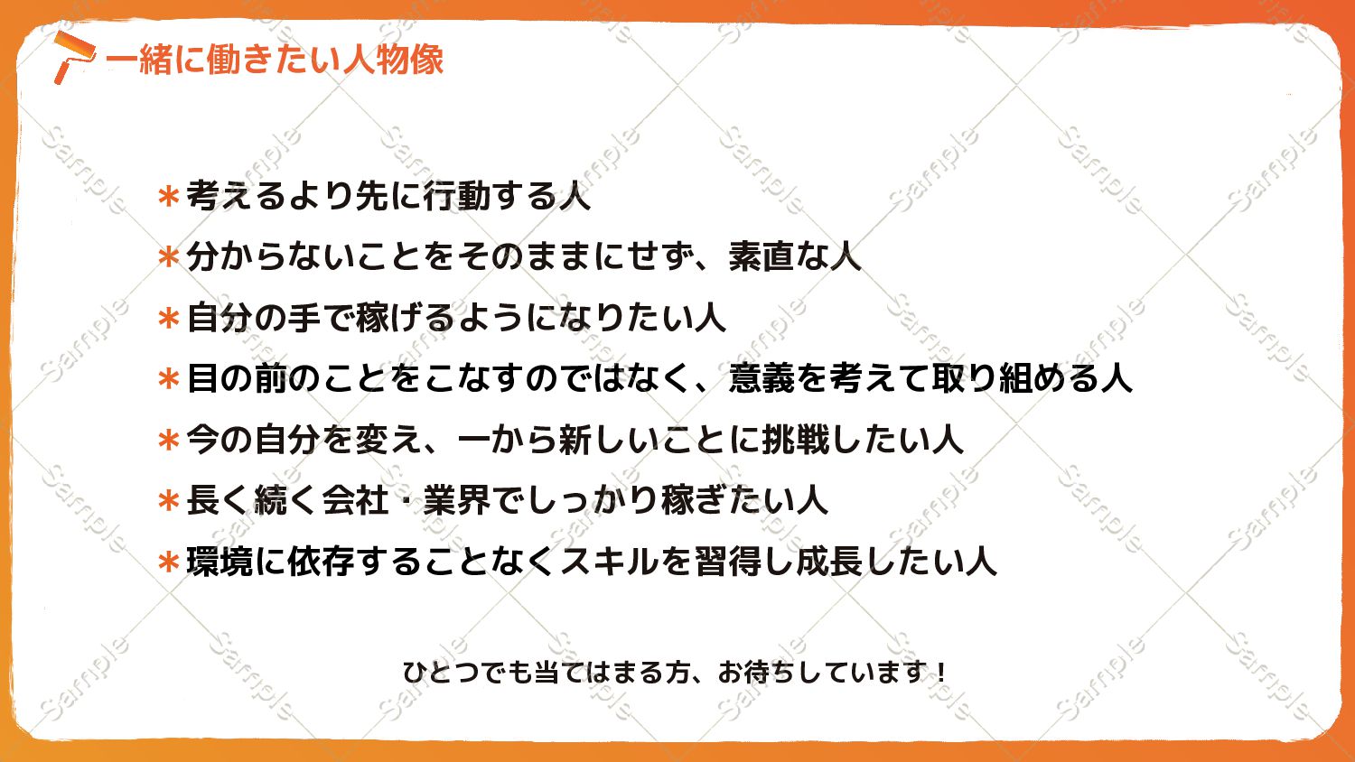 がる仕組みになっています。参考とし て、当社の営業の平均年収は500万円程 度です。 Q.飛び込み営業はありますか? A.一切ありません。チラシやHPからお問 合せが発生した場合に訪問します。塗装 工事中は近隣の皆様へご迷惑をおかけす るので、ご挨拶のため訪問することはあ ります。 Q.ワークライフバランスを大切に したいのですが、休暇は自由に とりやすい雰囲気ですか? A.はい、取りやすいです。週1回の定休 日以外にも、お休みはございますのでご 安心ください。繁忙期の春や秋は休日出 勤等もございますが、振替休日を後日取 得していただきます。 Q.塗装やリフォーム工事の知識がゼ ロでも 大丈夫ですか? A.プロタイムズでは研修会が毎月ありま す。研修に参加して営業や塗装の知識を 高めることが可能です。例えば営業研修 会では営業プロの講師が毎月1回ノウハ ウを教えます。隙間時間を活用できるよ うに動画で学ぶことも可能です。 他にも気になることが ございましたら ご遠慮なくご質問ください!