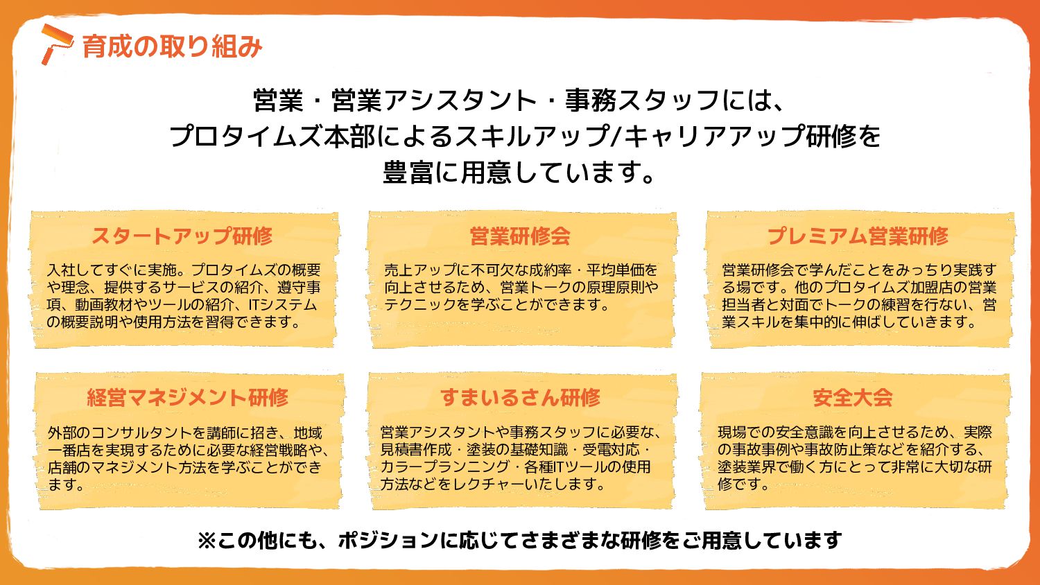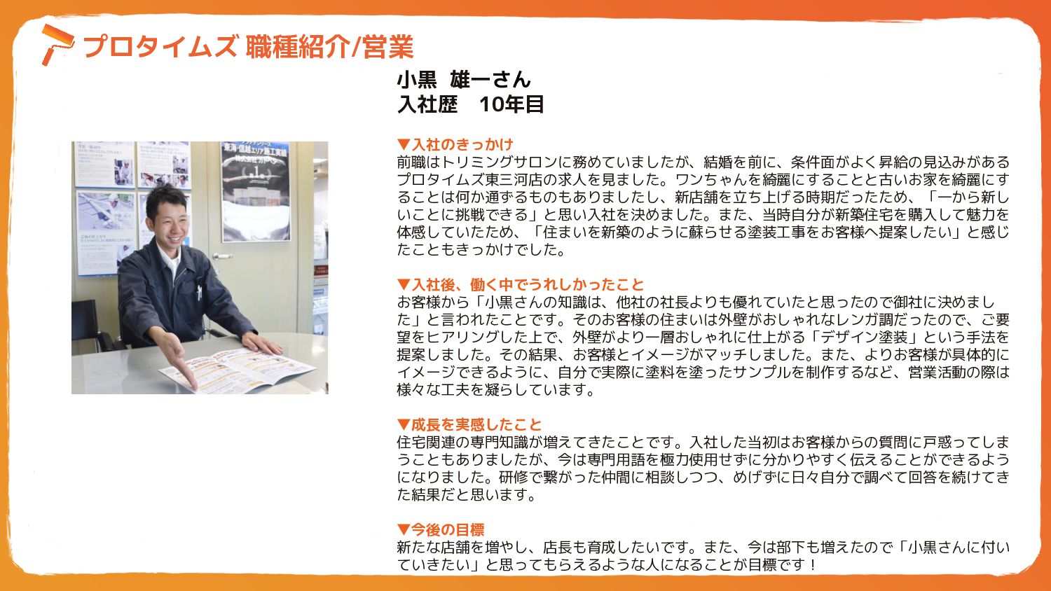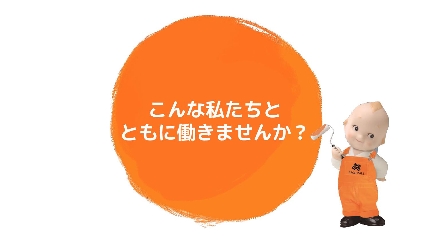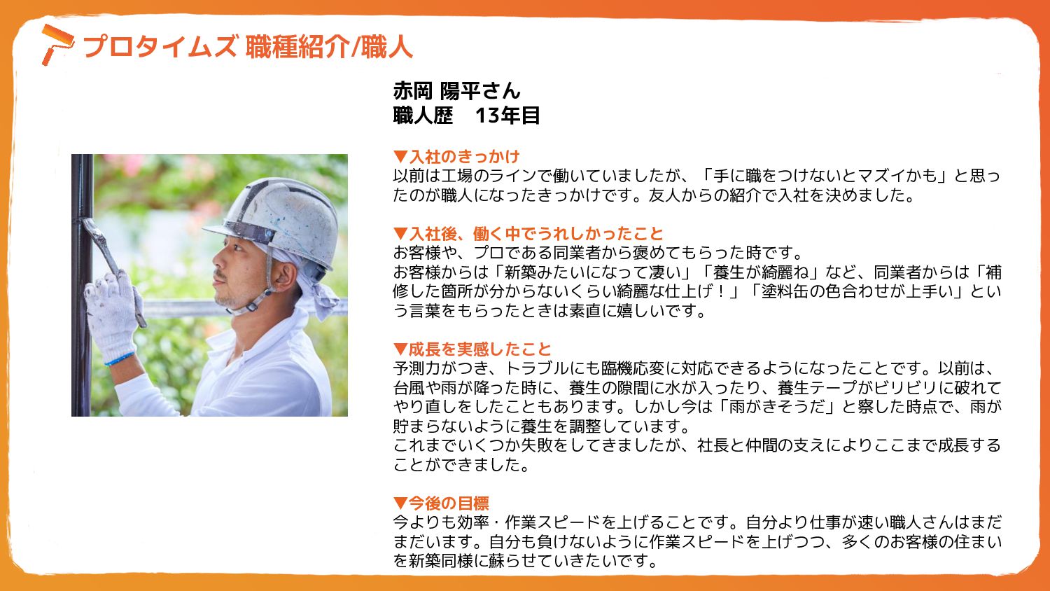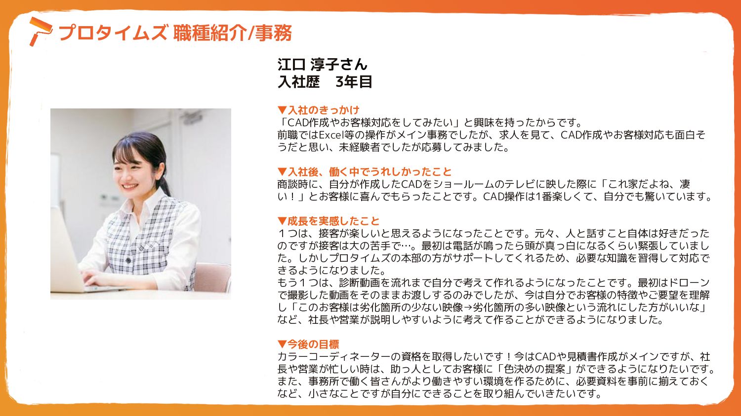 ▼入社後、働く中でうれしかったこと 商談時に、自分が作成したCADをショールームのテレビに映した際に「これ家だよね、凄 い!」とお客様に喜んでもらったことです。CAD操作は1番楽しくて、自分でも驚いています。 ▼成長を実感したこと 1つは、接客が楽しいと思えるようになったことです。元々、人と話すこと自体は好きだった のですが接客は大の苦手で…。最初は電話が鳴ったら頭が真っ白になるくらい緊張していまし た。しかしプロタイムズの本部の方がサポートしてくれるため、必要な知識を習得して対応で きるようになりました。 もう1つは、診断動画を流れまで自分で考えて作れるようになったことです。最初はドローン で撮影した動画をそのままお渡しするのみでしたが、今は自分でお客様の特徴やご要望を理解 し「このお客様は劣化箇所の少ない映像→劣化箇所の多い映像という流れにした方がいいな」 など、社長や営業が説明しやすいように考えて作ることができるようになりました。 ▼今後の目標 カラーコーディネーターの資格を取得したいです!今はCADや見積書作成がメインですが、社 長や営業が忙しい時は、助っ人としてお客様に「色決めの提案」ができるようになりたいです。 また、事務所で働く皆さんがより働きやすい環境を作るために、必要資料を事前に揃えておく など、小さなことですが自分にできることを取り組んでいきたいです。