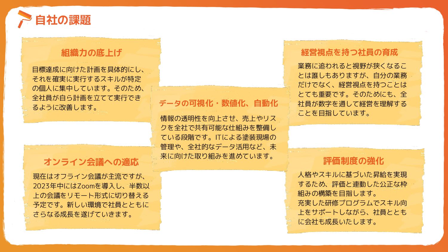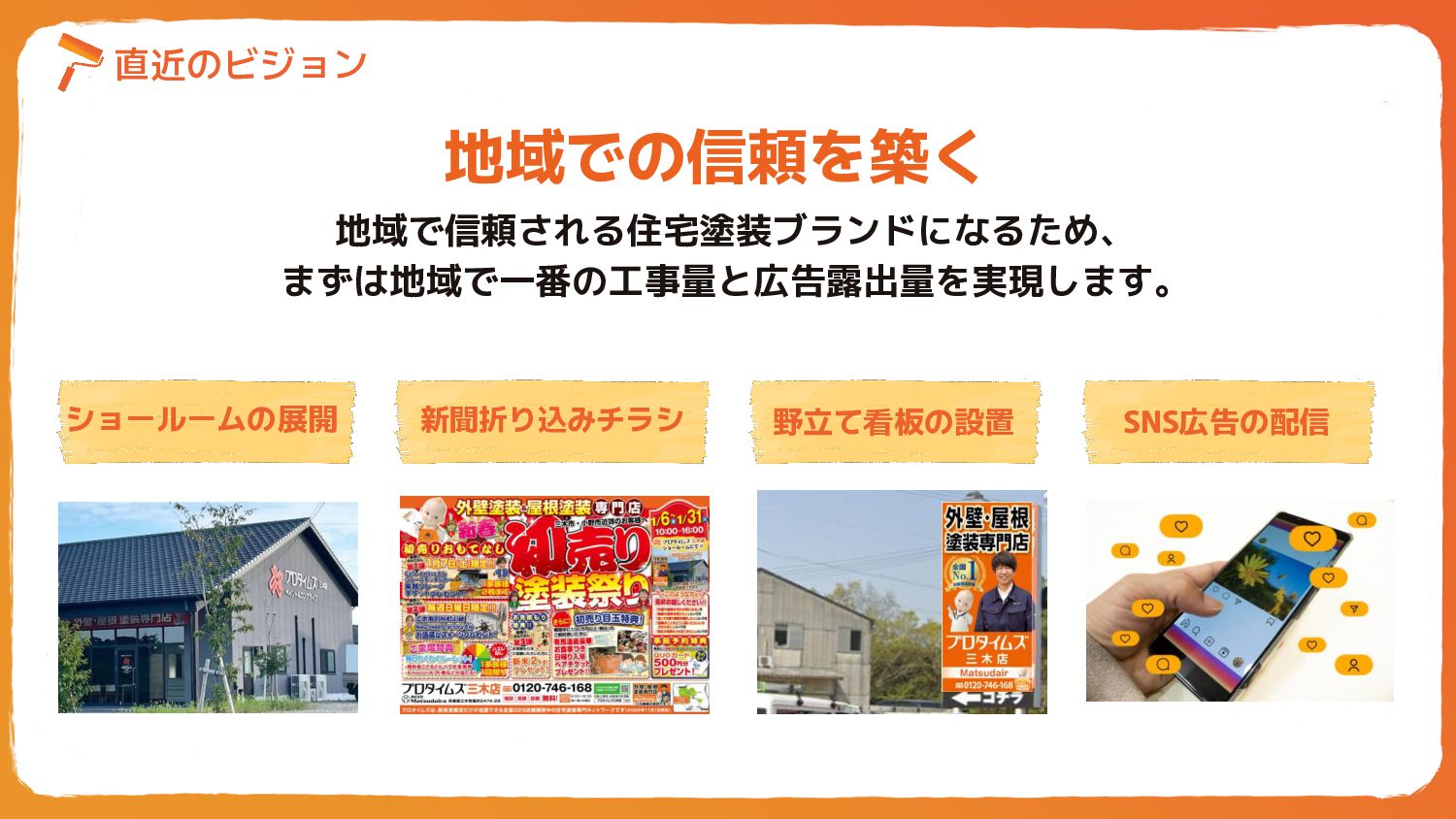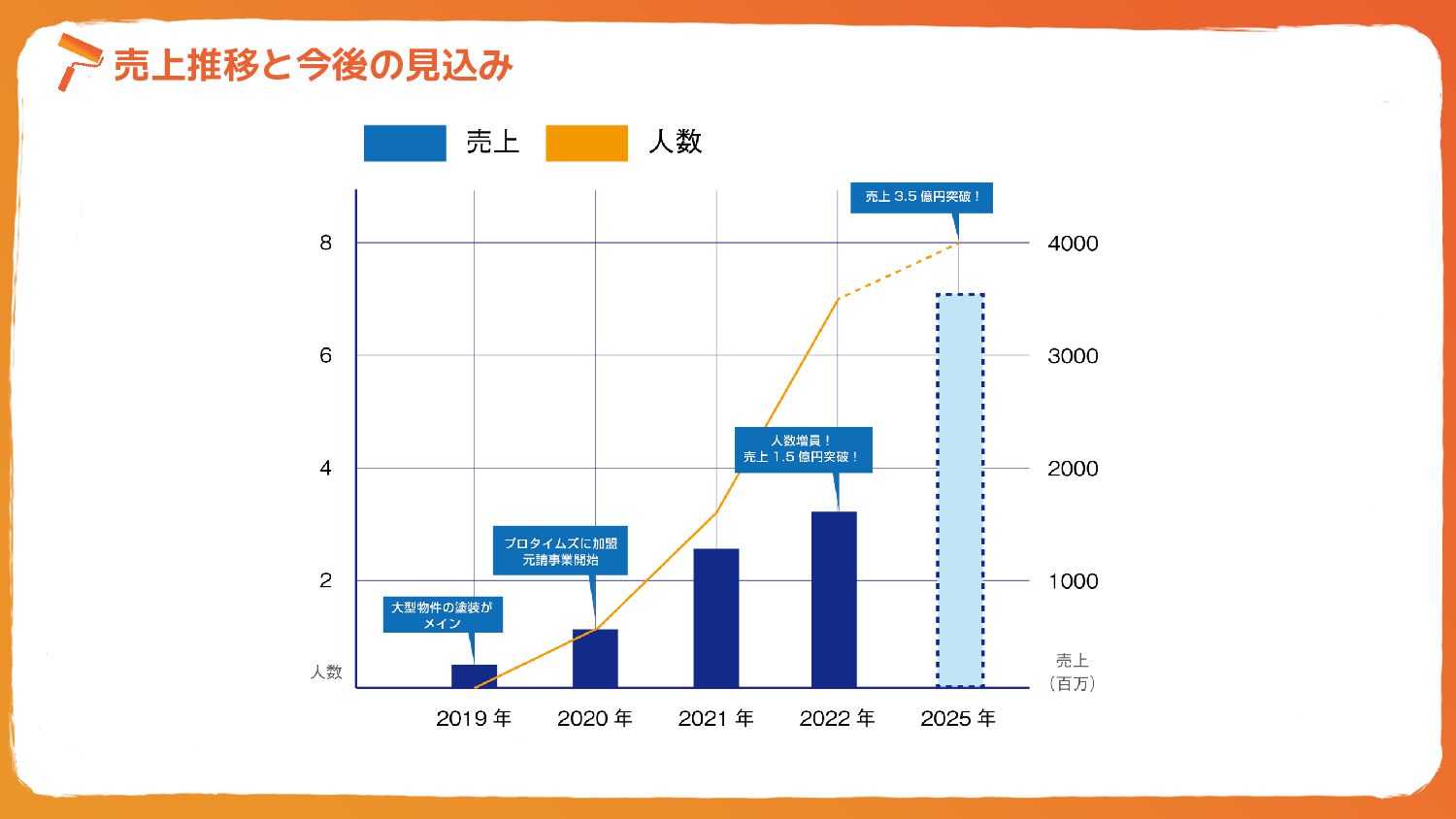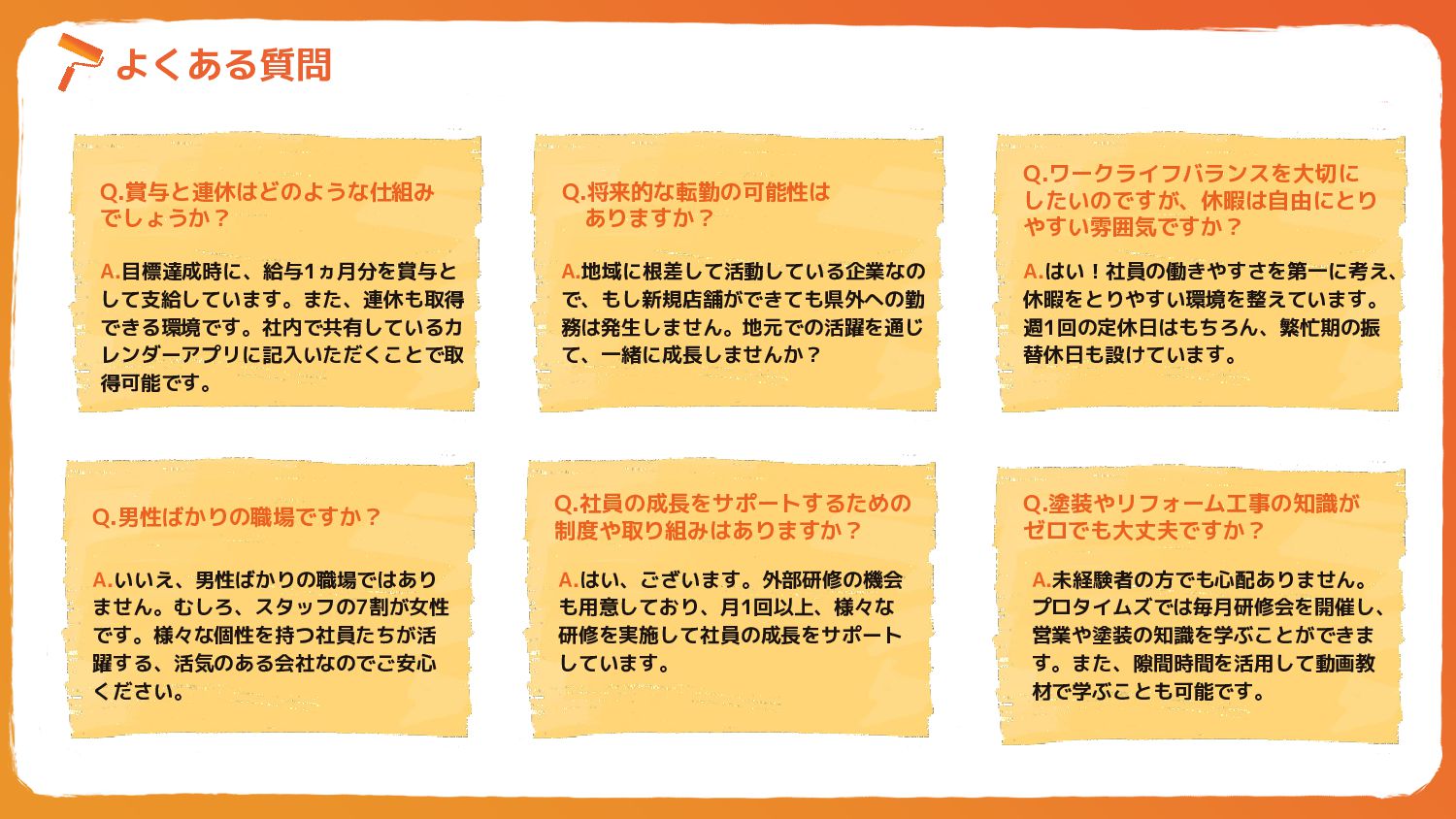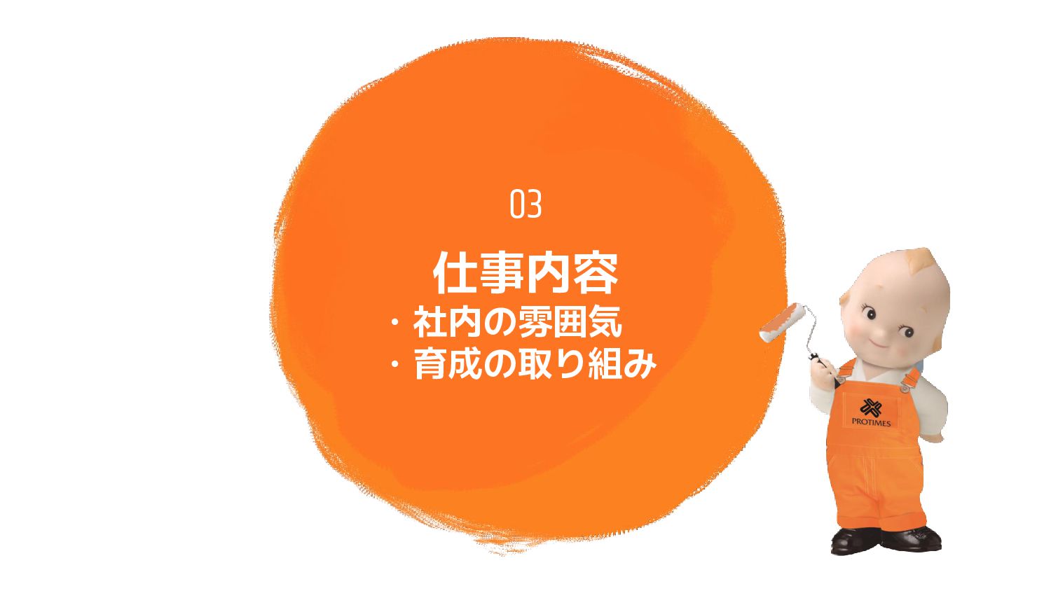▼入社後、働く中でうれしかったこと 商談時に、自分が作成したCADをショールームのテレビに映した際に「これ家だよね、凄 い!」とお客様に喜んでもらったことです。CAD操作は1番楽しくて、自分でも驚いています。 ▼成長を実感したこと 1つは、接客が楽しいと思えるようになったことです。元々、人と話すこと自体は好きだった のですが接客は大の苦手で…。最初は電話が鳴ったら頭が真っ白になるくらい緊張していまし た。しかしプロタイムズの本部の方がサポートしてくれるため、必要な知識を習得して対応で きるようになりました。 もう1つは、診断動画を流れまで自分で考えて作れるようになったことです。最初はドローン で撮影した動画をそのままお渡しするのみでしたが、今は自分でお客様の特徴やご要望を理解 し「このお客様は劣化箇所の少ない映像→劣化箇所の多い映像という流れにした方がいいな」 など、社長や営業が説明しやすいように考えて作ることができるようになりました。 ▼今後の目標 カラーコーディネーターの資格を取得したいです!今はCADや見積書作成がメインですが、社 長や営業が忙しい時は、助っ人としてお客様に「色決めの提案」ができるようになりたいです。 また、事務所で働く皆さんがより働きやすい環境を作るために、必要資料を事前に揃えておく など、小さなことですが自分にできることを取り組んでいきたいです。