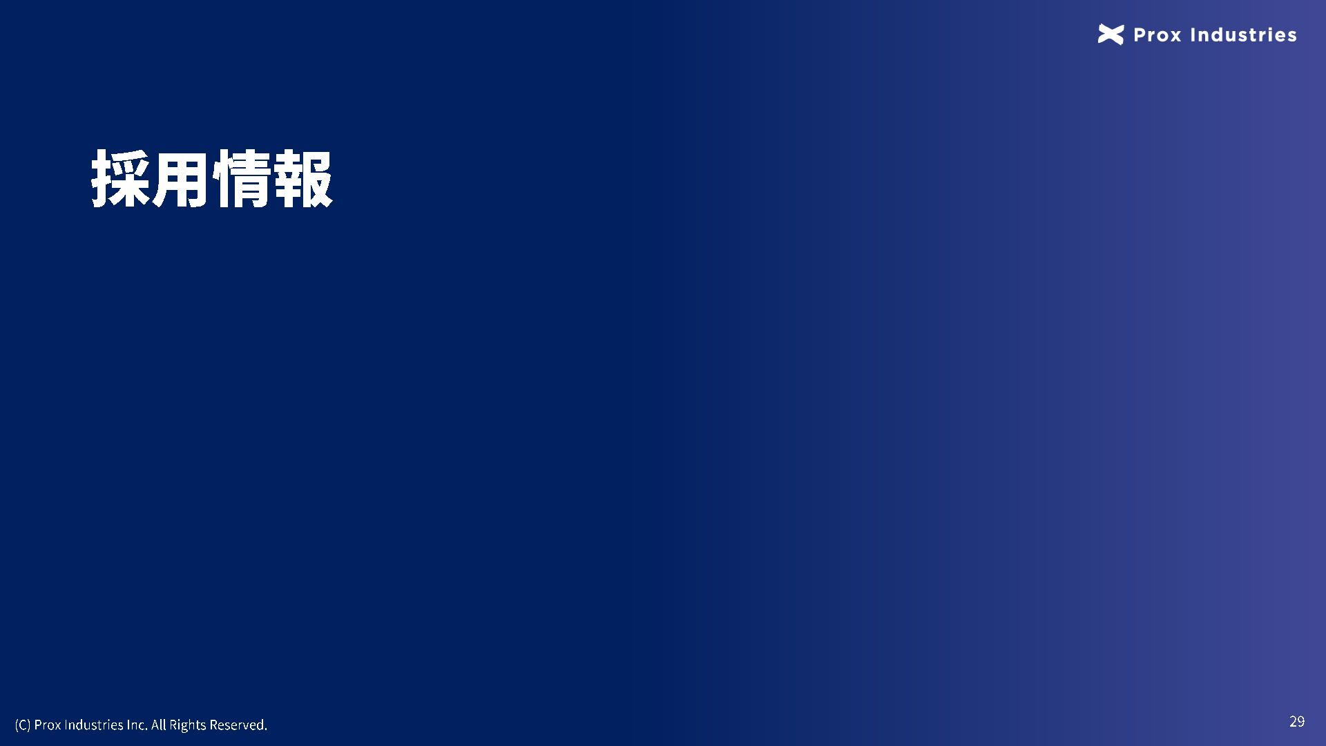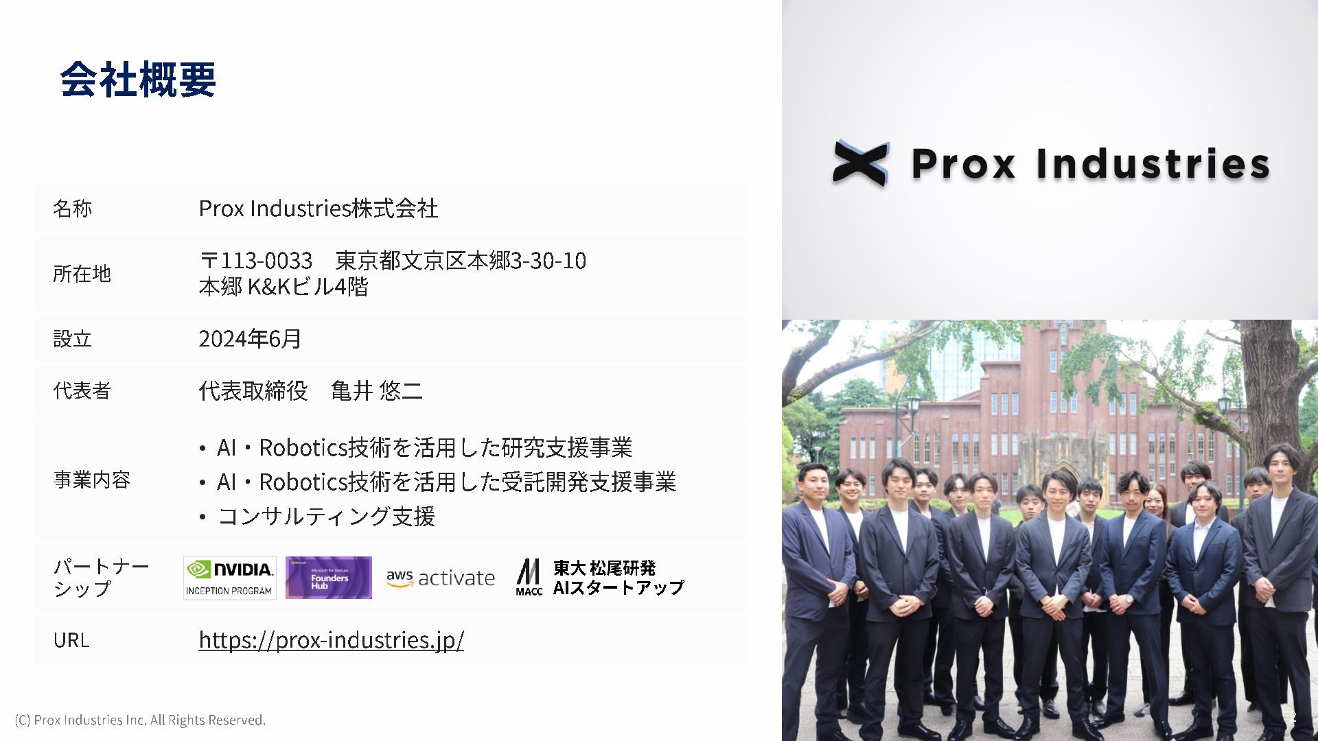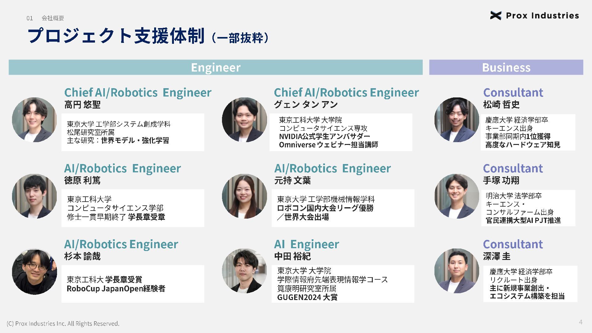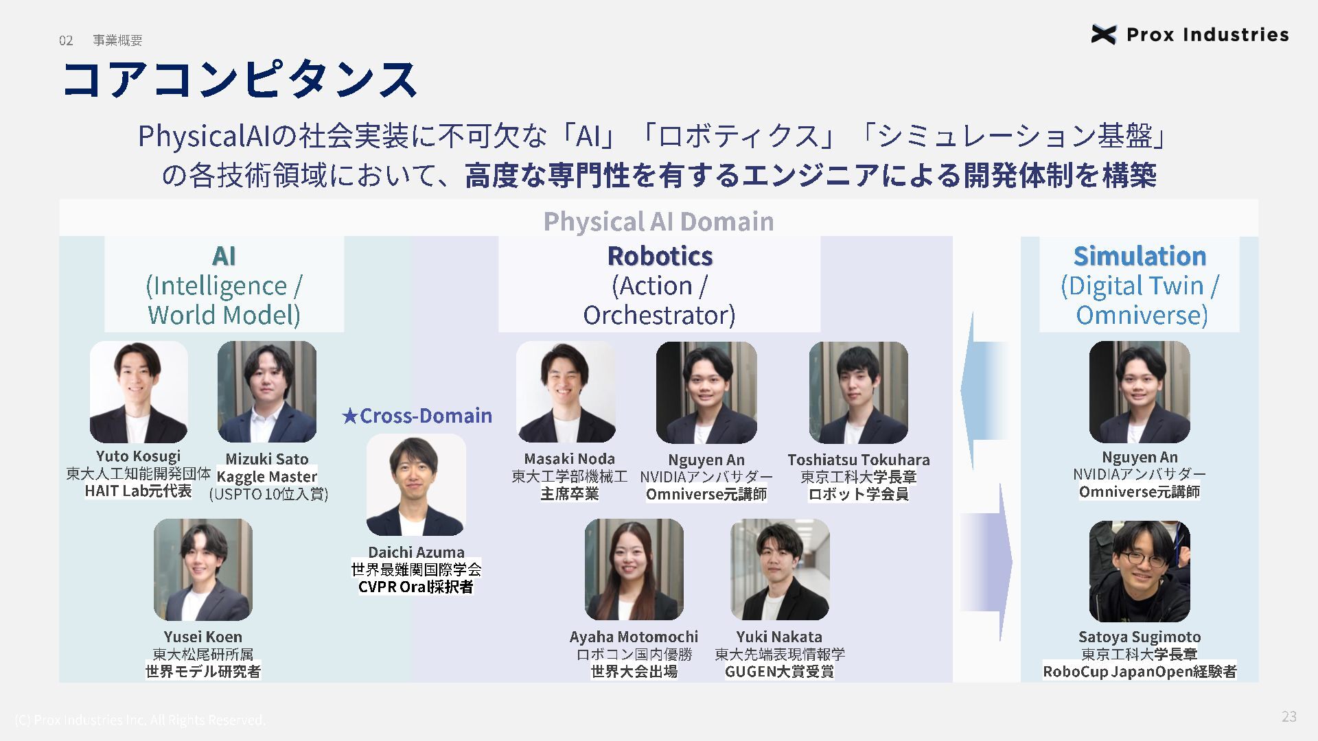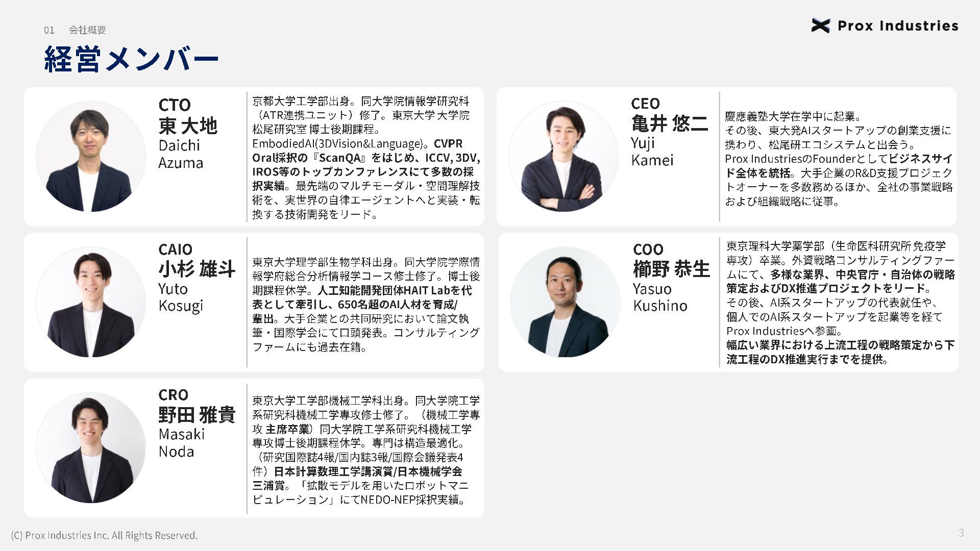 経営メンバー (C) Prox Industries Inc. All Rights Reserved. CEO 亀井 悠二 Yuji Kamei 慶應義塾大学在学中に起業。 その後、東大発 AIスタートアップの創業支援に 携わり、松尾研エコシステムと出会う。 Prox Industries のFounder として ビジネスサイ ド全体を統括 。大手企業の R&D支援プロジェク トオーナーを多数務めるほか、全社の事業戦略 および組織戦略に従事。 CAIO 小杉 雄斗 Yuto Kosugi 東京大学理学部生物学科出身。同大学院学際情 報学府総合分析情報学コース修士修了。博士後 期課程休学。 人工知能開発団体HAIT Lab を代 表として牽引し、 650 名超のAI人材を育成/ 輩出。 大手企業との共同研究において論文執 筆・国際学会にて口頭発表。 コンサルティング ファ ームにも過去在籍。 CTO 東 大地 Daichi Azuma 京都大学工学部出身。同大学院情報学研究科 ( ATR連携ユニット)修了。東京大学 大学院 松尾研究室 博士後期課程。 EmbodiedAI (3DVision&Language )。 CVPR Oral 採択の『 ScanQA 』 をはじめ、 ICCV, 3DV, IROS 等のトップカンファレンスにて多数の採 択実績。最先端のマルチモーダル・空間理解技 術を、実世界の自律エージェントへと実装・転 換する技術開発をリード。 COO 櫛野 恭生 Yasuo Kushino 東京理科大学薬学部(生命医科研究所 免疫学 専攻)卒業。外資戦略コンサルティングファー ムにて、 多様な業界、中央官庁・自治体の戦略 策定および DX推進プロジェクトをリード 。 その後、 AI系スタートアップの代表就任や、 個人でのAI系スタートアップを起業等を経て Prox Industries へ参画。 幅広い業界における上流工程の戦略策定から下 流工程のDX推進実行までを提供 。 CRO 野田 雅貴 Masaki Noda 東京大学工学部機械工学科出身。同大学院工学 系研究科機械工学専攻修士修了。(機械工学専 攻 主席卒業)同大学院工学系研究科機械工学 専攻博士後期課程休学。専門は構造最適化。 (研究国際誌 4報/国内誌3報/国際会議発表4 件) 日本計算数理工学講演賞/日本機械学会 三浦賞。「拡散モデルを用いたロボットマニ ピュレーション」にて NEDO -NEP採択実績。