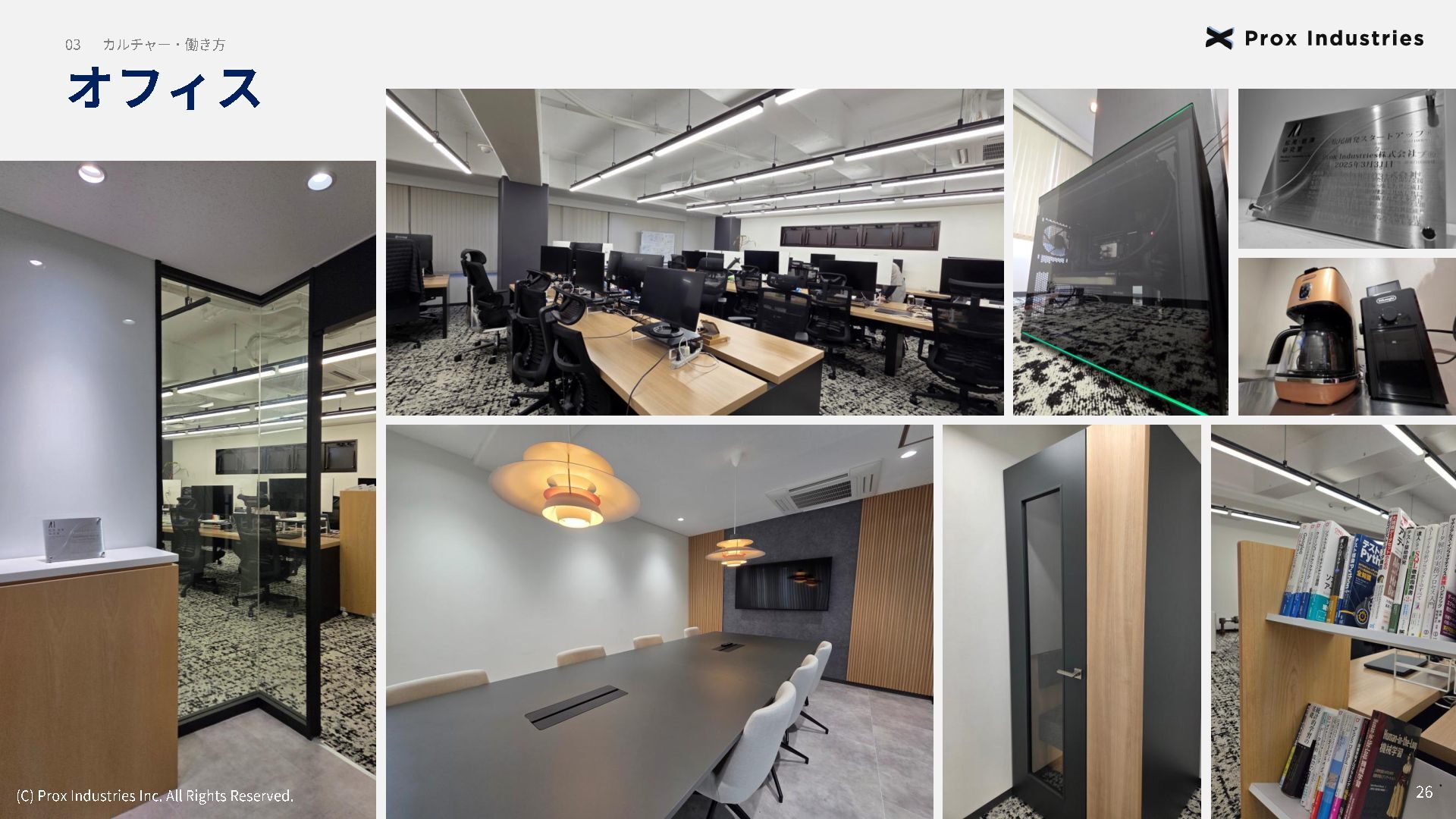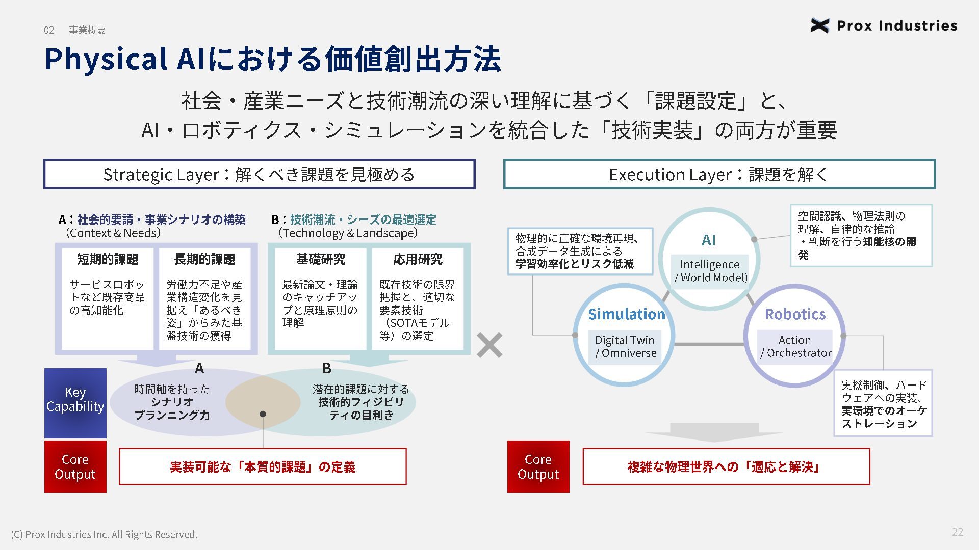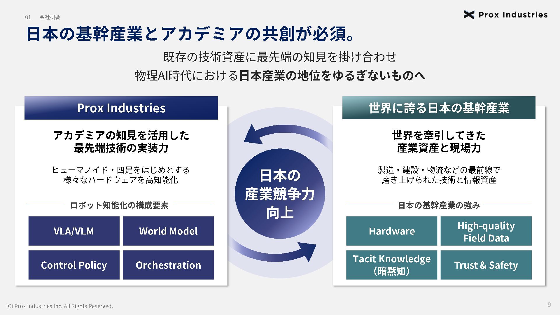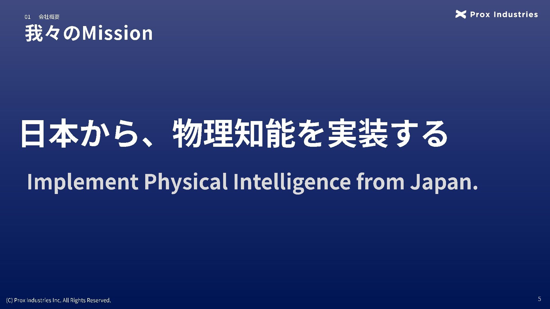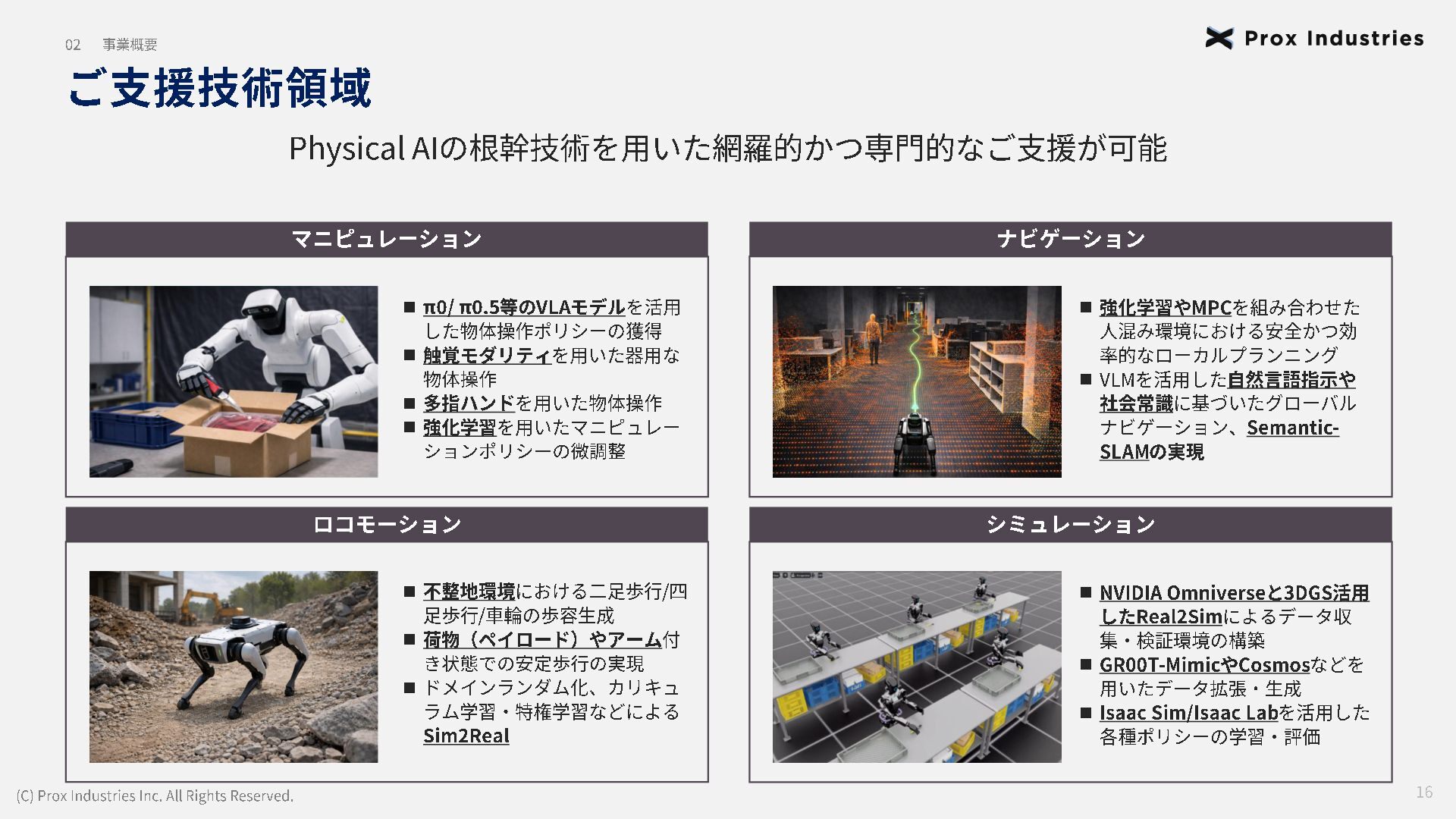 経営メンバー (C) Prox Industries Inc. All Rights Reserved. CEO 亀井 悠二 Yuji Kamei 慶應義塾大学在学中に起業。 その後、東大発 AIスタートアップの創業支援に 携わり、松尾研エコシステムと出会う。 Prox Industries のFounder として ビジネスサイ ド全体を統括 。大手企業の R&D支援プロジェク トオーナーを多数務めるほか、全社の事業戦略 および組織戦略に従事。 CAIO 小杉 雄斗 Yuto Kosugi 東京大学理学部生物学科出身。同大学院学際情 報学府総合分析情報学コース修士修了。博士後 期課程休学。 人工知能開発団体HAIT Lab を代 表として牽引し、 650 名超のAI人材を育成/ 輩出。 大手企業との共同研究において論文執 筆・国際学会にて口頭発表。 コンサルティング ファ ームにも過去在籍。 CTO 東 大地 Daichi Azuma 京都大学工学部出身。同大学院情報学研究科 ( ATR連携ユニット)修了。東京大学 大学院 松尾研究室 博士後期課程。 EmbodiedAI (3DVision&Language )。 CVPR Oral 採択の『 ScanQA 』 をはじめ、 ICCV, 3DV, IROS 等のトップカンファレンスにて多数の採 択実績。最先端のマルチモーダル・空間理解技 術を、実世界の自律エージェントへと実装・転 換する技術開発をリード。 COO 櫛野 恭生 Yasuo Kushino 東京理科大学薬学部(生命医科研究所 免疫学 専攻)卒業。外資戦略コンサルティングファー ムにて、 多様な業界、中央官庁・自治体の戦略 策定および DX推進プロジェクトをリード 。 その後、 AI系スタートアップの代表就任や、 個人でのAI系スタートアップを起業等を経て Prox Industries へ参画。 幅広い業界における上流工程の戦略策定から下 流工程のDX推進実行までを提供 。 CRO 野田 雅貴 Masaki Noda 東京大学工学部機械工学科出身。同大学院工学 系研究科機械工学専攻修士修了。(機械工学専 攻 主席卒業)同大学院工学系研究科機械工学 専攻博士後期課程休学。専門は構造最適化。 (研究国際誌 4報/国内誌3報/国際会議発表4 件) 日本計算数理工学講演賞/日本機械学会 三浦賞。「拡散モデルを用いたロボットマニ ピュレーション」にて NEDO -NEP採択実績。