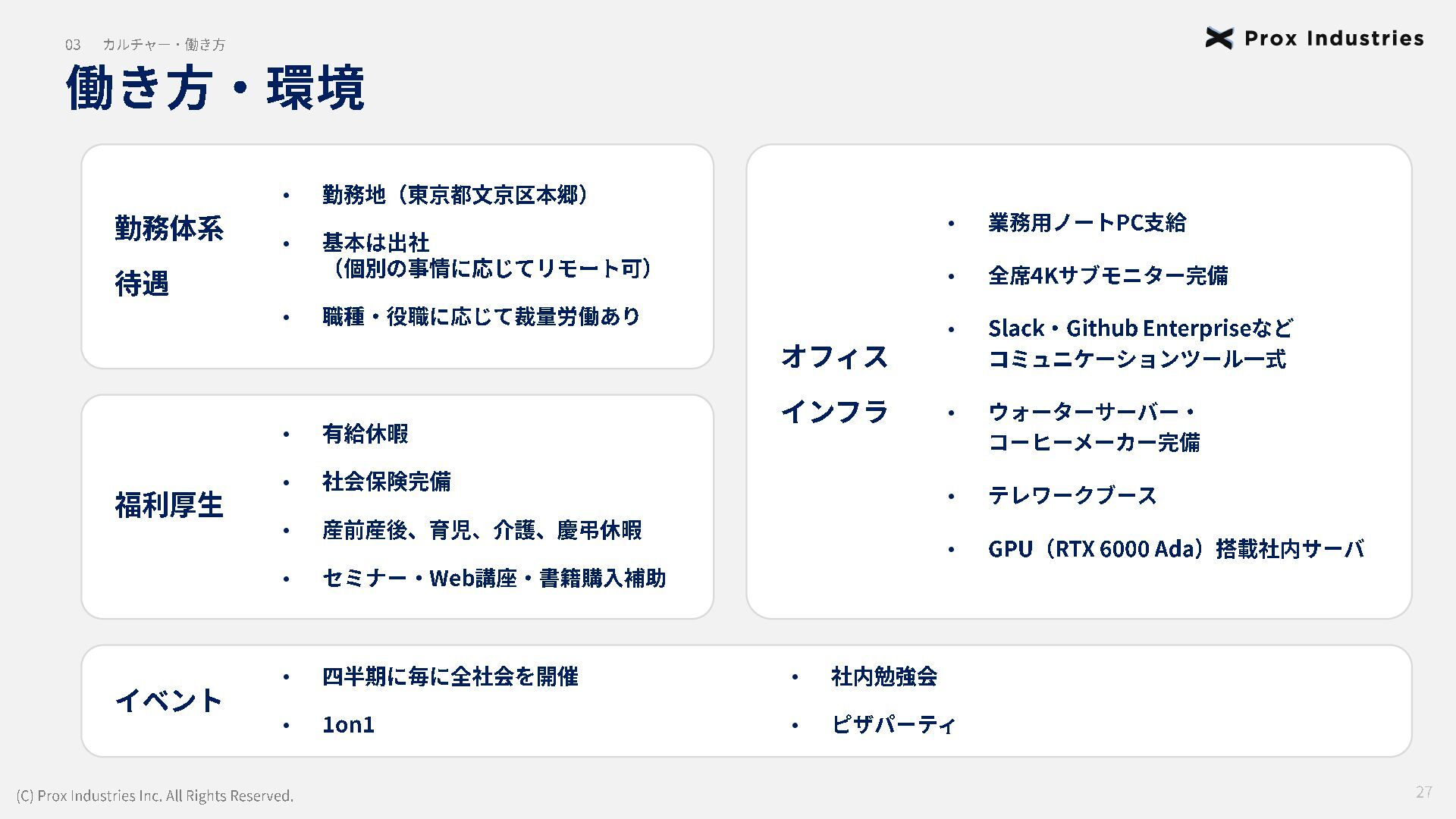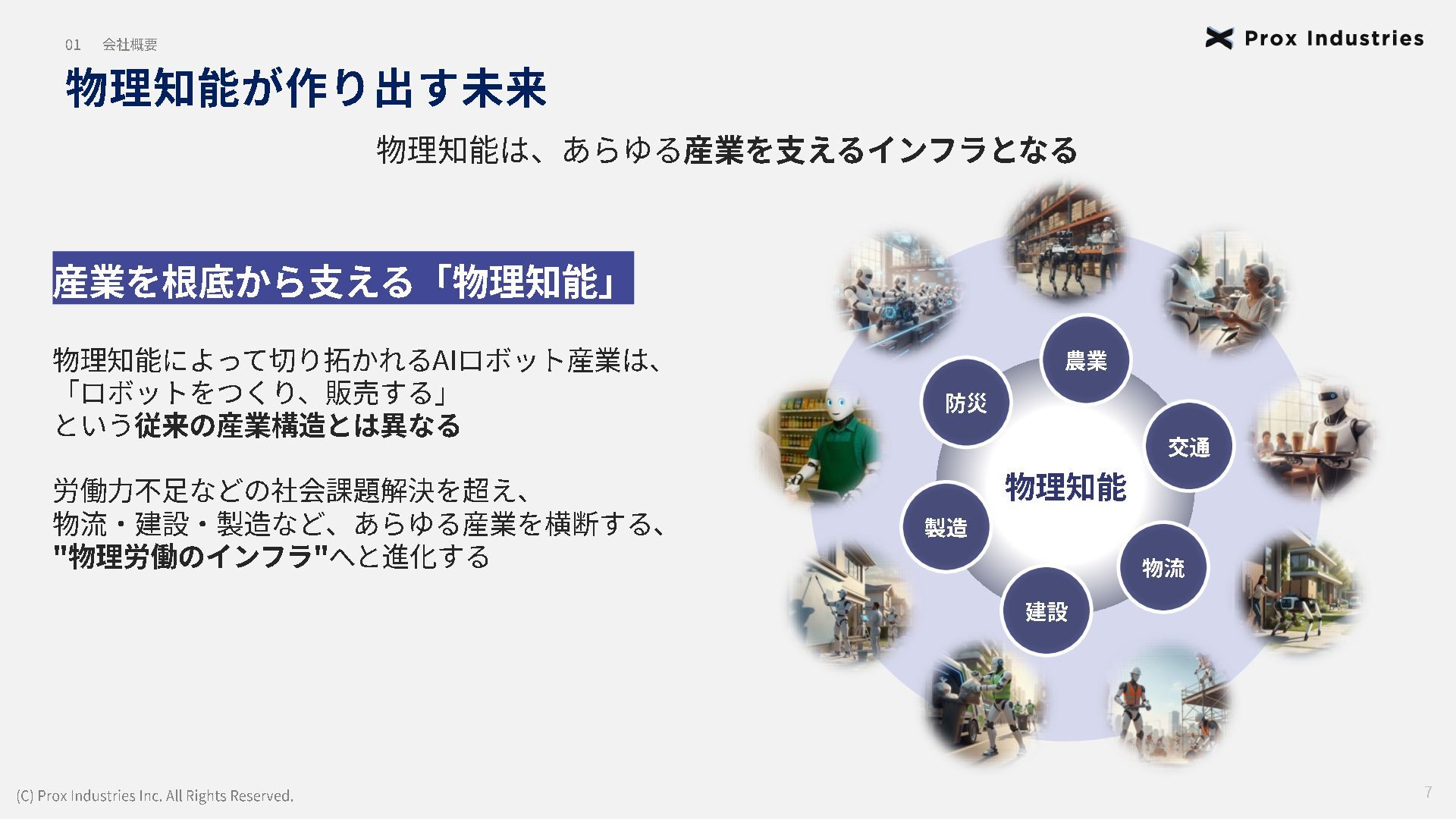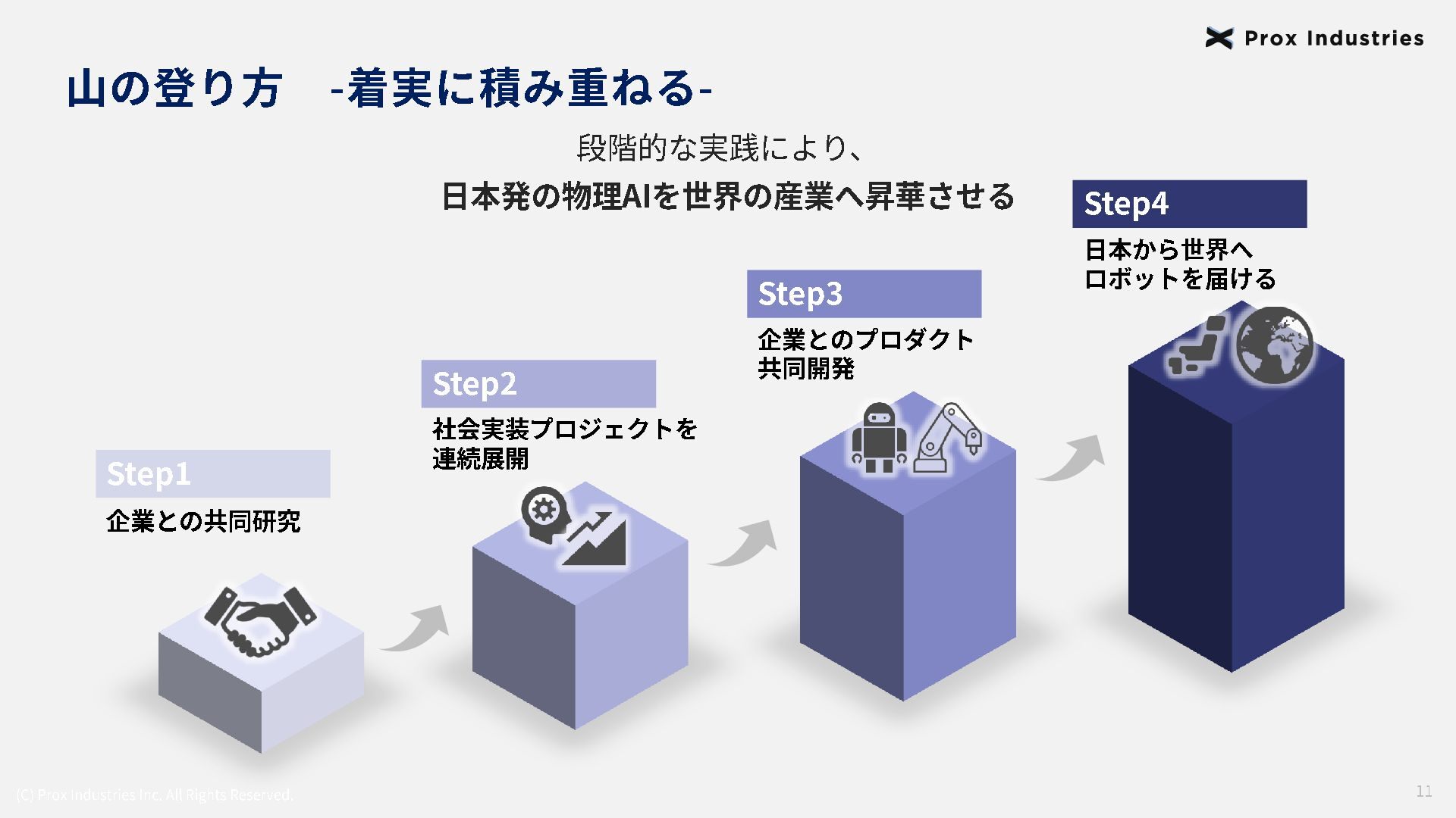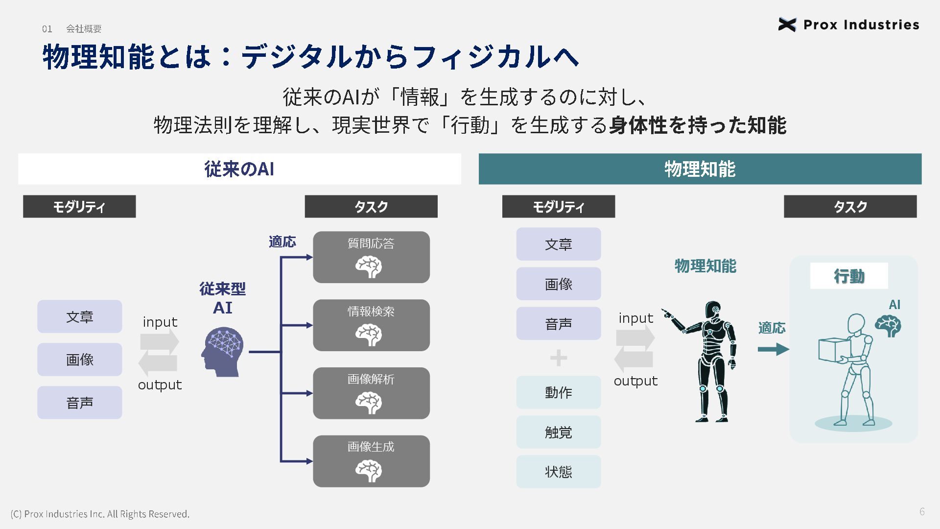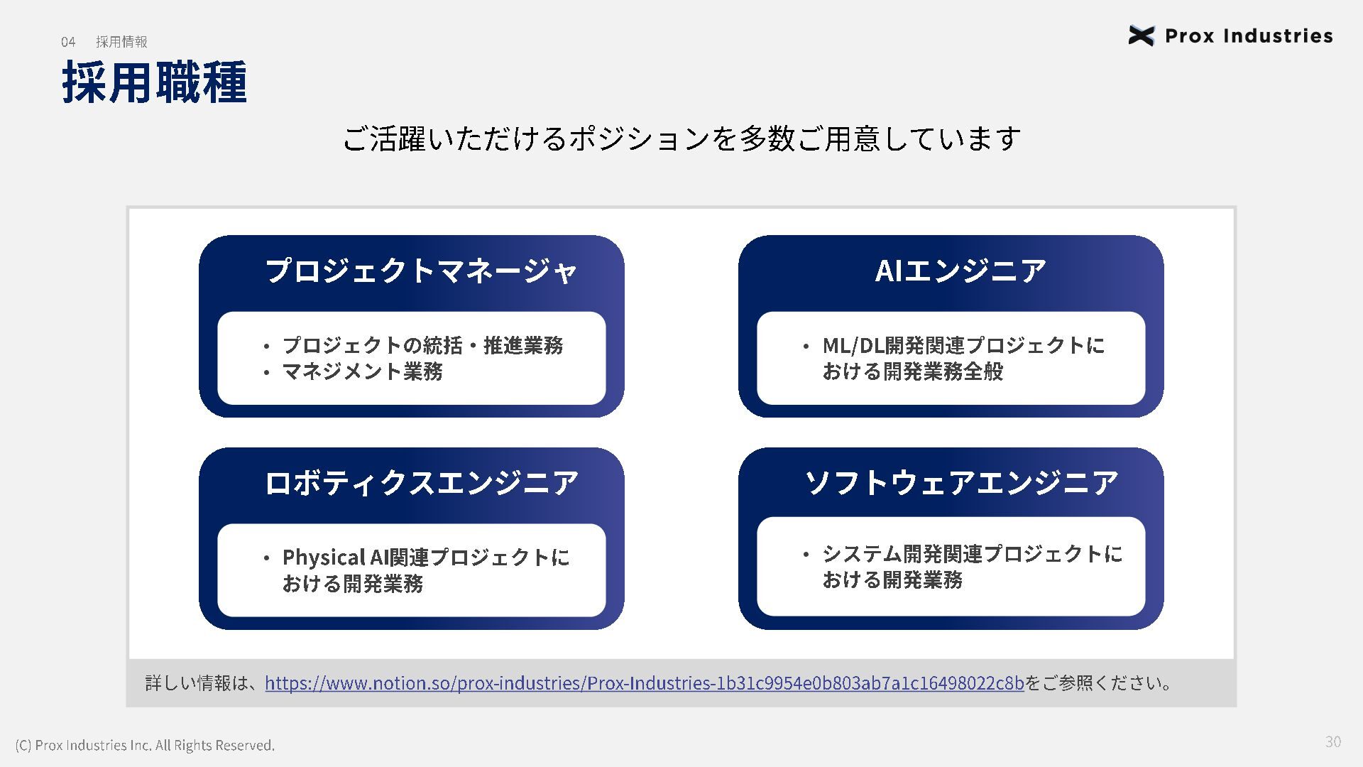 経営メンバー (C) Prox Industries Inc. All Rights Reserved. CEO 亀井 悠二 Yuji Kamei 慶應義塾大学在学中に起業。 その後、東大発 AIスタートアップの創業支援に 携わり、松尾研エコシステムと出会う。 Prox Industries のFounder として ビジネスサイ ド全体を統括 。大手企業の R&D支援プロジェク トオーナーを多数務めるほか、全社の事業戦略 および組織戦略に従事。 CAIO 小杉 雄斗 Yuto Kosugi 東京大学理学部生物学科出身。同大学院学際情 報学府総合分析情報学コース修士修了。博士後 期課程休学。 人工知能開発団体HAIT Lab を代 表として牽引し、 650 名超のAI人材を育成/ 輩出。 大手企業との共同研究において論文執 筆・国際学会にて口頭発表。 コンサルティング ファ ームにも過去在籍。 CTO 東 大地 Daichi Azuma 京都大学工学部出身。同大学院情報学研究科 ( ATR連携ユニット)修了。東京大学 大学院 松尾研究室 博士後期課程。 EmbodiedAI (3DVision&Language )。 CVPR Oral 採択の『 ScanQA 』 をはじめ、 ICCV, 3DV, IROS 等のトップカンファレンスにて多数の採 択実績。最先端のマルチモーダル・空間理解技 術を、実世界の自律エージェントへと実装・転 換する技術開発をリード。 COO 櫛野 恭生 Yasuo Kushino 東京理科大学薬学部(生命医科研究所 免疫学 専攻)卒業。外資戦略コンサルティングファー ムにて、 多様な業界、中央官庁・自治体の戦略 策定および DX推進プロジェクトをリード 。 その後、 AI系スタートアップの代表就任や、 個人でのAI系スタートアップを起業等を経て Prox Industries へ参画。 幅広い業界における上流工程の戦略策定から下 流工程のDX推進実行までを提供 。 CRO 野田 雅貴 Masaki Noda 東京大学工学部機械工学科出身。同大学院工学 系研究科機械工学専攻修士修了。(機械工学専 攻 主席卒業)同大学院工学系研究科機械工学 専攻博士後期課程休学。専門は構造最適化。 (研究国際誌 4報/国内誌3報/国際会議発表4 件) 日本計算数理工学講演賞/日本機械学会 三浦賞。「拡散モデルを用いたロボットマニ ピュレーション」にて NEDO -NEP採択実績。