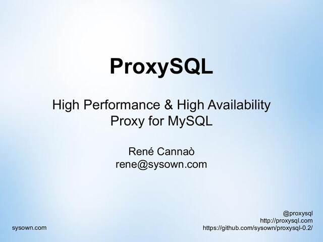 This presentation was given by Rene Cannao at Percona Live Amsterdam 2015 as ProxySQL introduction.