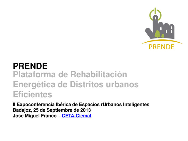 Presentación del proyecto PRENDE en la II Expoconferencia Ibérica de Espacios rUrbanos Inteligentes (SmartrUrban), organizadas por ITAE y celebradas en Badajoz los pasados 24 y 25 de Septiembre de 2013
