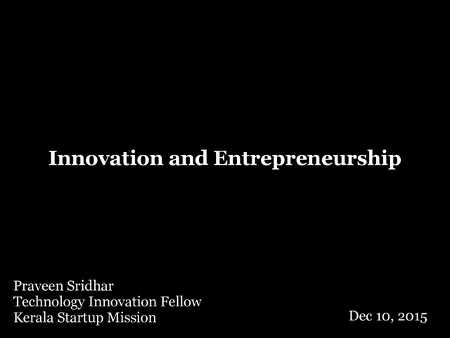 Innovation and Entrepreneurship Praveen Sridhar Technology Innovation Fellow Kerala Startup
