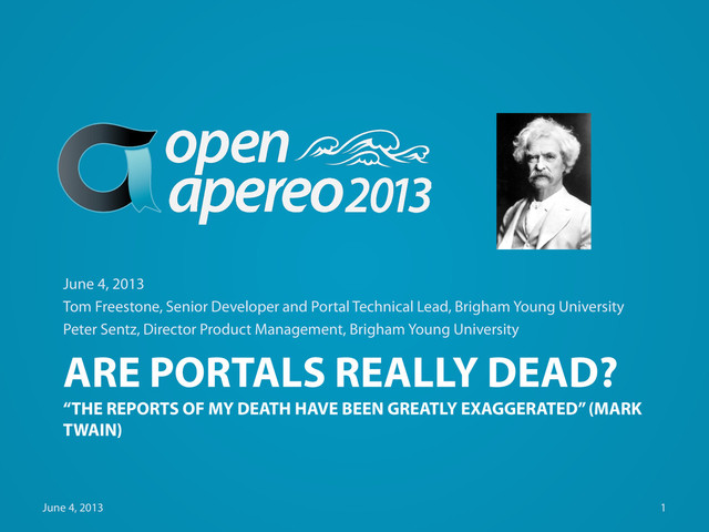 BEEN GREATLY EXAGGERATED” (MARK TWAIN) June 4, 2013 Tom Freestone, Senior Developer and Portal Technical Lead, Brigham Young University Peter Sentz, Director Product Management, Brigham Young University June 4, 2013 1