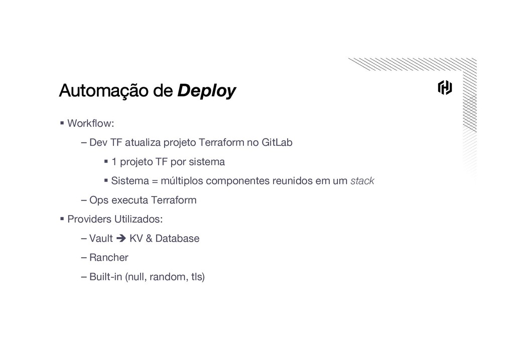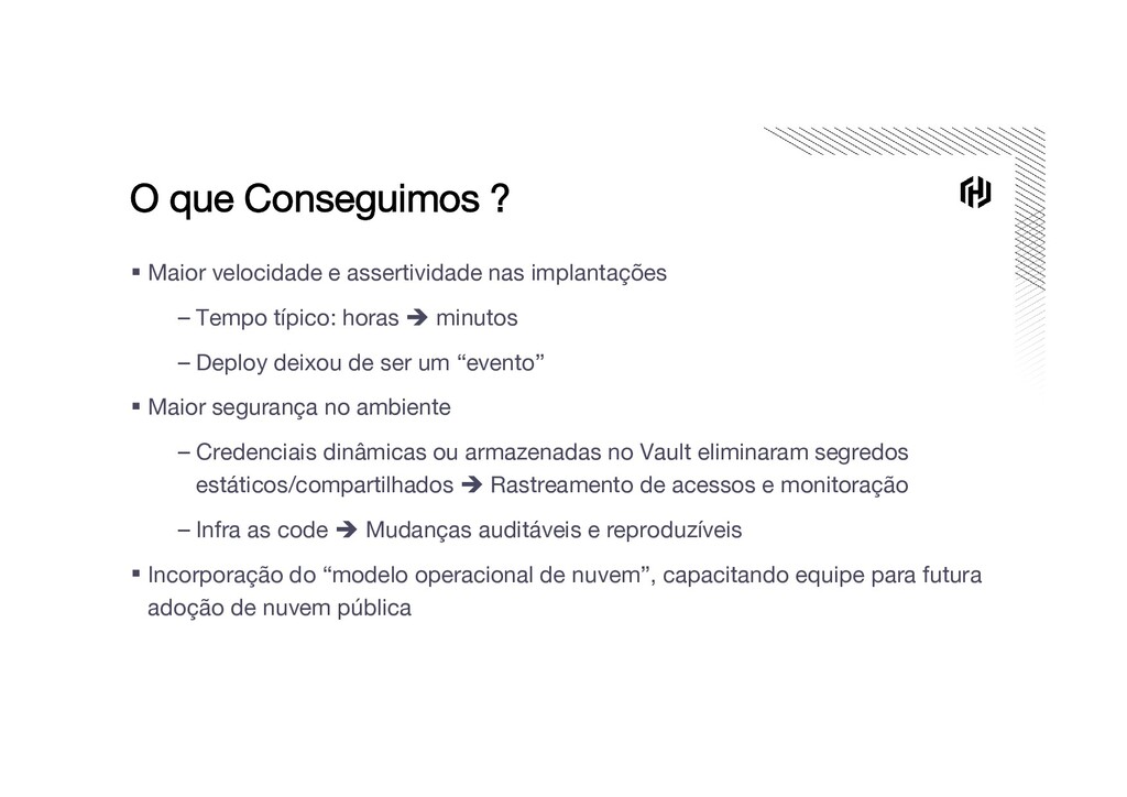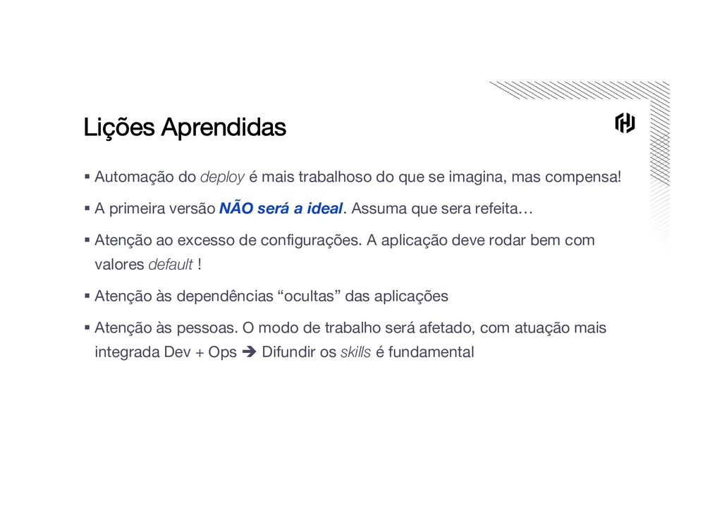 que se imagina, mas compensa! ▪ A primeira versão NÃO será a ideal. Assuma que sera refeita… ▪ Atenção ao excesso de configurações. A aplicação deve rodar bem com valores default ! ▪ Atenção às dependências “ocultas” das aplicações ▪ Atenção às pessoas. O modo de trabalho será afetado, com atuação mais integrada Dev + Ops Difundir os skills é fundamental