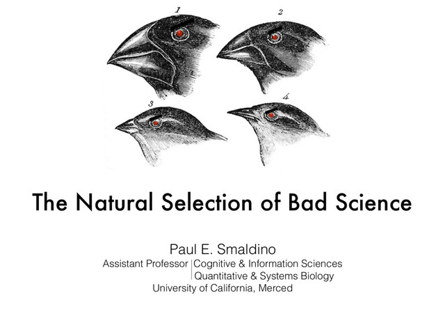 • Each lab has characteristic methodological power, Pr(+|T) • Increasing power also increases false positives, unless effort is exerted • Effort increases the time between results • Novel negative results tough to publish • Labs that publish more are more likely to have their methods “reproduced” in new labs • Two phases: (1) Science, (2) Evolution Smaldino PE & McElreath R (2016) The natural selection of bad science. Royal Society Open Science 3: 160384.