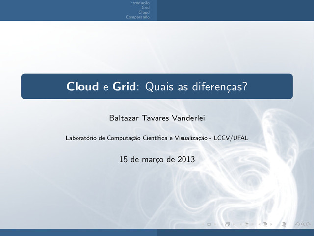padr˜ ao o Amazon Mais integrada a virtualiza¸ c˜ ao Voltado a industria, a venda de servi¸ co, de apenas uma organiza¸ c˜ ao Come¸ cou pensando em IaaS, pode suportar PaaS e SaaS Emgloba grid, por ser muito generico Grid Padr˜ oes bem mais definidos, por isso subconjunto de cloud Menos integrado a virtualiza¸ c˜ ao, mas presente Mais de origem academica, a gerenciar recursos compartilhados, multi-institucional Come¸ cou pensando em PaaS e SaaS, pode suportar IaaS