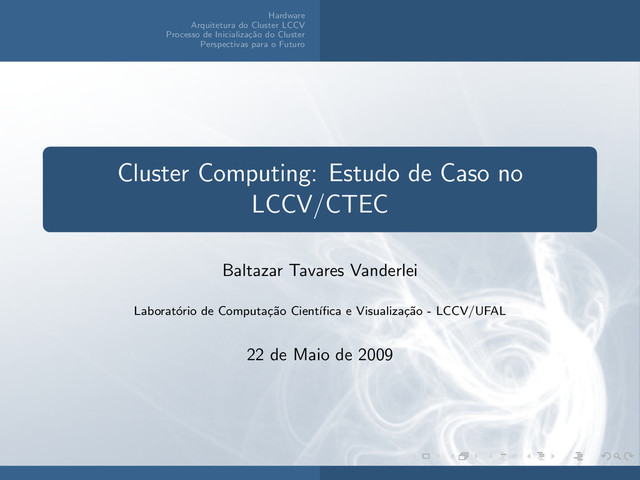 do Cluster Perspectivas para o Futuro Cluster Computing: Estudo de Caso no LCCV/CTEC Baltazar Tavares Vanderlei Laborat´ orio de Computa¸ c˜ ao Cient´ ıfica e Visualiza¸ c˜ ao - LCCV/UFAL 22 de Maio de 2009