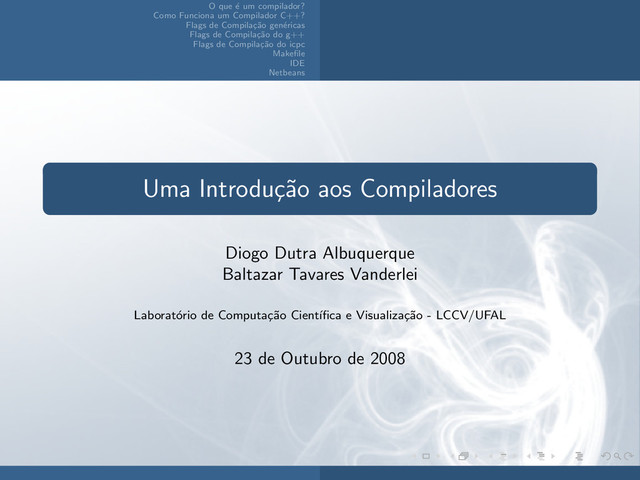 C++? Flags de Compila¸ c˜ ao gen´ ericas Flags de Compila¸ c˜ ao do g++ Flags de Compila¸ c˜ ao do icpc Makefile IDE Netbeans Uma Introdu¸ c˜ ao aos Compiladores Diogo Dutra Albuquerque Baltazar Tavares Vanderlei Laborat´ orio de Computa¸ c˜ ao Cient´ ıfica e Visualiza¸ c˜ ao - LCCV/UFAL 23 de Outubro de 2008