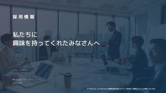 私たちパタンナーは、セルフデータマネジメントという新しい文化を社会に根づかせるために、セルフデータマネジメント「タヅナ」を開発・提供しています。 この資料では、プロダクトの概要、解決している課題、開発思想、チームのカルチャー、そしてこれからの仲間について紹介しています。