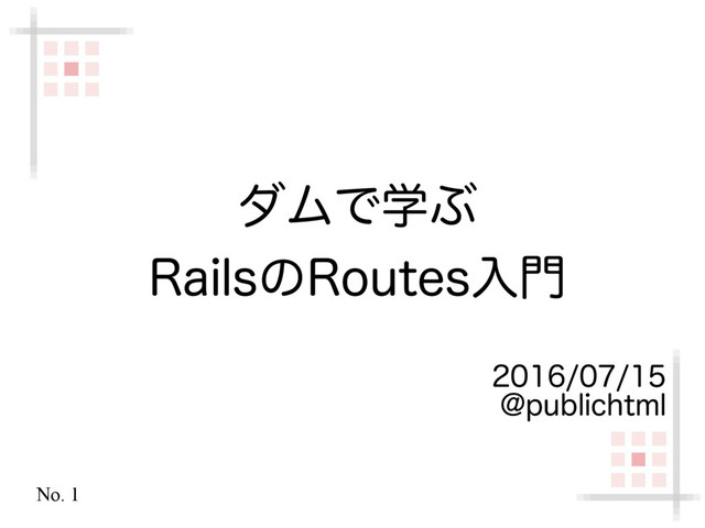 post 'dams', to: 'dams#create' get 'dams/new', to: 'dams#new', as: :new_dam get 'dams/:id/edit', to: 'dams#edit', as: :edit_dam get 'dams/:id', to: 'dams#show', as: :dam match 'dams/:id', to: 'dams#update', via: [:patch, :put] delete 'dams/:id', to: 'dams#destroy' resources :dams コントローラ名 (=リソース名の 複数形) リソースの存在を明示的に示せる