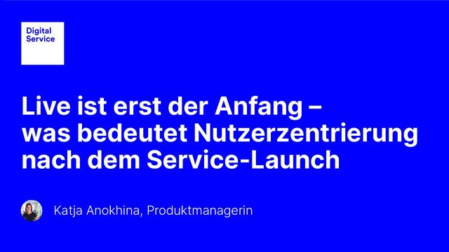 Folien des Impulsvortrags ›Live ist erst der Anfang – was bedeutet Nutzerzentrierung nach dem Service-Launch‹, gehalten von Produktmanagerin Katja Anokhina vom DigitalServices des Bundes beim Public Service Lab Day 2022 am 14. Oktober in Freiburg im Breisgau.