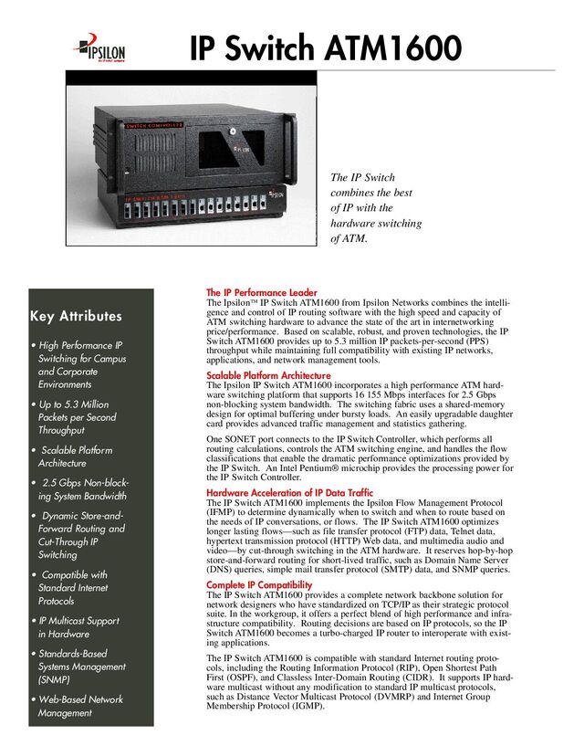 that offers the performance and quality of service of ATM switching without the management complexity of learning many new untested and complex ATM protocols. An IP Switch is an IP node from a management perspective and supports existing IPnetwork tools and techniques. IP Switches inte- grate naturally into the network views provided by SNMP-compatible platforms, including HP O p e n Vi e w ® , SunNet™ Manager, IBM NetView® 6000, Microsoft Windows™, and Windows NT. In addition, the IP S w i t c h ATM1600 supports Telnet and text-based commands, including ping, traceroute, and netstat. Web-Based Network Management For platform-independent installation, configuration, and management, each IP Switch ATM1600 implements the Ipsilon Network Voyager Web server. Using Netscape Navigator or a similar client Web browser, network managers can access the Network Voyager from any remote location to check the current state of the IP Switch, refer to the user documentation, download new software versions, or link to Ipsilon customer service. The forms-based Network Voyager user interface simplifies configuration of interfaces and protocols, allowing managers to step through the definition of port parameters, routing protocols, static and aggregate routes, and DVMRP tunnels. Device monitoring includes port-by-port views, cumulative statistics on forwarded and discarded packets, and an event log. Software Upgradability The IP Switch ATM1600 supports software upgrades through Web and FTP access. User name and password authentication secure configuration data. IP SWITCH ATM1600 TECHNICAL SPECIFICATIONS Performance/Capacity Switching Capacity Up to 5.3 million IP PPS System Bandwidth 2.5 Gbps non-blocking Total Cell Buffering 32,000 cells with shared memory Total VCs Supported 32,000 Interfaces Number Up to 16 ports (one reserved for IP Switch Controller) Interface Types 155 Mbps SONET STS3c Multimode Fiber 155 Mbps SONET STS3c Category 5 UTP Frame Structure ATM Forum UNI 3.1 Physical Layer Protocol Support Standard IP Functions and Major Internet Engineering Task Force (IETF) Standards IPv4 Forwarding Unicast and Multicast IPv4 Routing Protocols RIP, OSPF, DVMRP, CIDR IPv4 Router Functionality Router Discovery IGMP, ICMP, ARP Bootp Relay Agent IP Switching Protocols Ipsilon Flow Management Protocol (IFMP) General Switch Management Protocol (GSMP) Network Management SNMP MIB2 HTTP via Ipsilon Network Voyager Ipsilon Network Voyager Comprehensive Device Installation, Configuration, Management Client Browser (Required) Netscape Navigator 1.1 or later recommended Configuration Capabilities Routing protocols per port Global routing parameters Static and aggregate routes DVMRP Tunnels Monitoring Physical view Port-by-port configuration and status Cell and packet counts—input, output, and discarded per port Security Password protection Physical and Environmental IP Switch ATM1600 (19” Rack Mountable) Dimensions H: 3.5 in. W: 17.50 in. D: 18.00 in. (H: 8.9 cm W: 44.4 cm D: 45.7 cm) Weight 20 lbs. (9.1 kg) fully loaded Temperature and Humidity Operating Temp: 5 to 40 C up to 10,000 ft Operating Humidity: 10 to 90% RH Power Supply Nominal 120/240 VAC @ 60/50 Hz., 3.0/1.5 amps IP Switch Controller (19” Rack Mountable) Dimensions H: 7 in. W: 19 in. D: 17.8 in. (H: 17.7 cm W: 48.2 cm D: 45.2 cm) Weight 41.8 lbs. (19 kg) without interface cards Temperature and Humidity Operating Temp: 5 to 40 C up to 10,000 ft Operating Humidity: 10 to 90% RH Power Supply Nominal 90 to 132, 180 to 264 VAC @ 60/50 Hz. Regulatory Compliance FCC A E55022 (CISPR22) A UL1950 EN60950 CSA 22.2 IEC950 © Ipsilon Networks 1996. Ipsilon is a trademark of Ipsilon Networks, Inc. 3/96 Ipsilon Networks Inc. 2191 East Bayshore Road, Suite 100 Palo Alto, California 94303 www.ipsilon.com tel_415.846.4600 fax_415.855.1414